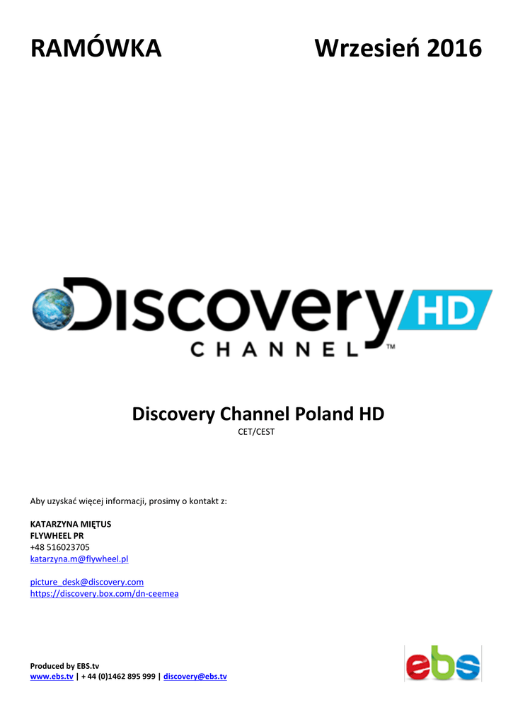 RAMÓWKA Wrzesień 2016 Discovery Channel Poland HD CET/CEST Aby uzyskać więcej informacji, prosimy o kontakt z: KATARZYNA MIĘTUS FLYWHEEL PR +48 516023705 [email protected] [email protected] https://discovery.box.com/dn-ceemea Produced by EBS.tv www.ebs.tv | + 44 (0)1462 895 999 | [email protected] Wrzesień 2016 RAMÓWKA Czwartek 1 września 2016 06.00 Domy na aukcji: Wymiatacze (Property Wars: Wipe Out) Już pierwsza nieruchomość przykuwa uwagę Scotta, ale okazuje się, że jego rywal Doug nie odda jej bez walki. Jeden z uczestników aukcji trafia do szpitala. 06.30 Domy na aukcji: Zagadkowy nabytek (Property Wars: Puzzling Addition) Kupcy odwiedzają mały dom. Eda od razu ogarnia nostalgiczny nastrój, ale Doug traktuje tę nieruchomość jako źródło łatwych pieniędzy. 07.00 Najniebezpieczniejszy zawód świata: Nerwy na morzu (Deadliest Catch (Season 7): Proving Grounds) Atmosfera na kutrach na Morzu Beringa robi się coraz bardziej napięta. Puste skrzynki na kraby sprawiają, że rybacy nie potrafią trzymać nerwów na wodzy. 08.00 Syberyjskie drogi śmierci (Hell Road Russia) Historia drogi, na której tysiące więźniów gułagów, poszukiwaczy złota, kierowców i lokalnych mieszkańców straciło życie, stawiając czoła bezwzględnej Matce Naturze. 09.00 Gorączka złota: Złoty chłopak (Gold Rush (Season 5): Golden Boy) Parker kłóci się ze swoją ekipą o prowadzenie prac pod osłoną nocy. Tony niszczy stalową ramę swojej pogłębiarki. Todd, Jack i Thurber zabierają się do pierwszego wypłukiwania. 10.00 Operacja: lot: Odcinek 6 (Operation: Flight: Episode 6) Polskie Linie Lotnicze LOT od kulis. Przyjrzyjmy się, jak na co dzień działają linie lotnicze, które przewożą prawie pięć milionów pasażerów rocznie. 11.00 Stacja Alaska: Złowrogi szlak (Railroad Alaska: Disaster Trail) Towarzyszymy ekipie inżynierów, mechaników i maszynistów, którzy robią wszystko, aby w czasie ostrej zimy zachować przejezdność liczącego 800 kilometrów odcinka kolei na Alasce. 12.00 Nagi instynkt przetrwania: Król szczurów (Naked And Afraid (Season 2): Lord of the Rats) Pracoholiczka i samotnik jednoczą siły i próbują przeżyć trzy tygodnie w Tajlandii. Walczą z małpami i szczurami o jedzenie. Czy opracują wspólną strategię przetrwania? 2 Produced by EBS.tv www.ebs.tv | + 44 (0)1462 895 999 | [email protected] 13.00 Klan z Alaski: Wataha (Alaskan Bush People (Season 3): Growing The Wolfpack) Spotkania z rodziną Brownów i ich siódemką dzieci, którzy żyją w dziczy na Alasce bez prądu i udogodnień współczesnej cywilizacji. Aby przetrwać, muszą zjednoczyć siły. 14.00 Ekstremalna Alaska: Trudna droga do domu (Alaska: The Last Frontier (Season 5): Hard Road Home) Pogoda i okoliczności nie oszczędzają Kilcherów. Sami też bywają dla siebie bezwzględni, jednak mimo to dalej pracują wspólnie jako rodzina, dbając o dziedzictwo swojej osady. 15.00 Auto - reaktywacja: Motocyklowy zamęt/Pakowanie packarda, część 1 (Fast N' Loud (Season 3): Motorcycle Mayhem/Packing a Packard for Pebble - Part 1) Ekipa GMG remontuje znalezione w garażu zardzewiałe gruchoty. Czy mechanikom uda się przywrócić tym samochodom dawny blask przed kolejną aukcją? Wrzesień 2016 RAMÓWKA 16.00 Auto - reaktywacja: Motocyklowy zamęt/Pakowanie packarda, część 2 (Fast N' Loud (Season 3): Motorcycle Mayhem/Packing a Packard for Pebble - Part II) Ekipa GMG remontuje znalezione w garażu zardzewiałe gruchoty. Czy mechanikom uda się przywrócić tym samochodom dawny blask przed kolejną aukcją? 17.00 Łowcy okazji: Odcinek 17 (Auction Hunters (Season 3): Episode 17) Na aukcji w Panorama City Ton i Allen muszą stawić czoła dobrze znanemu przeciwnikowi. Licytują starą szwedzką strzelbę i wędkę do piłek golfowych. Ile warte są te dwie rzeczy? 17.30 Aukcja w ciemno: Odcinek 1 (Storage Hunters (Season 2): Episode 1) Zapraszamy na spotkanie z małżeństwem Brandonem i Lori Bernier, którzy żyją z zysków ze sprzedaży rzeczy wylicytowanych podczas aukcji w całej Ameryce. 18.00 Polscy Truckersi: Odcinek 5 (Polish Truckers: Episode 5) Od wybrzeża Atlantyku po Syberię, od Portugalii po Ural polskich kierowców wielkich ciężarówek można spotkać wszędzie. To mistrzowie w transporcie ładunków na długie dystanse! 19.00 Gorączka złota: Złoty chłopak (Gold Rush (Season 5): Golden Boy) Parker kłóci się ze swoją ekipą o prowadzenie prac pod osłoną nocy. Tony niszczy stalową ramę swojej pogłębiarki. Todd, Jack i Thurber zabierają się do pierwszego wypłukiwania. 20.00 Aukcja w ciemno: Odcinek 19 (Storage Hunters (Season 3): Episode 19) Spotkanie z małżeństwem Brandona i Lori Bernierów, którzy żyją ze sprzedaży rzeczy, wylicytowanych podczas aukcji w całej Ameryce. Czy tym razem trafią na prawdziwy skarb? 20.30 Wojny magazynowe: Kanada: Czas na imprezę! (Storage Wars Canada (Season 2): All Aboard the Party Train!) Napięcie wśród kupców sięga zenitu! Ekipy handlarzy muszą poradzić sobie ze stresem podczas aukcyjnych starć i podjąć ważne decyzje w sprawach biznesowych. 3 Produced by EBS.tv www.ebs.tv | + 44 (0)1462 895 999 | [email protected] PREMIERA 21.00 Morze złota: Punkt krytyczny (Gold Divers (Season 5): Breaking Point) Brak złota doprowadza wszystkich do szaleństwa. Steve nie chce zabrać Shawna do Bluff — ojciec i syn wchodzą w ostry spór. Emily dostaje wiadomość, która może zmusić ją do powrotu. PREMIERA 22.00 Klan z Alaski: Strzały w ciemności (Alaskan Bush People (Season 3): Shots In The Dark) Tajemnicze strzały spowodowały wiele szkód na brzegu. Teraz wszyscy zachowują czujność. Uszkodzenia trzeba naprawić, ale brakuje rąk do pracy. 23.00 Przystanek Bieszczady: Odcinek 2 (Bieszczady Last Frontier: Episode 2) W Bieszczadach temperatury spadają do - 20 stopni Celsjusza. Mirek próbuje uruchomić swój traktor, a Fredrek i Stasio przygotowują się do sylwestra. Wrzesień