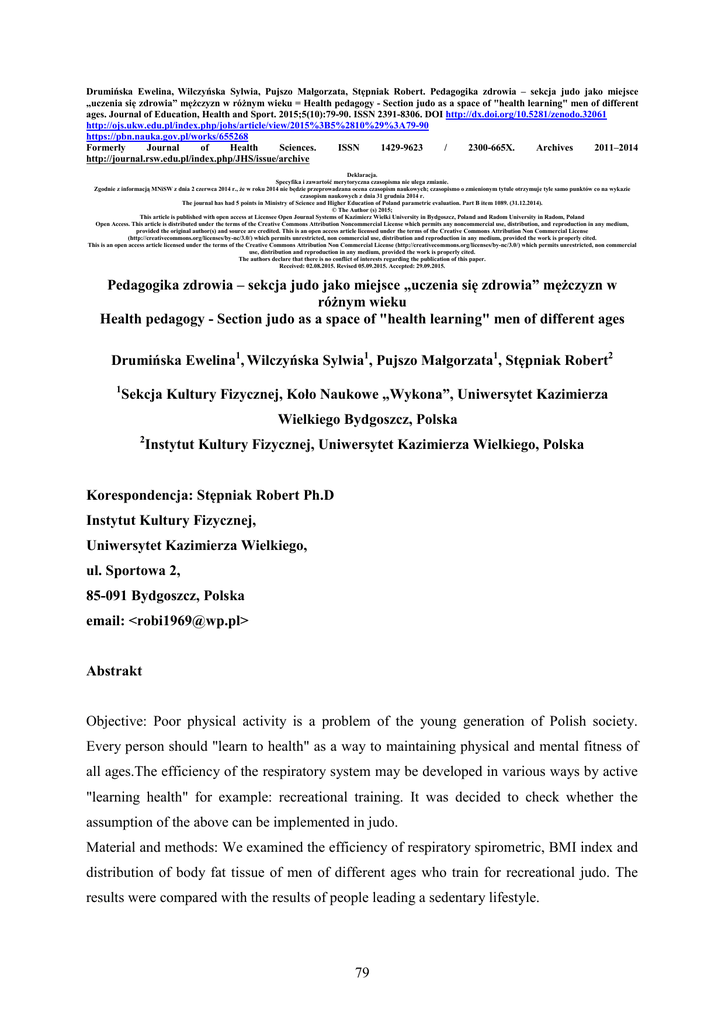Drumińska Ewelina, Wilczyńska Sylwia, Pujszo Małgorzata, Stępniak Robert. Pedagogika zdrowia – sekcja judo jako miejsce „uczenia się zdrowia” mężczyzn w różnym wieku = Health pedagogy - Section judo as a space of "health learning" men of different ages. Journal of Education, Health and Sport. 2015;5(10):79-90. ISSN 2391-8306. DOI http://dx.doi.org/10.5281/zenodo.32061 http://ojs.ukw.edu.pl/index.php/johs/article/view/2015%3B5%2810%29%3A79-90 https://pbn.nauka.gov.pl/works/655268 Formerly Journal of Health Sciences. ISSN 1429-9623 / 2300-665X. Archives 2011–2014 http://journal.rsw.edu.pl/index.php/JHS/issue/archive Deklaracja. Specyfika i zawartość merytoryczna czasopisma nie ulega zmianie. Zgodnie z informacją MNiSW z dnia 2 czerwca 2014 r., że w roku 2014 nie będzie przeprowadzana ocena czasopism naukowych; czasopismo o zmienionym tytule otrzymuje tyle samo punktów co na wykazie czasopism naukowych z dnia 31 grudnia 2014 r. The journal has had 5 points in Ministry of Science and Higher Education of Poland parametric evaluation. Part B item 1089. (31.12.2014). © The Author (s) 2015; This article is published with open access at Licensee Open Journal Systems of Kazimierz Wielki University in Bydgoszcz, Poland and Radom University in Radom, Poland Open Access. This article is distributed under the terms of the Creative Commons Attribution Noncommercial License which permits any noncommercial use, distribution, and reproduction in any medium, provided the original author(s) and source are credited. This is an open access article licensed under the terms of the Creative Commons Attribution Non Commercial License (http://creativecommons.org/licenses/by-nc/3.0/) which permits unrestricted, non commercial use, distribution and reproduction in any medium, provided the work is properly cited. This is an open access article licensed under the terms of the Creative Commons Attribution Non Commercial License (http://creativecommons.org/licenses/by-nc/3.0/) which permits unrestricted, non commercial use, distribution and reproduction in any medium, provided the work is properly cited. The authors declare that there is no conflict of interests regarding the publication of this paper. Received: 02.08.2015. Revised 05.09.2015. Accepted: 29.09.2015. Pedagogika zdrowia – sekcja judo jako miejsce „uczenia się zdrowia” mężczyzn w różnym wieku Health pedagogy - Section judo as a space of "health learning" men of different ages Drumińska Ewelina1, Wilczyńska Sylwia1, Pujszo Małgorzata1, Stępniak Robert2 1 Sekcja Kultury Fizycznej, Koło Naukowe „Wykona”, Uniwersytet Kazimierza Wielkiego Bydgoszcz, Polska 2 Instytut Kultury Fizycznej, Uniwersytet Kazimierza Wielkiego, Polska Korespondencja: Stępniak Robert Ph.D Instytut Kultury Fizycznej, Uniwersytet Kazimierza Wielkiego, ul. Sportowa 2, 85-091 Bydgoszcz, Polska email: <[email protected]> Abstrakt Objective: Poor physical activity is a problem of the young generation of Polish society. Every person should "learn to health" as a way to maintaining physical and mental fitness of all ages.The efficiency of the respiratory system may be developed in various ways by active "learning health" for example: recreational training. It was decided to check whether the assumption of the above can be implemented in judo. Material and methods: We examined the efficiency of respiratory spirometric, BMI index and distribution of body fat tissue of men of different ages who train for recreational judo. The results were compared with the results of people leading a sedentary lifestyle. 79 Results: Were observed a significant differences between the efficiency of the respiratory system and the distribution of body fat tissue between people recreationally practicing judo at every stage of ontogeny, and peoples leading a settled life. Conclusions: Recreation judo training meets the requirements to improve the functioning of the respiratory system of people of all ages. The physical activity in this way can be considered as one of method of "learning health" Streszczenie Cel: Niska aktywność fizyczna jest problemem młodego pokolenie polskiego społeczeństwa Każdy człowiek powinien „uczyć się zdrowia” w sposób rozumiany jako dbałość o zachowanie sprawności fizycznej i umysłowej w każdym wieku. Sprawność układu oddechowego może być podtrzymywana na wiele sposobów poprzez aktywne „uczenie się zdrowia” czyli rekreacyjny trening. Postanowiono sprawdzić czy założenie powyższe można realizować w sekcji judo. Materiał i metody: Sprawdzono sprawność układu oddechowego badaniem spirometrycznym mężczyzn w różnym wieku trenującym rekreacyjnie judo, a uzyskane wyniki porównano z wynikami osób prowadzących siedzący tryb życia . Dodatkowo sprawdzono wskaźnik BMI oraz zawartości tkanki tłuszczowej Wyniki: Wykazano istotne różnice pomiędzy sprawnością układu oddechowego i dystrybucją tkanki tłuszczowej osób trenujących rekreacyjnie judo na każdym etapie ontogenezy, a studentami prowadzącymi osiadły tryb życia. Wnioski: Rekreacyjny trening judo spełnia wymogi poprawy funkcjonowania układu oddechowego osób w każdym wieku. Utrzymywanie sprawności w ten sposób można więc uznać jako jedną z możliwości „uczenia się zdrowia” Słowa kluczowe: judo, sprawność fizyczna, spirometria. Keywords: judo, physical fitness, spirometry. 80 Wstęp Obniżanie się poziomu zdrowia człowieka poprzez spadek sprawności fizycznej organizmu jest rzeczą nieuchronną wchodzącą w skład naturalnych praw przyrody. Głównym czynnikiem jest starzenie się, co jest niestety zjawiskiem nieodwracalnym. Tempo naturalnego starzenia się organizmu człowieka jak i długość życia uwarunkowane są czynnikami genetycznymi, jak również rodzajem podejmowanej aktywności, dietą, stylem życia. Wpływ na proces starzenia ma także środowisko, w którym żyjemy, m.in. higiena. Procesowi temu ulegają, cho