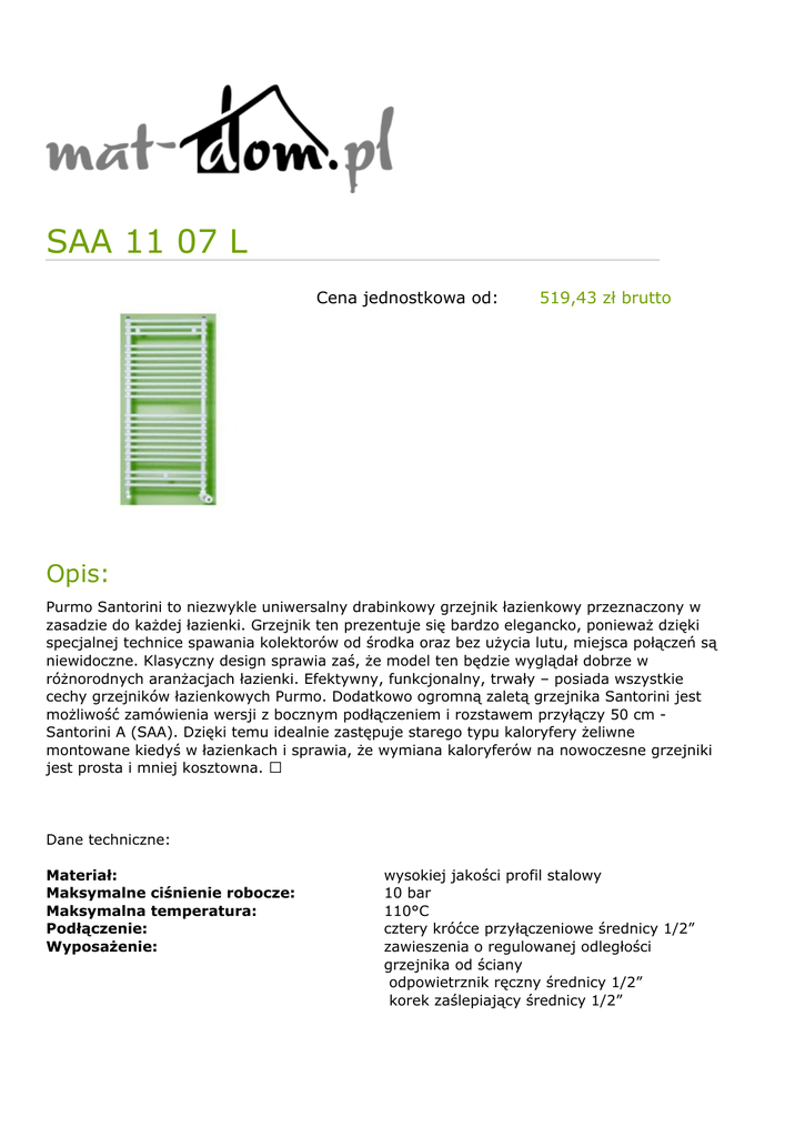 SAA 11 07 L Cena jednostkowa od: 519,43 zł brutto Opis: Purmo Santorini to niezwykle uniwersalny drabinkowy grzejnik łazienkowy przeznaczony w zasadzie do każdej łazienki. Grzejnik ten prezentuje się bardzo elegancko, ponieważ dzięki specjalnej technice spawania kolektorów od środka oraz bez użycia lutu, miejsca połączeń są niewidoczne. Klasyczny design sprawia zaś, że model ten będzie wyglądał dobrze w różnorodnych aranżacjach łazienki. Efektywny, funkcjonalny, trwały – posiada wszystkie cechy grzejników łazienkowych Purmo. Dodatkowo ogromną zaletą grzejnika Santorini jest możliwość zamówienia wersji z bocznym podłączeniem i rozstawem przyłączy 50 cm Santorini A (SAA). Dzięki temu idealnie zastępuje starego typu kaloryfery żeliwne montowane kiedyś w łazienkach i sprawia, że wymiana kaloryferów na nowoczesne grzejniki jest prosta i mniej kosztowna. Dane techniczne: Materiał: Maksymalne ciśnienie robocze: Maksymalna temperatura: Podłączenie: Wyposażenie: wysokiej jakości profil stalowy 10 bar 110°C cztery króćce przyłączeniowe średnicy 1/2” zawieszenia o regulowanej odległości grzejnika od ściany odpowietrznik ręczny średnicy 1/2” korek zaślepiający średnicy 1/2” Przygotowanie powierzchni: Malowanie podkładowe: Malowanie: Normy, atesty: Zastosowanie: Kraj produkcji: Gwarancje: Cecha szczególna: Powered by TCPDF (www.tcpdf.org) śrutowanie, odtłuszczanie, fosforanowanie, płukanie wodą zdemineralizowaną anaforeza napylanie elektrostatyczne PN EN 442, ISO 9001, ISO 14001, Atest Higieniczny PZH HK/B/0598/01/2002 wodne instalacje centralnego ogrzewania Austria 10 lat Możliwość zamówienia grzejnika w wysokości 714 lub 1134 mm z podłączeniem z boku, rozstaw przyłączy bocznych 500 mm, dostępne wersje: prawo- lub lewostronna