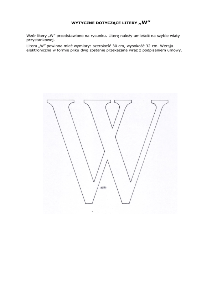 WYTYCZNE DOTYCZĄCE LITERY „W” Wzór litery „W” przedstawiono na rysunku. Literę należy umieścić na szybie wiaty przystankowej. Litera „W” powinna mieć wymiary: szerokość 30 cm, wysokość 32 cm. Wersja elektroniczna w formie pliku dwg zostanie przekazana wraz z podpisaniem umowy.