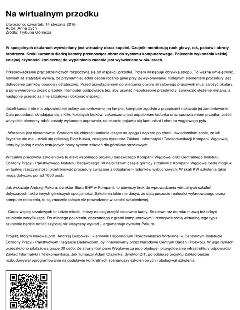 Na wirtualnym przodku Utworzono: czwartek, 14 stycznia 2016 Autor: Anna Zych Źródło: Trybuna Górnicza W specjalnych okularach wyświetlany jest wirtualny obraz kopalni. Czujniki monitorują ruch głowy, rąk, palców i obroty śródręcza. Kroki kursanta śledzą kamery przenoszące obraz do systemu komputerowego. Polecenie wykonania każdej kolejnej czynności koniecznej do wypełnienia zadania jest wyświetlane w okularach. Przeprowadzenie prac strzelniczych rozpoczyna się od inspekcji przodka. Potem następuje obrywka stropu. To ważna umiejętność, bowiem ze statystyk wynika, że przynamniej jedna osoba rocznie ginie przy jej wykonywaniu. Kolejnym elementem procedury jest dokręcenie zamków obudowy ostatecznej. Przed przystąpieniem do wiercenia otworu strzałowego pracownik musi założyć okulary, a po wywierceniu zrosić przodek. Komputer podpowiada też, aby usunąć niepotrzebne przedmioty, sprawdzić stężenie metanu, a następnie przejść za linię strzałową i dokonać inspekcji. Jeżeli kursant nie ma odpowiedniej osłony zamontowanej na lampie, komputer zgodnie z przepisami nakazuje jej zamontowanie. Cała procedura, składająca się z kilku kolejnych kroków, zakończona jest odpaleniem ładunku oraz sprawdzeniem przodka. Jeżeli wszystkie elementy robót zostały wykonane poprawnie, na ekranie pojawia się komunikat i chmura węglowego pyłu. - Wrażenie jest niesamowite. Starałem się zbierać kamienie leżące na spągu i dopiero po chwili uświadomiłem sobie, że ich fizycznie nie ma – dzieli się refleksją Piotr Kuśka, zastępca dyrektora Zakładu Informatyki i Telekomunikacji Kompanii Węglowej, który był jedną z osób testujących nowy system szkoleń dla górników strzałowych. Wirtualna pracownia szkoleniowa to efekt wspólnego projektu badawczego Kompanii Węglowej oraz Centralnego Instytutu Ochrony Pracy - Państwowego Instytutu Badawczego. W najbliższym czasie górnicy strzałowi z Kompanii Węglowej będą mogli w wirtualnej rzeczywistości przetrenować procedury związane z odpalaniem ładunków wybuchowych. W skali KW szkolenia takie mogą dotyczyć ponad 1000 osób. Jak wskazuje Andrzej Pakura, dyrektor Biura BHP w Kompanii, to pierwszy krok do wprowadzenia wirtualnych szkoleń, dotyczących także innych górniczych specjalności. Szkolenia takie nie dosyć, że dają poczucie realności wykreowanego przez komputer otoczenia, to są znacznie tańsze niż prowadzone w sztolni szkoleniowej. - Coraz więcej strzałowych to ludzie młodzi, którzy muszą przejść stosowne kursy. Strzałowi raz do roku muszą też odbyć szkolenie weryfikujące. Do młodego pokolenia, obeznanego z grami komputerowymi i rzeczywistością wirtualną tego typu szkolenie będzie trafiać szybciej niż klasyczny wykład – argumentuje dyrektor Pakura. Projekt, którym kierował prof. Andrzej Grabowski, kierownik Laboratorium Rzeczywistości Wirtualnej w Centralnym Instytucie Ochrony Pracy - Państwowym Instytucie Badawczym, był finansowany przez Narodowe Centrum Badań i Rozwoju. W jego ramach przeszkolono pilotażową grupę 30 osób. Ze strony Kompanii Węglowej za jego obsługę i przygotowanie infrastruktury odpowiadał Zakład Informatyki i Telekomunikacji. Jak tłumaczy Adam Olszynka, dyrektor ZIT, po odbiorze projektu Zakład będzie rozbudowywał oprogramowanie na podstawie konkretnych scenariuszy szkoleniowych i obsługiwał szkolenia.