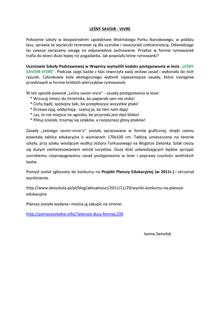 LEŚNY SAVOIR - VIVRE Położenie szkoły w bezpośrednim sąsiedztwie Wolińskiego Parku Narodowego, w pobliżu lasu, sprawia że wycieczki terenowe są dla uczniów i nauczycieli codziennością. Odwiedzając las zawsze zwracamy uwagę na odpowiednie zachowanie. Przekaz w formie rymowanek trafia do dzieci dużo lepiej niż pogadanka. Jak powstały leśne rymowanki? Uczniowie Szkoły Podstawowej w Wapnicy wymyślili kodeks postępowania w lesie „LEŚNY SAVOIR-VIVRE”. Podczas zajęć każda z klas stworzyła swój zestaw zasad i wykonała do nich rysunki. Członkowie koła ekologicznego wyłonili najważniejsze zasady, które następnie przedstawili w formie krótkich wierszyków-rymowanek. W ten sposób powstał „Leśny savoir-vivre” - zasady postępowania w lesie: * Wrzucaj śmieci do śmietnika, bo papierek sam nie znika! * Cichy bądź, spokojny taki, bo przepłoszysz wszystkie ptaki! * Drzewa żyją, oddychają - szanuj je, bo tlen nam dają! * Las, to nie miejsce na ognisko, bo przyroda jest zbyt blisko! * Pilnuj ścieżek, trzymaj się szlaków, a rozpoznasz głosy ptaków! Zasady „Leśnego savoir-vivre’u” zostały opracowane w formie graficznej, dzięki czemu powstała tablica edukacyjna o wymiarach 170x100 cm. Tablicę umieszczono na terenie szkoły, przy szlaku wiodącym wzdłuż Jeziora Turkusowego na Wzgórze Zielonka. Szlak cieszy się dużym zainteresowaniem wśród turystów. Duża ilość odwiedzających będzie sprzyjać szerokiemu rozpropagowaniu zasad postępowania w lesie i poprawy czystości wolińskich lasów. Pomysł został zgłoszony do konkursu na Projekt Planszy Edukacyjnej (w 2011r.) i otrzymał wyróżnienie. http://www.ekoszkola.pl/pl/blog/aktualnosci/2011/11/29/wyniki-konkursu-na-planszeedukacyjna Plansza została wydana i można ją zakupić na stronie: http://pomoceszkolne.info/?plansze-duzy-format,239 Iwona Samołyk