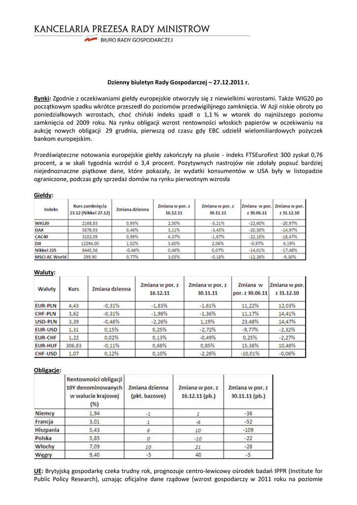 Dzienny biuletyn Rady Gospodarczej – 27.12.2011 r. Rynki: Zgodnie z oczekiwaniami giełdy europejskie otworzyły się z niewielkimi wzrostami. Także WIG20 po początkowym spadku wkrótce przeszedł do poziomów przedwigilijnego zamknięcia. W Azji niskie obroty po poniedziałkowych wzrostach, choć chiński indeks spadł o 1,1 % w wtorek do najniższego poziomu zamknięcia od 2009 roku. Na rynku obligacji wzrost rentowności włoskich papierów w oczekiwaniu na aukcję nowych obligacji 29 grudnia, pierwszą od czasu gdy EBC udzielił wielomiliardowych pożyczek bankom europejskim. Przedświąteczne notowania europejskie giełdy zakończyły na plusie - indeks FTSEurofirst 300 zyskał 0,76 procent, a w skali tygodnia wzrósł o 3,4 procent. Pozytywnych nastrojów nie zdołały popsuć bardziej niejednoznaczne piątkowe dane, które pokazały, że wydatki konsumentów w USA były w listopadzie ograniczone, podczas gdy sprzedaż domów na rynku pierwotnym wzrosła Giełdy: Waluty: Obligacje: UE: Brytyjską gospodarkę czeka trudny rok, prognozuje centro-lewicowy ośrodek badań IPPR (Institute for Public Policy Research), uznając oficjalne dane rządowe (wzrost gospodarczy w 2011 roku na poziomie 0,9 % oraz w 2012 roku na poziomie 0,7 %) za zbyt optymistyczne. Jednocześnie oprocentowanie 10-letnich giltsów spadło do 2,03 % na koniec notowania. Dane: Francuskie ministerstwo pracy podało, iż liczba bezrobotnych we Francji wzrozła w listopadzie o prawie 30 tysięcy osób, osiągając rekordowy od 1999 roku poziom 2,85 miliona osób bez pracy. Z innych danych wynika, że bezrobocie we Francji wyniosło 9,3 % (wciąż mniej niż w 2009 roku, gdy otarło się o psychologiczny próg 10 %). Pogarsza się także struktura bezrobocia, które w coraz większym stopniu dotyka zatrudnionych na umowy na czas nieokreślony, a nie jak dotychczas pracowników sezonowym lub tymczasowych. Współpraca: Departament Analiz Strategicznych KPRM