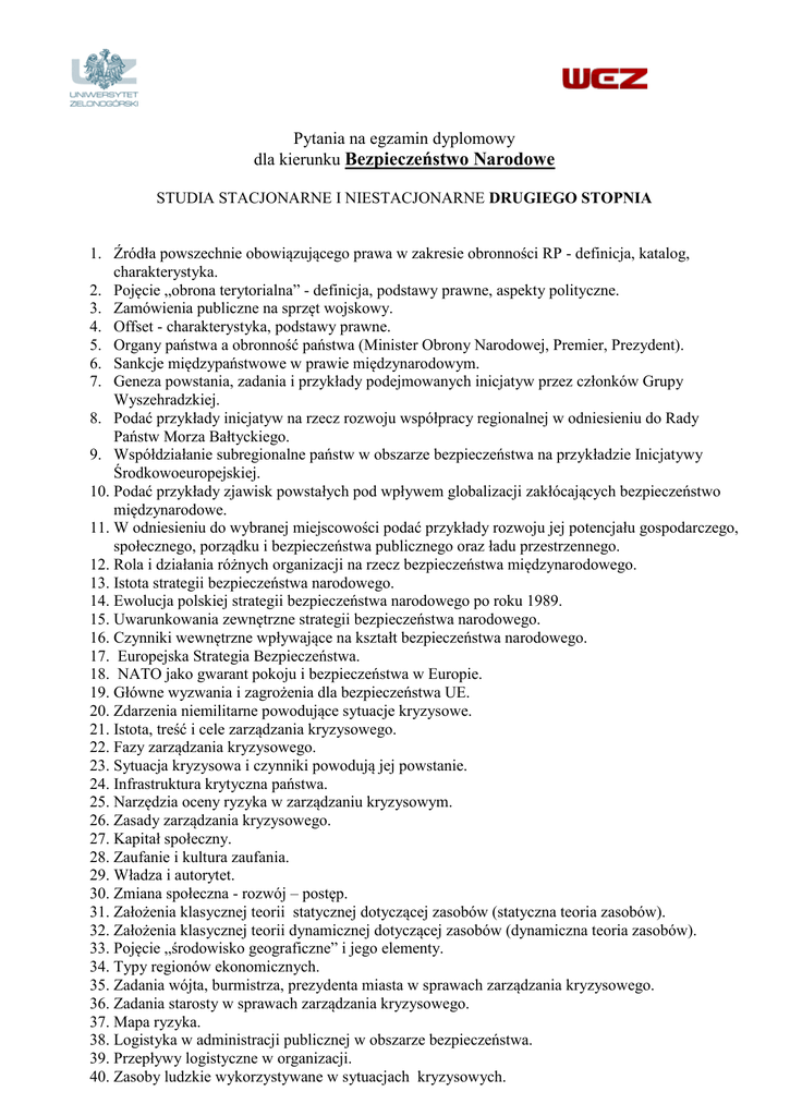 Pytania na egzamin dyplomowy dla kierunku Bezpieczeństwo Narodowe STUDIA STACJONARNE I NIESTACJONARNE DRUGIEGO STOPNIA 1. Źródła powszechnie obowiązującego prawa w zakresie obronności RP - definicja, katalog, charakterystyka. 2. Pojęcie „obrona terytorialna” - definicja, podstawy prawne, aspekty polityczne. 3. Zamówienia publiczne na sprzęt wojskowy. 4. Offset - charakterystyka, podstawy prawne. 5. Organy państwa a obronność państwa (Minister Obrony Narodowej, Premier, Prezydent). 6. Sankcje międzypaństwowe w prawie międzynarodowym. 7. Geneza powstania, zadania i przykłady podejmowanych inicjatyw przez członków Grupy Wyszehradzkiej. 8. Podać przykłady inicjatyw na rzecz rozwoju współpracy regionalnej w odniesieniu do Rady Państw Morza Bałtyckiego. 9. Współdziałanie subregionalne państw w obszarze bezpieczeństwa na przykładzie Inicjatywy Środkowoeuropejskiej. 10. Podać przykłady zjawisk powstałych pod wpływem globalizacji zakłócających bezpieczeństwo międzynarodowe. 11. W odniesieniu do wybranej miejscowości podać przykłady rozwoju jej potencjału gospodarczego, społecznego, porządku i bezpieczeństwa publicznego oraz ładu przestrzennego. 12. Rola i działania różnych organizacji na rzecz bezpieczeństwa międzynarodowego. 13. Istota strategii bezpieczeństwa narodowego. 14. Ewolucja polskiej strategii bezpieczeństwa narodowego po roku 1989. 15. Uwarunkowania zewnętrzne strategii bezpieczeństwa narodowego. 16. Czynniki wewnętrzne wpływające na kształt bezpieczeństwa narodowego. 17. Europejska Strategia Bezpieczeństwa. 18. NATO jako gwarant pokoju i bezpieczeństwa w Europie. 19. Główne wyzwania i zagrożenia dla bezpieczeństwa UE. 20. Zdarzenia niemilitarne powodujące sytuacje kryzysowe. 21. Istota, treść i cele zarządzania kryzysowego. 22. Fazy zarządzania kryzysowego. 23. Sytuacja kryzysowa i czynniki powodują jej powstanie. 24. Infrastruktura krytyczna państwa. 25. Narzędzia oceny ryzyka w zarządzaniu kryzysowym. 26. Zasady zarządzania kryzysowego. 27. Kapitał społeczny. 28. Zaufanie i kultura zaufania. 29. Władza i autorytet. 30. Zmiana społeczna - rozwój – postęp. 31. Założenia klasycznej teorii statycznej dotyczącej zasobów (statyczna teoria zasobów). 32. Założenia klasycznej teorii dynamicznej dotyczącej zasobów (dynamiczna teoria zasobów). 33. Pojęcie „środowisko geograficzne” i jego elementy. 34. Typy regionów ekonomicznych. 35. Zadania wójta, burmistrza, prezydenta miasta w sprawach zarządzania kryzysowego. 36. Zadania starosty w sprawach zarządzania kryzysowego. 37. Mapa ryzyka. 38. Logistyka w administracji publicznej w obszarze bezpieczeństwa. 39. Przepływy logistyczne w organizacji. 40. Zasoby ludzkie wykorzystywane w sytuacjach kryzysowych.