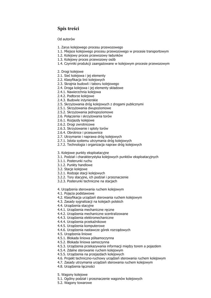 Spis treści Od autorów 1. Zarys kolejowego procesu przewozowego 1.1. Miejsce kolejowego procesu przewozowego w procesie transportowym 1.2. Kolejowy proces przewozowy ładunków 1.3. Kolejowy proces przewozowy osób 1.4. Czynniki produkcji zaangażowane w kolejowym procesie przewozowym 2. Drogi kolejowe 2.1. Sieć kolejowa i jej elementy 2.2. Klasyfikacja linii kolejowych 2.3. Skrajnia budowli i taboru kolejowego 2.4. Droga kolejowa i jej elementy składowe 2.4.1. Nawierzchnia kolejowa 2.4.2. Podtorze kolejowe 2.4.3. Budowle inżynierskie 2.5. Skrzyżowania dróg kolejowych z drogami publicznymi 2.5.1. Skrzyżowania dwupoziomowe 2.5.2. Skrzyżowania jednopoziomowe 2.6. Połączenia i skrzyżowania torów 2.6.1. Rozjazdy kolejowe 2.6.2. Drogi zwrotnicowe 2.6.3. Skrzyżowanie i sploty torów 2.6.4. Obrotnice i przesuwnice 2.7. Utrzymanie i naprawa dróg kolejowych 2.7.1. Istota systemu utrzymania dróg kolejowych 2.7.2. Technologia i organizacja napraw dróg kolejowych 3. Kolejowe punkty eksploatacyjne 3.1. Podział i charakterystyka kolejowych punktów eksploatacyjnych 3.1.1. Posterunki ruchu 3.1.2. Punkty handlowe 3.2. Stacje kolejowe 3.2.1. Rodzaje stacji kolejowych 3.2.2. Tory stacyjne, ich podział i przeznaczenie 3.2.3. Posterunki techniczne na stacjach 4. Urządzenia sterowania ruchem kolejowym 4.1. Pojęcia podstawowe 4.2. Klasyfikacja urządzeń sterowania ruchem kolejowym 4.3. Zasady sygnalizacji na kolejach polskich 4.4. Urządzenia stacyjne 4.4.1. Urządzenia mechaniczne ręczne 4.4.2. Urządzenia mechaniczne scentralizowane 4.4.3. Urządzenia elektromechaniczne 4.4.4. Urządzenia przekaźnikowe 4.4.5. Urządzenia komputerowe 4.4.6. Urządzenia nastawcze górek rozrządowych 4.5. Urządzenia liniowe 4.5.1. Blokada liniowa półsamoczynna 4.5.2. Blokada liniowa samoczynna 4.5.3. Urządzenia przekazywania informacji między torem a pojazdem 4.5.4. Zdalne sterowanie ruchem kolejowym 4.5.5. Urządzenia na przejazdach kolejowych 4.6. Projekt techniczno-ruchowy urządzeń sterowania ruchem kolejowym 4.7. Zasady utrzymania urządzeń sterowania ruchem kolejowym 4.8. Urządzenia łączności 5. Wagony kolejowe 5.1. Ogólny podział i przeznaczenie wagonów kolejowych 5.2. Wagony towarowe 5.2.1. Rodzaje wagonów towarowych 5.2.2. Budowa wagonów towarowych 5.2.3. Warunki kursowania wagonów towarowych poza granicami kraju 5.2.4. Podstawowe dane eksploatacyjne wagonów towarowych 5.2.5. Zasady ładowania wagonów towarowych 5.2.6. Numeracja, oznaczenia i napisy na wagonach towarowych 5.3. Wagony osobowe 5.3.1. Rodzaje wagonów osobowych 5.3.2. Budowa i wyposażenie wagonów osobowych 5.3.3. Warunki kursowania wagonów osobowych poza granicami kraju 5.3.4. Podstawowe dane eksploatacyjne oraz zasady numeracji i oznaczania wagonów osobowych 5.4. Utrzymanie i naprawa wagonów 5.4.1. Utrzymanie wagonów towarowych 5.4.2. Utrzymanie wagonów osobowych 5.5. Urządzenia hamulcowe 6. Pojazdy trakcyjne 6.1. Klasyfikacja i podstawowe cechy kolejowych pojazdów trakcyjnych 6.2. Spalinowe pojazdy trakcyjne 6.3. Elektryczne pojazdy trakcyjne 6.4. Lokomotywy parowe 6.5. Utrzymanie i naprawa kolejowych pojazdów trakcyjnych 6.6. Kolejowe pojazdy pomocnicze 6.7. Pojazdy niekonwencjonalne 7. Zasady prowadzenia ruchu pociągów na szlakach i stacjach 7.1. Ogólne zasady prowadzenia ruchu pociągów na szlaku 7.2. Zasady prowadzenia ruchu pociągów na szlaku linii jednotorowej 7.3. Zasady prowadzenia ruchu pociągów na szlaku linii dwutorowej 7.4. Prowadzenie ruchu pociągów na szlaku w warunkach szczególnych 7.5. Przyjmowanie, wyprawianie i przepuszczanie pociągów przez stację 7.6. Rozkład jazdy pociągów 8. Technologia pracy manewrowej 8.1. Pojęcie i cel manewrów 8.2. Sposoby wykonywania manewrów 8.3. Organizacja pracy manewrowej na stacji 9. Technologia pracy stacji kolejowych 9.1. Technologia pracy stacji towarowych 9.1.1. Obróbka pociągów towarowych tranzytowych 9.1.2. Obróbka pociągów kończących jazdę na stacji 9.1.3. Obróbka wagonów loco 9.1.4. Obróbka wagonów tranzytowych 9.1.5. Technologia zestawiania pociągów towarowych 9.1.6. Obróbka pociągów towarowych rozpoczynających jazdę na stacji 9.1.7. Proces technologiczny pracy stacji towarowej 9.2. Technologia pracy stacji osobowych 10. Technologia przemieszczania ładunków i osób w transporcie kolejowym 10.1. Technologia przemieszczania ładunków 10.1.1. Strumienie i potoki wagonów ładownych 10.1.2. Technologia przemieszczania na określonym kierunku transportowym 10.1.3. Rodzaje pociągów towarowych 10.1.4. Przewozy marszrutowe, wahadłowe i zwykłe 10.1.5. Przemieszczanie wagonów próżnych 10.2. Technologia przemieszczania osób 10.2.1. Podstawowe układy przemieszczania osób 10.2.2. Rodzaje pociągów pasażerskich 10.3. Technologia obsługi pociągów przez pojazdy trakcyjne 10.4. Prędkość pociągów i prędkość przewozu 11. Technologia kombinowanych procesów transportowych z udziałem transportu kolejowego 11.1. Rodzaje kombinowanych procesów transportowych 11.2. Tabor wagonowy 11.3. Terminale przeładunkowe 11.4. Technologia przeładunku 12. Zdolność przepustowa linii kolejowej oraz zdolność przerobowa i ładunkowa stacji 12.1. Zdolność przepustowa szlaku 12.2. Zdolność przepustowa stacji 12.3. Zdolność przerobowa stacji 12.4. Zdolność ładunkowa stacji towarowej Literatura ISBN: 978-83-206-1919-5