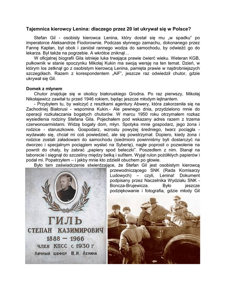 Tajemnica kierowcy Lenina: dlaczego przez 20 lat ukrywał się w Polsce? Stefan Gil - osobisty kierowca Lenina, który dostał się mu „w spadku” po imperatorce Aleksandrze Fiodorownie. Podczas słynnego zamachu, dokonanego przez Fannę Kapłan, był obok i zaniósł rannego wodza do samochodu, by odwieźć go do lekarza. Był także na pogrzebie. A wkrótce zniknął… W oficjalnej biografii Gila istnieje luka trwająca prawie ćwierć wieku. Weteran KGB, pułkownik w stanie spoczynku Mikołaj Kukin ma swoją wersję na ten temat. Dzień, w którym los zetknął go z osobistym kierowcą Lenina, pamięta prawie w najdrobniejszych szczegółach. Razem z korespondentem „AiF”, jeszcze raz odwiedził chutor, gdzie ukrywał się Gil. Domek z młynem Chutor znajduje się w okolicy białoruskiego Grodna. Po raz pierwszy, Mikołaj Nikołajewicz zawitał tu przed 1946 rokiem, będąc jeszcze młodym lejtnantem. - Przybyłem tu, by walczyć z resztkami agentury Abwery, która zakorzeniła się na Zachodniej Białorusi - wspomina Kukin.- Ale pewnego dnia, przydzielono mnie do operacji rozkułaczania bogatych chutorów. W marcu 1950 roku otrzymałem rozkaz wysiedlenia rodziny Stefana Gila. Pojechałem pod wskazany adres razem z trzema czerwonoarmistami. Widzę bogaty dom, młyn. Spotyka mnie gospodarz, jego żona i rodzice - staruszkowie. Gospodarz, wzrostu powyżej średniego, twarz pociągła wydawało się, chciał mi coś powiedzieć, ale się powstrzymał. Dopiero, kiedy żona i rodzice zostali załadowani do samochodu (siedmioro powinniśmy byli dostarczyć na dworzec i specjalnym pociągiem wysłać na Syberię), nagle poprosił o pozwolenie na powrót do chaty, by zabrać „papiery spod beleczki”. Poszedłem z nim. Stanął na taborecie i sięgnął do szczeliny między belką i sufitem. Wyjął rulon pożółkłych papierów i podał mi. Popatrzyłem – i jakby mnie kto zdzielił obuchem po głowie. Było tam zaświadczenie stwierdzające, że Stefan Gil jest osobistym kierowcą przewodniczącego SNK (Rada Komisarzy Ludowych) – czyli, Lenina! Dokument podpisany przez Naczelnika Wydziału SNK Boncza-Brujewicza. Było jeszcze podziękowanie i fotografia, gdzie młody Gil stoi na tle samochodu. Rozpoznałem samochód Lenina - widziałem go na innych fotografiach. I Gil, chociaż minęło prawie 30 lat, niewiele się zmienił. Byłem pewny na 99%, że przed mną jest kierowca Lenina. Co prawda, w rozkazie wysiedlenia był on wymieniony jako Stanisław Kazimierowicz Gil, a w zaświadczeniu – był Stefanem Kazimierowiczem Gilem. Pytam: „Jak to możliwe?” Gil wyjaśnił: „Jestem Polakiem, to moje rodzinne strony. Po powrocie, zarejestrowałem się pod tym imieniem, które jest zapisane w dokumentach kościelnych. A w Piotrogrodzie i Moskwie, by było prościej, nazywałem się Stefanem”. Znikły moje ostatnie wątpliwości. „Poczekaj - mówię - zamelduję o tobie władzom”. Pojechałem do komitetu obwodowego partii. Moim naczelnikiem był pułkownik Aleksiej Froł i jemu oddałem dokumenty Gila. Froł poszedł do pierwszego sekretarza grodnieńskiego komitetu obwodowego partii, Siergieja Prityckiego. Władze naradzały się za zamkniętymi drzwiami około pół godziny. A potem, otrzymałem odwołanie rozkazu wysiedlenia Gila. Wszystkich się bał. Wróciłem do chutoru i zakomunikowałem radosną wieść. Gil zaprosił mnie do chaty, widocznie potrzebował się wygadać. „Ostatnie 20 lat żyję, jak mysz pod miotłą, wszystkich się boję - opowiadał. - Po śmierci Lenina, samowolnie opuściłem Moskwę, wróciłem do ojczyzny, do Grodna. Tu, dzięki krewnym zachowało się gospodarstwo, młyn, dobry dom. Wiadomo, że musiałem ukrywać swoją przeszłość. Przecież do 1939 r. Grodno było w składzie Polski, tu panowały inne porządki. Bałem się polskiej policji politycznej. Potem, kiedy w 1941 roku, Grodno zajęli Niemcy, bałem się nie mniej – mogą się dowiedzieć, że pracowałem jako kierowca Lenina. A kiedy w 1944 roku przyszła Armia Czerwona, bałem się już Sowietów - mogli mi wypomnieć samowolną ucieczkę z Moskwy”. Po chwili milczenia, wskazał na swoją kurtkę: „To przecież ta sama skóreczka, w którą byłem ubrany w sierpniu 1918 roku, tego dnia, kiedy w fabryce Michelsona, Kapłan strzeliła do Lenina. Wtedy, na rękach zaniosłem go do samochodu. Chciałem zawieźć do szpitala, ale Lenin kazał jechać do Kremla”. Od imperatora - do bolszewików To było nasze drugie i ostatnie spotkanie. Władze mnie uprzedziły: O tym epizodzie nie rozpowiadaj. Ale wciąż miałem nadzieję, że któregoś dnia jednak spotkam się z Gilem i dowiem się nowych szczegółów. W rozkazie jego wysiedlania zaznaczono, że posiada nie tylko gospodarstwo, maszyny rolnicze, ale i zwykły samochód, którym obsługuje komercyjne rejsy między Grodnem i miasteczkiem Oziory. Nie trudno się domyśleć, że Gil bywał w mieście i po paru dniach zobaczyłem go na placu. Próbowałem dogonić, ale zgubił się w tłumie. Po kilku dniach udałem się do jego gospodarstwa - ciekawość rozpierała. Ale dom okazał się pusty. Sąsiedzi powiedzieli, że rodzina wyjechała, nie zostawiwszy nowego adresu. Ślad Gila zagubił się. Nadal analizowałem sytuację. Odszukałem pięciotomowe wspomnienia o Leninie, które wydano w 1934 r., ale nie znalazłem tam żadnej wzmianki o Gilu, który w przeciągu 6 lat, każdego dnia miał styczność z wodzem. Natomiast, były tam wspomnienia ludzi, którzy widzieli się z Leninem tylko jeden czy dwa razy. O czym to świadczy? O tym, że prawdopodobnie, w 1934 roku Gil był za granicą, czyli w Polsce. Jednakże, w 1956 roku, po pięciu latach od mojego z nim spotkania, w Moskwie ukazały się jego wspomnienia - „Sześć lat z Leninem”. Nie mogę zaręczyć, ale przypuszczam, że raport o tym, że kierowca Lenina ukrywa się w Grodnie, dotarł do Stalina. Prawdopodobnie, wyjazd Gila z chutoru jest związany z dzia
