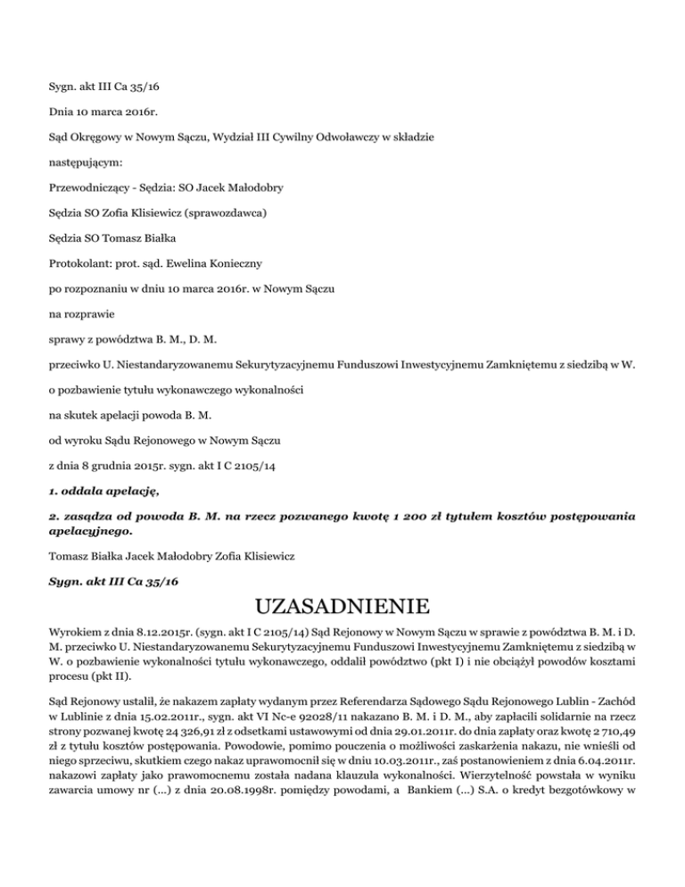 Sygn. akt III Ca 35/16 Dnia 10 marca 2016r. Sąd Okręgowy w Nowym Sączu, Wydział III Cywilny Odwoławczy w składzie następującym: Przewodniczący - Sędzia: SO Jacek Małodobry Sędzia SO Zofia Klisiewicz (sprawozdawca) Sędzia SO Tomasz Białka Protokolant: prot. sąd. Ewelina Konieczny po rozpoznaniu w dniu 10 marca 2016r. w Nowym Sączu na rozprawie sprawy z powództwa B. M., D. M. przeciwko U. Niestandaryzowanemu Sekurytyzacyjnemu Funduszowi Inwestycyjnemu Zamkniętemu z siedzibą w W. o pozbawienie tytułu wykonawczego wykonalności na skutek apelacji powoda B. M. od wyroku Sądu Rejonowego w Nowym Sączu z dnia 8 grudnia 2015r. sygn. akt I C 2105/14 1. oddala apelację, 2. zasądza od powoda B. M. na rzecz pozwanego kwotę 1 200 zł tytułem kosztów postępowania apelacyjnego. Tomasz Białka Jacek Małodobry Zofia Klisiewicz Sygn. akt III Ca 35/16 UZASADNIENIE Wyrokiem z dnia 8.12.2015r. (sygn. akt I C 2105/14) Sąd Rejonowy w Nowym Sączu w sprawie z powództwa B. M. i D. M. przeciwko U. Niestandaryzowanemu Sekurytyzacyjnemu Funduszowi Inwestycyjnemu Zamkniętemu z siedzibą w W. o pozbawienie wykonalności tytułu wykonawczego, oddalił powództwo (pkt I) i nie obciążył powodów kosztami procesu (pkt II). Sąd Rejonowy ustalił, że nakazem zapłaty wydanym przez Referendarza Sądowego Sądu Rejonowego Lublin - Zachód w Lublinie z dnia 15.02.2011r., sygn. akt VI Nc-e 92028/11 nakazano B. M. i D. M., aby zapłacili solidarnie na rzecz strony pozwanej kwotę 24 326,91 zł z odsetkami ustawowymi od dnia 29.01.2011r. do dnia zapłaty oraz kwotę 2 710,49 zł z tytułu kosztów postępowania. Powodowie, pomimo pouczenia o możliwości zaskarżenia nakazu, nie wnieśli od niego sprzeciwu, skutkiem czego nakaz uprawomocnił się w dniu 10.03.2011r., zaś postanowieniem z dnia 6.04.2011r. nakazowi zapłaty jako prawomocnemu została nadana klauzula wykonalności. Wierzytelność powstała w wyniku zawarcia umowy nr (...) z dnia 20.08.1998r. pomiędzy powodami, a Bankiem (...) S.A. o kredyt bezgotówkowy w kwocie 27 000 zł, która to kwota miała zostać spłacona wraz z odsetkami w 60 ratach, począwszy od 10.09.1998r. Powodowie spłacili kwotę 31 402,68 zł, tj. 37 rat, oraz dodatkowo wpłacili kwotę 1 300 zł w formie przelewów nieujętych w książeczce spłat. Łącznie spłacili kwotę 32 702,68 zł. W związku z zaprzestaniem spłaty, wierzyciel pierwotny zgodnie z harmonogramem, w dniu 8.04.2002r. postawił kredyt w stan natychmiastowej wymagalności. W dniu 4.11.2003r. wierzyciel pierwotny wystawił Bankowy Tytuł Egzekucyjny nr 93/03, obejmujący należność główną w kwocie 8 714,87 zł oraz kwotę skapitalizowanych odsetek od należności przeterminowanej do dnia 3.11.2003r. Umową przelewu wierzytelności z dnia 17.10.2006r., strona pozwana nabyła wierzytelność w stosunku do powodów wynikającą z tego kredytu. Na przedmiotową wierzytelność dochodzoną w postępowaniu nakazowym elektronicznym składały się kwoty 8 140,87 zł z tytułu należności głównej oraz kwota 16 186,04 zł z tytułu odsetek. W tym stanie rzeczy, Sąd Rejonowy powołując się na treść art. 840 § 1 k.p.c. uznał, że powództwo nie zasługiwało na uwzględnienie. Sąd I instancji wskazał, że w postępowaniu przeciwegzekucyjnym Sąd może badać tylko te kwestie, które powstały po zakończeniu postępowania w sprawie, w której wydano tytuł egzekucyjny, ewentualnie na spełnienie świadczenia przed zakończeniem postępowania w sytuacji, gdy istniał ustawowy zakaz rozpoznania zarzutu spełnienia świadczenia. Ponieważ powodowie na okoliczność, iż spłacili całą należność z tytułu umowy kredytowej, mogli powołać się choćby w sprzeciwie od nakazu zapłaty, którego jednak nie wnieśli, ich powództwo choćby z tego względu nie zasługiwało w ocenie Sądu I instancji na uwzględnienie. Niezależnie od powyższego, Sąd Rejonowy uznał, iż domaganie się przez stronę pozwaną zapłaty od powodów na podstawie nakazu zapłaty nie narusza zasad współżycia społecznego, a wręcz jest tych zasad wypełnieniem. Jeżeli bowiem dochodzi do zawarcia umowy kredytowej, to kredytobiorca musi mieć świadomość konieczności spłaty zaciągniętego zobowiązania - nie tylko samego kapitału, ale także odsetek. Odnośnie podniesionego przez powodów zarzutu przedawnienia roszczenia Sąd I instancji powołując się na treść art. 125 k.c. wskazał, że przedawnienie takie nie mogło nastąpić, bowiem nakaz zapłaty został wydany przez Sąd Rejonowy Lublin - Zachód w Lublinie w dniu 15.02.2011r., natomiast w aspekcie przesłanek powództwa opozycyjnego podstawą jego uwzględnienia może być jedynie stwierdzenie przedawnienia roszczenia następującego po dacie wydania spornego nakazu zapłaty. O kosztach postępowania Sąd I instancji orzekł na podstawie art. 102 k.p.c., mając na uwadze trudną sytuację majątkową powodów oraz okoliczność, iż strona pozwana jest profesjonalistą trudniącym się skupowaniem wierzytelności i zatrudniającym profesjonalnego pełnomocnika, natomiast powodowie byli stroną słabszą w procesie. Powyższy wyrok zaskarżył powód B. M. apelacją, w której zarzucił: 1. naruszenie art. 117 k.c. w zw. z art. 118 k.c. przez ich niezastosowanie i nieuwzględnienie zarzutu przedawnienia w sytuacji, gdy roszczenie stwierdzone tytułem wykonawczym w dniu złożenia pozwu do Sądu Rejonowego Lublin Zachód w Lublinie było roszczeniem przedawnionym, 2. naruszenie art. 840 § 1 pkt 2 k.p.c. przez jego niewłaściwą wykładnię, polegającą na przyjęciu, iż przepis ten może dotyczyć zdarzeń powstałych wyłącznie po wydaniu tytułu wykonawczego, podczas gdy może mieć zastosowanie także do zdarzeń sprzed zamknięcia rozprawy, a zwłaszcza zarzutu spełnienia świadczenia, jeśli nie był przedmiotem rozpoznania w sprawie, 3. naruszenie art. 233 § 2 k.p.c. przez nieuwzględnienie i pominięcie zeznań powodów, skut