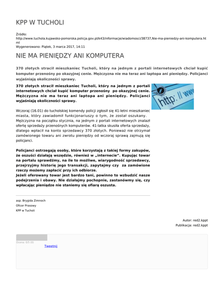 KPP W TUCHOLI Źródło: http://www.tuchola.kujawsko-pomorska.policja.gov.pl/k43/informacje/wiadomosci/38737,Nie-ma-pieniedzy-ani-komputera.ht ml Wygenerowano: Piątek, 3 marca 2017, 14:11 NIE MA PIENIĘDZY ANI KOMPUTERA 370 złotych stracił mieszkaniec Tucholi, który na jednym z portali internetowych chciał kupić komputer przenośny po okazyjnej cenie. Mężczyzna nie ma teraz ani laptopa ani pieniędzy. Policjanci wyjaśniają okoliczności sprawy. 370 złotych stracił mieszkaniec Tucholi, który na jednym z portali internetowych chciał kupić komputer przenośny po okazyjnej cenie. Mężczyzna nie ma teraz ani laptopa ani pieniędzy. Policjanci wyjaśniają okoliczności sprawy. Wczoraj (16.01) do tucholskiej komendy policji zgłosił się 41-letni mieszkaniec miasta, który zawiadomił funkcjonariuszy o tym, że został oszukany. Mężczyzna na początku stycznia, na jednym z portali internetowych znalazł ofertę sprzedaży przenośnych komputerów. 41-latka skusiła oferta sprzedaży, dlatego wpłacił na konto sprzedawcy 370 złotych. Ponieważ nie otrzymał zamówionego towaru ani zwrotu pieniędzy od wczoraj sprawą zajmują się policjanci. Policjanci ostrzegają osoby, które korzystają z takiej formy zakupów, że oszuści działają wszędzie, również w „internecie”. Kupując towar na portalu sprawdźmy, na ile to możliwe, wiarygodność sprzedawcy, przejrzyjmy historię jego transakcji, zapytajmy czy za zamówione rzeczy możemy zapłacić przy ich odbiorze. Jeżeli oferowany towar jest bardzo tani, powinno to wzbudzić nasze podejrzenia i obawy. Nie działajmy pochopnie, zastanówmy się, czy wpłacając pieniądze nie staniemy się ofiarą oszusta. asp. Brygida Zimnoch Oficer Prasowy KPP w Tucholi Autor: red2.kppt Publikacja: red2.kppt Ocena: 0/5 (0) Tweetnij