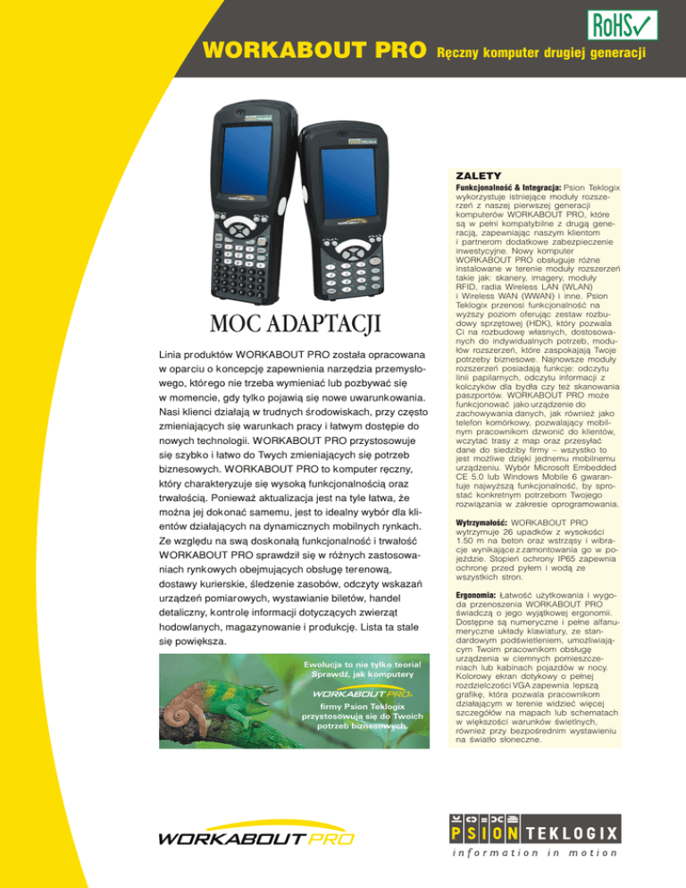WORKABOUT PRO Ręczny komputer drugiej generacji ZALETY MOC ADAPTACJI Linia produktów WORKABOUT PRO została opracowana w oparciu o koncepcję zapewnienia narzędzia przemysłowego, którego nie trzeba wymieniać lub pozbywać się w momencie, gdy tylko pojawią się nowe uwarunkowania. Nasi klienci działają w trudnych środowiskach, przy często zmieniających się warunkach pracy i łatwym dostępie do nowych technologii. WORKABOUT PRO przystosowuje się szybko i łatwo do Twych zmieniających się potrzeb biznesowych. WORKABOUT PRO to komputer ręczny, który charakteryzuje się wysoką funkcjonalnością oraz trwałością. Ponieważ aktualizacja jest na tyle łatwa, że można jej dokonać samemu, jest to idealny wybór dla klientów działających na dynamicznych mobilnych rynkach. Ze względu na swą doskonałą funkcjonalność i trwałość WORKABOUT PRO sprawdził się w różnych zastosowaniach rynkowych obejmujących obsługę terenową, dostawy kurierskie, śledzenie zasobów, odczyty wskazań urządzeń pomiarowych, wystawianie biletów, handel detaliczny, kontrolę informacji dotyczących zwierząt hodowlanych, magazynowanie i produkcję. Lista ta stale się powiększa. Ewolucja to nie tylko teoria! Sprawdź, jak komputery firmy Psion Teklogix przystosowują się do Twoich potrzeb biznesowych. Funkcjonalność & Integracja: Psion Teklogix wykorzystuje istniejące moduły rozszerzeń z naszej pierwszej generacji komputerów WORKABOUT PRO, które są w pełni kompatybilne z drugą generacją, zapewniając naszym klientom i partnerom dodatkowe zabezpieczenie inwestycyjne. Nowy komputer WORKABOUT PRO obsługuje różne instalowane w terenie moduły rozszerzeń takie jak: skanery, imagery, moduły RFID, radia Wireless LAN (WLAN) i Wireless WAN (WWAN) i inne. Psion Teklogix przenosi funkcjonalność na wyższy poziom oferując zestaw rozbudowy sprzętowej (HDK), który pozwala Ci na rozbudowę własnych, dostosowanych do indywidualnych potrzeb, modułów rozszerzeń, które zaspokajają Twoje potrzeby biznesowe. Najnowsze moduły rozszerzeń posiadają funkcje: odczytu linii papilarnych, odczytu informacji z kolczyków dla bydła czy też skanowania paszportów. WORKABOUT PRO może funkcjonować jako urządzenie do zachowywania danych, jak również jako telefon komórkowy, pozwalający mobilnym pracownikom dzwonić do klientów, wczytać trasy z map oraz przesyłać dane do siedziby firmy – wszystko to jest możliwe dzięki jednemu mobilnemu urządzeniu. Wybór Microsoft Embedded CE 5.0 lub Windows Mobile 6 gwarantuje najwyższą funkcjonalność, by sprostać konkretnym potrzebom Twojego rozwiązania w zakresie oprogramowania. Wytrzymałość: WORKABOUT PRO wytrzymuje 26 upadków z wysokości 1.50 m na beton oraz wstrząsy i wibracje wynikające z zamontowania go w pojeździe. Stopień ochrony IP65 zapewnia ochronę przed pyłem i wodą ze wszystkich stron. Ergonomia: Łatwość użytkowania i wygoda przenoszenia WORKABOUT PRO świadczą o jego wyjątkowej ergonomii. Dostępne są numeryczne i pełne alfanumeryczne układy klawiatury, ze standardowym podświetleniem, umożliwiającym Twoim pracownikom obsługę urządzenia w ciemnych pomieszczeniach lub kabinach pojazdów w nocy. Kolorowy ekran dotykowy o pełnej rozdzielczości VGA zapewnia lepszą grafikę, która pozwala pracownikom działającym w terenie widzieć więcej szczegółów na mapach lub schematach w większości warunków świetlnych, również przy bezpośrednim wystawieniu na światło słoneczne. WORKABOUT PRO Ręczny komputer drugiej generacji Specyfikacja* WARIANTY MODELU: · WORKABOUT PRO C – Model 7527C-G2. · WORKABOUT PRO S – Model 7527S-G2. PROCESOR · PXA270 520 MHz, 32 bit RISC CPU. · 1024 MB flash, 128 MB RAM. SYSTEM OPERACYJNY: · Microsoft® Windows® CE 5.0. · Microsoft® Windows® Mobile® 6 Classic. · Microsoft® Windows® Mobile® 6 Prof. WORKABOUT PRO C WORKABOUT PRO S KOMUNIKACJA BEZPRZEWODOWA · Zintegrowany Bluetooth klasy II, wersja 2.0+EDR, zasięg: 5m do 10m. Uwaga: 802.11b/g, GSM oraz Bluetooth mogą pracować równocześnie. Moduły rozszerzeń instalowane opcjonalnie: · GSM/GPRS EDGE (przez 100-pin. interfejs) Moduł GSM Quad-Band – 850/900/1800/1900. Wsparcie transferu danych i głosu. GPRS klasy B, Multi-Slot klasy 12. EGPRS klasa B, Multi-Slot klasy 12. · 802.11b/g (przez gniazdo CF) w paśmie 2,4GHz: Wspiera standard IEEE 802.11b, prędkość transmisji danych 1, 2, 5.5 oraz 11 Mbps z wykorzystaniem bezpośredniej modulacji widma rozpraszającego (DSSS). Wspiera standard IEEE 802.11g, prędkość transmisji danych 6, 9, 12, 24, 36, 48 i 54 Mbps, z wykorzystaniem techniki transmisji OFDM i modulacją pasma podstawowego. ODBIORNIK GPS INSTALOWANY OPCJONALNIE CZYTNIKI KODÓW KRESKOWYCH INSTALOWANE OPCJONALNIE: · 1D imager. · 2D imager. · 1D SE955 skaner laserowy. · 1D SE1223 High Performance skaner laserowy. · Uchwyt pistoletowy. Uwaga: Wszystkie opcje mogą być instalowane przez użytkownika. MODUŁY RFID INSTALOWANE OPCJONALNIE · Moduł HF Częstotliwość: 13,56 MHz. Wsparcie dla tagów (etykiet): ISO 15693, Philips Icode™; TI TagiIt™; Tagsys (C210, C220, C240, C270). Zasięg odczyt/zapis: do 80 mm. · Moduł MIFARE Częstotliwość: 13,56 MHz. Wsparcie dla tagów (etykiet): ISO 14443 A&B Mifare. Zasięg odczyt/zapis: do 50 mm. · Moduł LF Częstotliwość: 125 KHz, 134,2 KHz. Wsparcie dla tagów (etykiet): EM 4x0x, EM 4x50; Hitag 1&2; ISO HDXA & FDXB Zasięg odczyt/zapis: do 70 mm (2.756 in.) · Moduł UHF Częstotliwość: 868 MHz. Wsparcie dla tagów (etykiet): EPC klasa 1 Gen 2, inne protokoły zależnie od regionu Zasięg odczytu: do 80 cm. INTERFEJS UŻYTKOWNIKA · Kolorowy ekran o przekątnej 3,6 cala (9.144 cm). Pełna rozdzielczość VGA 480x640. Ekran typu TFT z trybem odblaskowo przezroczystym. · Regulowane podświetlenie. Czytelny w świetle słonecznym (do zastosowań na zewnątrz). · Ekran dotykowy Obsługiwany ołówkiem lub palcami 
