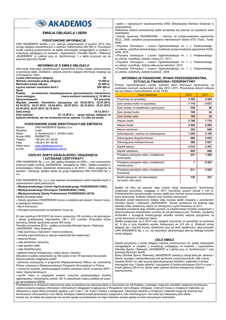 EMISJA OBLIGACJI I SERII PODSTAWOWE INFORMACJE CRH AKADEMOS Spółka z o.o. planuje przeprowadzić w grudniu 2012 roku emisję obligacji niezamiennych o wartości maksymalnej 500 000 zł. Pozyskane środki zostaną przeznaczone na spłatę zobowiązań zaciągniętych w związku z inwestycją polegającą na budowie i wyposażeniu Ośrodka Sportu i Rekreacji „AKADEMOS” w Lublinie przy ul. Symfonicznej 1 a także przyczyni się do poprawy płynności Spółki. INFORMACJE O EMISJI OBLIGACJI Informacje dotyczące podstawowych parametrów emisji zostały podsumowane w poniższej tabeli. Dokładne i jedynie prawnie wiążące informacje znajdują się w Prospekcie I Serii. Liczba oferowanych obligacji: 50 Wartość nominalna jednej obligacji: 10 000 zł Minimalna kwota zakupu: 20 000 zł Łączna wartość nominalna Serii I: 500 000 zł Seria: I Rodzaj: na okaziciela, niezabezpieczone, oprocentowane, niezamienne Cena emisyjna: równa wartości nominalnej tj. 10 000 zł Oprocentowanie: 8% (rocznie) Wypłata odsetek: Kwartalnie, począwszy od: 02.04.2013, 02.07.2013, 02.10.2013, 02.01.2014, 02.04.2014, 02.07.2014, 02.10.2014, 02.01.2015, 02.04.2015, 02.07.2015, 02.10.2015. Data emisji: 18.12.2012 r. Data wykupu: 18 .12.2015 r.- opcja wykupu obligacji na żądanie remitenta, ale nie wcześniej niż po upływie 1,5 roku od emisji. PODSTAWOWE DANE IDENTYFIKACYJNE EMITENTA Nazwa: Siedziba: Adres: Numer KRS: Telefon: Faks: Adres www: e-mail: CRH AKADEMOS Spółka z o.o. Lublin ul. Symfoniczna 1, 20-853 Lublin 0000067730 +48 (81) 441 99 36 +48 (81) 441 99 36 www.akademos.com.pl [email protected] OGÓLNY ZARYS DZIAŁALNOŚCI, OSIĄGNIĘCIA I UZYSKANE CERTYFIKATY CRH AKADEMOS Sp. z o.o. jest spółką istniejącą od 2000 r. i jest sukcesorem prawnym spółki cywilnej „AKADEMOS”, istniejącej od 1993 r. Spółka prowadzi w przeważającej mierze działalność edukacyjną a od 2012 r. także związaną ze sportem i rekreacją. Spółka należy do grupy kapitałowej CRH HOLDING Sp. z o.o. CRH AKADEMOS Sp. z o.o. jest organem prowadzącym szkół niepublicznych o uprawnieniach szkół publicznych: • Międzynarodowego Liceum Ogólnokształcącego PADEREWSKI (1993), • Międzynarodowego Gimnazjum PADEREWSKI (1999), • Międzynarodowej Szkoły Podstawowej PADEREWSKI (2010). Spółka prowadzi także: • Szkoły Językowe PADEREWSKI (kursy w siedzibie gimnazjum i liceum, kursy w siedzibach klientów), • Biuro tłumaczeń, • Wynajem pomieszczeń na szkolenia i kursy itp. • jeden z najwyższych współczynników EWD (Edukacyjnej Wartości Dodanej) w województwie. Wieloletnia historia prowadzonej spółki przełożyła się również na uzyskanie wielu certyfikatów: • Szkoły Językowe PADEREWSKI – licencja na przeprowadzanie egzaminów TELC, 2008, certyfikat przeprowadzania internetowych testów ETS (Toeic, Toefl), 2008, • Prywatne Gimnazjum i Liceum Ogólnokształcące im. I. J. Paderewskiego w Lublinie, certyfikat potwierdzający możliwość przeprowadzania egzaminów ECDL, 2009, 2012, • Prywatne Gimnazjum i Liceum Ogólnokształcące im. I. J. Paderewskiego w Lublinie, certyfikaty „Szkoły z klasą 2.0”, 2011, • Prywatne Gimnazjum i Liceum Ogólnokształcące im. I. J. Paderewskiego w Lublinie, certyfikaty „Szkoły odkrywców talentów”, 2010. • Prywatne Gimnazjum i Liceum Ogólnokształcące im. I. J. Paderewskiego w Lublinie, certyfikaty „Szkoła myślenia”, 2009. INFORMACJE FINANSOWE, WYNIKI PRZEDSIĘBIORSTWA, SYTUACJA FINANSOWA I PERSPEKTYWY Poniżej zaprezentowane zostały wybrane dane finansowe opracowane na podstawie rocznych sprawozdań za lata 2010 i 2011. Prezentacja danych odbywa się wg Ustawy o rachunkowości (w tys. PLN). Dane bilansowe 2010 2011 Przychody ze sprzedaży 3 399 4 294 - 1 716 - 2 673 Zysk (strata) na działalności operacyjnej 238 86 Zysk (strata) brutto 199 24 Zysk (strata) netto 199 24 Aktywa razem 3 788 7 712 Aktywa trwałe 3 546 6 864 Zysk (strata) brutto na sprzedaży Aktywa obrotowe 242 848 1 255 5 155 Zobowiązania długoterminowe 690 2 075 Zobowiązania krótkoterminowe 390 2 627 2 533 2 557 Kapitał zakładowy Przepływy pieniężne netto z działalności operacyjnej 850 431 850 1 202 Przepływy pieniężne netto z działalności inwestycyjnej 7 -3 543 Przepływy pieniężne netto z działalności finansowej -511 2 533 139 331 Zobowiązania i rezerwy na zobowiązania Kapitał własny Środki pieniężne i ich ekwiwalenty na koniec roku obrot. Spółka od kilku lat poprzez stały rozwój usług edukacyjnych, dynamicznie zwiększała przychody, osiągając w 2011 rekordowy poziom ponad 4 mln zł. Potwierdzeniem dynamicznego rozwoju spółki jest również wzrost ponad dwukrotny sumy bilansowej, środków trwałych oraz środków obrotowych. Aktualnie został dokończony kolejny etap rozwoju spółki związany z powstaniem Ośrodka Sportu i Rekreacji „AKADEMOS”. Koszty poniesione na budowę tego ośrodka miały zasadniczy wpływ na zmniejszony wynik finansowy za 2011. Jednakże powstanie tego ośrodka pozwoli na zredukowanie kosztów związanych z dotychczasowym dowożeniem uczniów do sal gimnastycznych. Ponadto, uzyskanie dochodów z wynajęcia komercyjnego ośrodka również wpłynie pozytywnie na wyniki finansowe w kolejnych latach. Spółka prognozuje, że w 2014 roku osiągnie przychody ze sprzedaży na poziomie ok. 9 mln zł przy dodatnim wyniku finansowym ok. 0,5 mln zł. Wielkość emisji obligacji jak i również koszty odsetkowe przy tej skali działalności, jaką prowadzi CRH AKADEMOS Sp. z o.o. są racjonalne, gwarantujące płynną obsługę kosztów emisji obligacji. W roku szkolnym 2012/2013 do liceum uczęszcza 129 uczniów a do gimnazjum i szkoły podstawowej odpowiednio 198 i 270 uczniów. Przeciętna liczba słuchaczy Szkoły Językowej wynosi 304 osoby. Ponadto od kwietnia 2012 r. spółka uruchomiła Ośrodek Sportu i Rekreacji „AKADEMOS”, który obejmuje: • halę sportową (z trybunami i trzema b