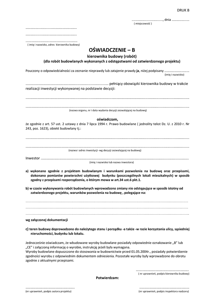 DRUK B .................................., dnia ……………...… ( miejscowość ) ……………...............….…………………….. …………...............……….………………….. .……….......….......………….................... ( imię i nazwisko, adres kierownika budowy) OŚWIADCZENIE – B kierownika budowy (robót) (dla robót budowlanych wykonanych z odstępstwami od zatwierdzonego projektu) Pouczony o odpowiedzialności za zeznanie nieprawdy lub zatajenie prawdy ja, niżej podpisany ………………………… (imię i nazwisko) …...……………………………………………….................................... pełniący obowiązki kierownika budowy w trakcie realizacji inwestycji wykonywanej na podstawie decyzji: ..…………………………………………………...........................……........……………………………....................................................... .…………………………………………………............................………........…………………………....................................................... (nazwa organu, nr i data wydania decyzji zezwalającej na budowę) oświadczam, że zgodnie z art. 57 ust. 2 ustawy z dnia 7 lipca 1994 r. Prawo budowlane ( jednolity tekst Dz. U. z 2010 r. Nr 243, poz. 1623), obiekt budowlany tj.: ..……………………………………………………........……………………….............................………..................................................... .………………………………………………........…………….............................………………………...................................................... (nazwa i adres inwestycji -wg decyzji zezwalającej na budowę) Inwestor .………………………………………………........…………............................…………………………...................................... (imię i nazwisko lub nazwa inwestora) a) wykonano zgodnie z projektem budowlanym i warunkami pozwolenia na budowę oraz przepisami, dokonano pomiarów powierzchni użytkowej budynku (poszczególnych lokali mieszkalnych) w sposób zgodny z przepisami rozporządzenia, o którym mowa w art.34 ust.6 pkt.1. b) w czasie wykonywania robót budowlanych wprowadzono zmiany nie odstępujące w sposób istotny od zatwierdzonego projektu, warunków pozwolenia na budowę , polegające na: ……………………………………………………………………………………………………………………… ……………………………………………………………………………………………………………………… ………………………………………………………………………………………………………………………. wg załączonej dokumentacji c) teren budowy doprowadzono do należytego stanu i porządku -a także -w razie korzystania ulicy, sąsiedniej nieruchomości, budynku lub lokalu. Jednocześnie oświadczam, że wbudowane wyroby budowlane posiadały odpowiednie oznakowanie „B” lub „CE” i załączoną informację o wyrobie, instrukcję jeżeli była wymagana. Wyroby budowlane dopuszczone do stosowania w budownictwie przed 01.05.2004r., posiadały potwierdzenie zgodności wyrobu z odpowiednim dokumentem odniesienia. Pozostałe wyroby były wprowadzone do obrotu zgodnie z aktualnymi przepisami. ……..…………...…………………………………. ( nr uprawnień, podpis kierownika budowy) Potwierdzam: ………………………………………………….. …………………………………………………… (nr uprawnień, podpis autora projektu) (nr uprawnień, podpis inspektora nadzoru)