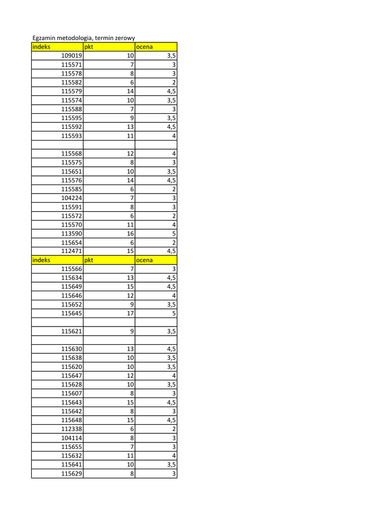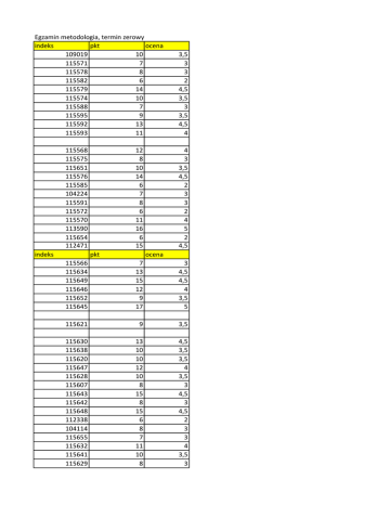 Egzamin metodologia, termin zerowy indeks pkt ocena 109019 10 3