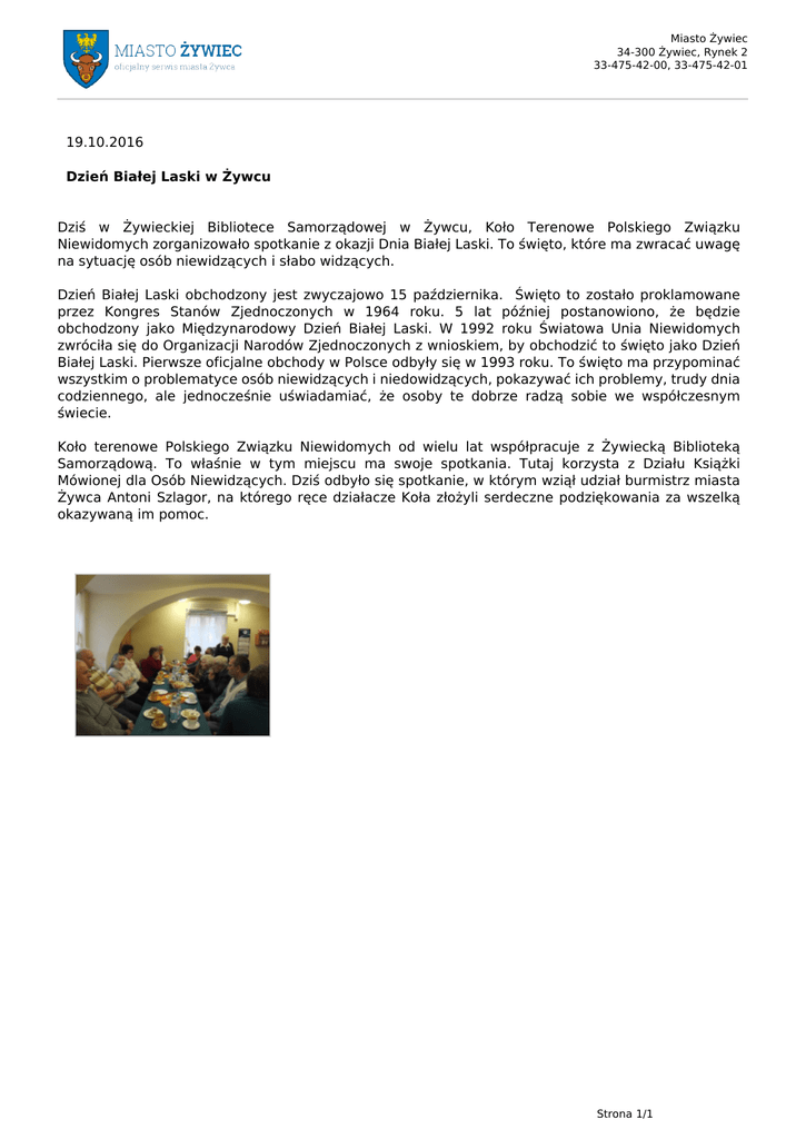 Miasto Żywiec 34-300 Żywiec, Rynek 2 33-475-42-00, 33-475-42-01 19.10.2016 Dzień Białej Laski w Żywcu Dziś w Żywieckiej Bibliotece Samorządowej w Żywcu, Koło Terenowe Polskiego Związku Niewidomych zorganizowało spotkanie z okazji Dnia Białej Laski. To święto, które ma zwracać uwagę na sytuację osób niewidzących i słabo widzących. Dzień Białej Laski obchodzony jest zwyczajowo 15 października. Święto to zostało proklamowane przez Kongres Stanów Zjednoczonych w 1964 roku. 5 lat później postanowiono, że będzie obchodzony jako Międzynarodowy Dzień Białej Laski. W 1992 roku Światowa Unia Niewidomych zwróciła się do Organizacji Narodów Zjednoczonych z wnioskiem, by obchodzić to święto jako Dzień Białej Laski. Pierwsze oficjalne obchody w Polsce odbyły się w 1993 roku. To święto ma przypominać wszystkim o problematyce osób niewidzących i niedowidzących, pokazywać ich problemy, trudy dnia codziennego, ale jednocześnie uświadamiać, że osoby te dobrze radzą sobie we współczesnym świecie. Koło terenowe Polskiego Związku Niewidomych od wielu lat współpracuje z Żywiecką Biblioteką Samorządową. To właśnie w tym miejscu ma swoje spotkania. Tutaj korzysta z Działu Książki Mówionej dla Osób Niewidzących. Dziś odbyło się spotkanie, w którym wziął udział burmistrz miasta Żywca Antoni Szlagor, na którego ręce działacze Koła złożyli serdeczne podziękowania za wszelką okazywaną im pomoc. Strona 1/1 Powered by TCPDF (www.tcpdf.org)