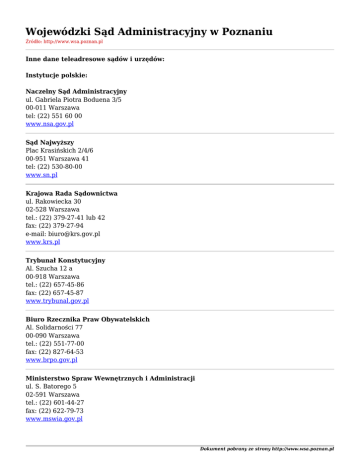 Wojewódzki Sąd Administracyjny w Poznaniu Źródło: http://www.wsa.poznan.pl Inne dane teleadresowe sądów i urzędów: Instytucje polskie: Naczelny Sąd Administracyjny ul. Gabriela Piotra Boduena 3/5 00-011 Warszawa tel: (22) 551 60 00 www.nsa.gov.pl Sąd Najwyższy Plac Krasińskich 2/4/6 00-951 Warszawa 41 tel: (22) 530-80-00 www.sn.pl Krajowa Rada Sądownictwa ul. Rakowiecka 30 02-528 Warszawa tel.: (22) 379-27-41 lub 42 fax: (22) 379-27-94 e-mail: [email protected] www.krs.pl Trybunał Konstytucyjny Al. Szucha 12 a 00-918 Warszawa tel.: (22) 657-45-86 fax: (22) 657-45-87 www.trybunal.gov.pl Biuro Rzecznika Praw Obywatelskich Al. Solidarności 77 00-090 Warszawa tel.: (22) 551-77-00 fax: (22) 827-64-53 www.brpo.gov.pl Ministerstwo Spraw Wewnętrznych i Administracji ul. S. Batorego 5 02-591 Warszawa tel.: (22) 601-44-27 fax: (22) 622-79-73 www.mswia.gov.pl Dokument pobrany ze strony http://www.wsa.poznan.pl Biuro Generalnego Inspektora Ochrony Danych Osobowych ul. Stawki 2 00-193 Warszawa tel.: (22) 860-70-81 fax: (22) 860-70-86 e-mail: [email protected] www.giodo.gov.pl Okręgowa Izba Radców Prawnych ul. Chwaliszewo 69 61-105 Poznań tel.: (61) 853-53-11 fax: (61) 853-57-55 e-mail: [email protected] www.oirp.poznan.pl Krajowa Izba Radców Prawnych al. Ujazdowskie 18 lok.4 00-478 Warszawa tel.: (22) 622-05-88; (22) 622-84-28; (22) 622-84-33 e-mail: [email protected] www.kirp.pl Okręgowa Rada Adwokacka ul. Konopnickiej 15 60-771 Poznań tel.: (61) 864-69-00; (61) 864-69-01 fax: (61) 864-69-02 e-mail: [email protected] www.rada-adwokacka.poznan.pl Naczelna Rada Adwokacka ul. Świętojerska 16 00-202 Warszawa Informacja: tel.: (22) 505-25-00; (22) 505-25-01 fax: (22) 505-25-08 e-mail: [email protected] www.nra.pl Helsińska Fundacja Praw Człowieka ul. Zgoda 11 00-018 Warszawa tel.: (22) 828-10-08; (22) 828-69-96; (22) 556-44-40; fax: (22) 556-44-50 e-mail: [email protected] www.hfhrpol.waw.pl Dokument pobrany ze strony http://www.wsa.poznan.pl Instytucje europejskie: Unia Europejska: Trybunał Sprawiedliwości Wspólnot Europejskich (ETS) Bld Konrad Adenauer, L-2925 Luksemburg fax: (00 35 2) 43 03 26 00 e-mail: [email protected] www.curia.eu.int Biuro Informacyjne Parlamentu Europejskiego w Polsce Centrum Jasna ul. Jasna 14/16a 00-041 Warszawa tel.: (22) 595-24-70 fax: (22) 595-24-80 e-mail: [email protected] www.europarl.eu.int/warszawa Europejski Rzecznik Praw Obywatelskich 1, avenue du President Robert Schuman, BP 403, F-6700 Strasbourg Cedex, Francja tel.: (00 33 3) 88 17 23 13 fax: (00 33 3) 88 17 90 62 www.euro-ombudsman.eu.int Rada Europy: Europejski Trybunał Praw Człowieka The Registrar European Cort of Human Rights Council of Europe F-67075 Strasbourg Cedex, Francja tel.: (00 33 3) 88 41 20 18 fax: (00 33 3) 88 41 27 30 www.echr.coe.int Biuro Informacji Rady Europy w Polsce al. Niepodległości 22 02-653 Warszawa tel.: (22) 845-20-84; (22) 853-57-73 fax: (22) 853-57-74 email: [email protected] www.coe.org.pl Dokument pobrany ze strony http://www.wsa.poznan.pl