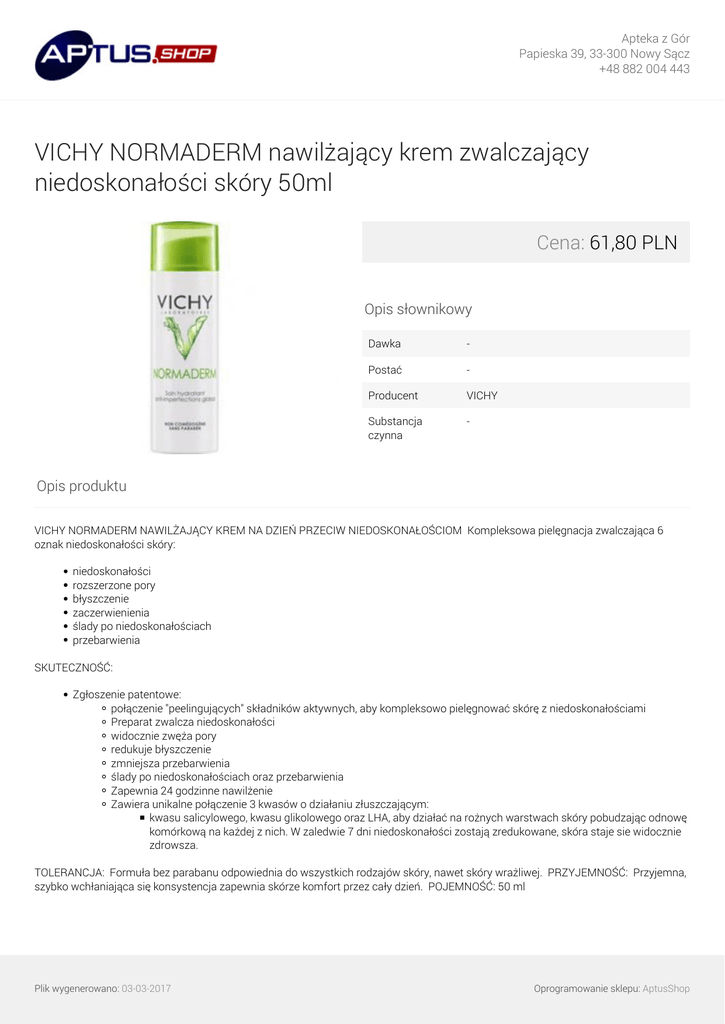 Apteka z Gór Papieska 39, 33-300 Nowy Sącz +48 882 004 443 VICHY NORMADERM nawilżający krem zwalczający niedoskonałości skóry 50ml Cena: 61,80 PLN Opis słownikowy Dawka - Postać - Producent VICHY Substancja czynna - Opis produktu VICHY NORMADERM NAWILŻAJĄCY KREM NA DZIEŃ PRZECIW NIEDOSKONAŁOŚCIOM Kompleksowa pielęgnacja zwalczająca 6 oznak niedoskonałości skóry: niedoskonałości rozszerzone pory błyszczenie zaczerwienienia ślady po niedoskonałościach przebarwienia SKUTECZNOŚĆ: Zgłoszenie patentowe: połączenie "peelingujących" składników aktywnych, aby kompleksowo pielęgnować skórę z niedoskonałościami Preparat zwalcza niedoskonałości widocznie zwęża pory redukuje błyszczenie zmniejsza przebarwienia ślady po niedoskonałościach oraz przebarwienia Zapewnia 24 godzinne nawilżenie Zawiera unikalne połączenie 3 kwasów o działaniu złuszczającym: kwasu salicylowego, kwasu glikolowego oraz LHA, aby działać na rożnych warstwach skóry pobudzając odnowę komórkową na każdej z nich. W zaledwie 7 dni niedoskonałości zostają zredukowane, skóra staje sie widocznie zdrowsza. TOLERANCJA: Formuła bez parabanu odpowiednia do wszystkich rodzajów skóry, nawet skóry wrażliwej. PRZYJEMNOŚĆ: Przyjemna, szybko wchłaniająca się konsystencja zapewnia skórze komfort przez cały dzień. POJEMNOŚĆ: 50 ml Plik wygenerowano: 03-03-2017 Powered by TCPDF (www.tcpdf.org) Oprogramowanie sklepu: AptusShop