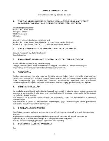 ULOTKA INFORMACYJNA Enroxil Flavour 50 mg Tabletki dla psów 1. NAZWA I ADRES PODMIOTU ODPOWIEDZIALNEGO ORAZ WYTWÓRCY ODPOWIEDZIALNEGO ZA ZWOLNIENIE SERII, JEŚLI JEST INNY Podmiot odpowiedzialny: KRKA, d.d., Novo mesto Šmarješka cesta 6 8501 Novo mesto Słowenia Wytwórca odpowiedzialny za zwolnienie serii: KRKA, d.d., Novo mesto, Šmarješka cesta 6, 8501 Novo mesto, Słowenia Virbac S.A., 1ère avenue, 2065 m L.I.D., 06516 Carros Cedex, Francja 2. NAZWA PRODUKTU LECZNICZEGO WETERYNARYJNEGO Enroxil Flavour 50 mg Tabletki dla psów Enrofloksacyna 3. ZAWARTOŚĆ SUBSTANCJI CZYNNEJ (-CH) I INNYCH SUBSTANCJI Każda tabletka zawiera 50 mg enrofloksacyny. Okrągła, nieco wypukła z obu stron tabletka o ściętych krawędziach, i barwie kremowej do brązowawej, z widocznymi białymi lub ciemniejszymi plamkami. 4. WSKAZANIA Produkt przeznaczony jest dla psów do leczenia zakażeń bakteryjnych przewodu pokarmowego, układu oddechowego oraz dróg moczowych, zakażeń skóry, wtórnych zakażeń ran, a także zapalenia ucha zewnętrznego, gdy rozpoznanie kliniczne potwierdzone wynikami testu wrażliwości drobnoustrojów wskazuje na celowość zastosowania enrofloksacyny, jako antybiotyku z wyboru. 5. PRZECIWWSKAZANIA Ze względu na możliwość uszkodzenia chrząstek stawowych w okresie intensywnego wzrostu, nie stosować u psów poniżej 1 roku życia oraz przed upływem 18 miesiąca życia u psów bardzo dużych ras o długim okresie wzrostu. Nie stosować w przypadku nadwrażliwości na substancję czynną lub którąkolwiek z substancji pomocniczych. Nie stosować u psów z zaburzeniami napadowymi, gdyż enrofloksacyna może powodować pobudzenie ośrodkowego układu nerwowego. 6. DZIAŁANIA NIEPOŻĄDANE Enrofloksacyna może wpływać negatywnie na rozwój chrząstek stawowych w okresie intensywnego wzrostu. W przypadku zaobserwowania jakichkolwiek poważnych objawów lub innych objawów nie wymienionych w ulotce, poinformuj o nich swojego lekarza weterynarii. Rzadko obserwowane były przypadki wymiotów oraz anoreksji. 7. DOCELOWE GATUNKI ZWIERZĄT Psy. 1 8. DAWKOWANIE DLA KAŻDEGO GATUNKU, DROGA (-I) I SPOSÓB PODANIA Nie należy przekraczać zalecanych dawek leku. Enrofloksacynę należy podawać doustnie, z pokarmem lub bez, w dawce 5 mg/kg raz dziennie lub w dawce podzielonej dwa razy dziennie przez okres 5 do 10 dni. Czas trwania terapii u psów może zostać przedłużony zależnie od wyników leczenia, oraz na podstawie oceny prowadzącego lekarza weterynarii. W celu uniknięcia podania zbyt małej dawki leku, waga ciała zwierzęcia powinna być określona tak dokładnie, jak to tylko możliwe. Dawkę dzienną uzyskuje się w następujący sposób: Psy średniej wielkości: 1 tabletka 50 mg na 10 kg masy ciała. 9. ZALECENIA DLA PRAWIDŁOWEGO PODANIA Tabletki należy podawać doustnie, raz dziennie lub w dawce podzielonej dwa razy dziennie, z pokarmem lub bez. 10. OKRESY KARENCJI Nie dotyczy. 11. SPECJALNE ŚRODKI OSTROŻNOŚCI PRZY PRZECHOWYWANIU Przechowywać w miejscu niedostępnym i niewidocznym dla dzieci. Przepołowioną tabletkę należy zapakować do otwartego blistra i zużyć w ciągu 24 godzin. Brak szczególnych środków ostrożności dotyczących przechowywania. Nie używać po upłynięciu daty ważności podanej na opakowaniu. 12. SPECJALNE OSTRZEŻENIA Fluorochinolony powinny być zarezerwowane do leczenia klinicznych przypadków schorzeń bakteryjnych, które słabo reagują lub, gdy oczekiwana reakcja na inne grupy antybiotyków jest niezadowalająca. W miarę możliwości stosowanie powinno być potwierdzone badaniami wrażliwości wykonanymi za pomocą antybiogramu. Stosowanie produktu niezgodnie z instrukcją zapisaną w niniejszej charakterystyce może skutkować wzrostem liczby szczepów bakterii opornych na fluorochinolony, a to może spowodować zmniejszenie efektywności leczenia innymi chinolonami, poprzez wzrost oporności krzyżowej Stosować biorąc pod uwagę obowiązujące wytyczne dotyczące stosowania produktów przeciwbakteryjnych. Nie stosować profilaktycznie. Nie należy przekraczać zalecanych dawek leku. Stosować ostrożnie u psów z poważnymi zaburzeniami funkcjonowania nerek i wątroby. Stosowanie w czasie ciąży i laktacji - stosować jedynie po dokonaniu przez lekarza weterynarii oceny bilansu korzyści/ryzyka wynikającego ze stosowania produktu. Nie podawać razem z tetracyklinami, makrolidami oraz lekami z grupy fenikoli z powodu możliwego działania antagonistycznego, przez co pożądany efekt terapeutyczny może nie zostać osiągnięty. Równoczesne podawanie fluorochinolonów z doustnymi antykoagulantami (lekami zapobiegającymi krzepnięciu krwi), może spowodować nasilenie działania tych drugich. Nie stosować równocześnie z teofiliną (lek powodujący rozszerzenie oskrzeli), gdyż enrofloksacyna może doprowadzić do przedłużonego wydalania tej substancji z organizmu. 2 Równoczesne podawanie z produktami zawierającymi związki magnezu lub glinu może prowadzić do spowolnienia wchłaniania enrofloksacyny. W razie przypadkowego przedawkowania preparatu mogą wystąpić takie objawy jak wymioty i biegunka, a także zmiany w zachowaniu związane z zaburzeniami ze strony OUN. Specyficznej odtrutki brak, należy prowadzić leczenie objawowe. Po zastosowaniu należy umyć ręce. W przypadku kontaktu produktu ze spojówką oka, należy obficie przemyć oko wodą. W razie przypadkowego połknięcia, należy niezwłocznie zasięgnąć porady lekarza, pokazując mu ulotkę informacyjną. Osoby z wykrytą nadwrażliwością na fluorochinolony powinny unikać kontaktu z produktem. 13. SZCZEGÓLNE ŚRODKI OSTROŻNOŚCI DOTYCZĄCE UNIESZKODLIWIANIA NIE ZUŻYTEGO PRODUKTU LECZNICZEGO LUB ODPADÓW, JEŚLI SĄ WYMAGANE Leków nie należy usuwać do kanalizacji ani wyrzucać do śmieci. O sposoby usunięcia bezużytecznych leków zapytaj lekarza weterynarii. Pozwolą one na lepszą ochronę środowiska. O sposoby usunięcia bezu