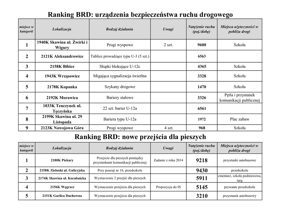 Ranking BRD: urządzenia bezpieczeństwa ruchu drogowego miejsce w kategorii Lokalizacja Rodzaj działania Uwagi Natężenie ruchu (poj./dobę) Miejsca użyteczności w pobliżu drogi 1 1940K Skawina ul. Żwirki i Wigury Progi wyspowe 2 szt. 9600 Szkoła 2 2121K Aleksandrowice Tablice prowadzące typu U-3 (5 szt.) 6563 3 2158K Bibice Słupki blokujące U-12c 4365 Szkoła 4 1943K Wrząsowice Migająca sygnalizacja świetlna 3328 Szkoła 5 2178K Kopanka Szykany drogowe 1470 Szkoła 6 2192K Morawica Bariery stalowe 3326 Pętla i przystanek komunikacji publicznej 22 szt. barier U-12a 6561 Bariera typu U-12a 1972 Plac zabaw 968 Szkoła 7 8 9 1033K Tenczynek ul. Tęczyńska 2199K Skawina ul. 29 Listopada 2123K Nawojowa Góra Progi wyspowe 4 szt. Ranking BRD: nowe przejścia dla pieszych miejsce w kategorii Lokalizacja Rodzaj działania Uwagi Natężenie ruchu (poj./dobę) Miejsca użyteczności w pobliżu drogi 1 2180K Piekary Przejscie dla pieszych pomiędzy przystankami komunikacji publicznej Zadanie z roku 2014 9218 przystanki autobusowe 2 2158K Zielonki ul. Galicyjska Przy posesji nr 16, przedszkole przedszkole 3 2174K Skawina ul. Korabnicka Wyznaczenie 2 przejść dla pieszych 9430 5911 cmentarz, szkoła podstawowa, targ 4 2156K Węgrzce Wyznaczenie przejścia dla pieszych 5145 prywante przedszkole 5 2151K Garlica Duchowna Wyznaczenie przejścia dla pieszych 3210 przystanek autobusowy Propozycja do IS 6 2129K Pisary Wyznaczenie przejścia dla pieszych 4756 przystanki autobusowe 7 1940K Radziszów Przesunięcie przejścia dla pieszych zatoki autobusowe 8 2183K Zagacie 9 2186K Sanka Wyznaczenie 4 przejść dla pieszych 4975 4134 2315 kościół, boisko sportowe, cmentarz 10 1939K Radziszów Przy skrzyżowaniu z drogą gminną ul. Jana Pawła II 4167 przystanki autobusowe 11 2191K Czułów Wyznaczenie 2 przejść dla pieszych 3285 szkoła, kaplica 12 2174K Libertów Przeniesienie przejścia dla pieszych 3507 szkoła 13 2126K Czubrowice Wyznaczenie przejścia dla pieszych 3145 szkoła, kaplica 14 2151K Michałowice, Góra Wieś – pętla autobusowa przystanek autobusowy 15 2183K Zagacie 3039 4134 Natężenie ruchu (poj./dobę) Miejsca użyteczności w pobliżu drogi Zadanie z roku 2014 zatoki autobusowe perony przystankowe Ranking BRD: nowe lustra drogowe miejsce w kategorii Lokalizacja Rodzaj działania 1 2158K Zielonki ul. Ks. Zięby Wymiana lustra na prostokątne 5079 2 2180K Piekary Ustawienie nowego lustra - szt. 2 9218 3 2153K Michałowice ul. Michałki Ustawienie nowego lustra 4316 4 2128K Rudawa Ustawienie nowego lustra 5 6 7 8 9 10 2186K Rybna 2120K Balice 1261K Prandocin 2151K Garlica Murowana Ustawienie nowego lustra Ustawienie nowego lustra Ustawienie nowego lustra Ustawienie nowego lustra 2734 1433 brak pomiaru 3210 2133K Korzkiew 2173K Buków Ustawienie nowego lustra Ustawienie nowego lustra 883 836 Uwagi Skrzyżowanie z DG od Niegoszowic 2825 OSP przystanek autobusowy OSP 11 1172K Grzegorzowice Wielkie Ustawienie nowego lustra 1217 12 2142K Zagaje Smrokowskie Ustawienie nowego lustra brak pomiaru 13 2133K Smardzowice Ustawienie nowego lustra 883 Ranking BRD: wykonanie oznakowania poziomego miejsce w kategorii Lokalizacja Rodzaj działania 1 2131K Bolechowice Linie Segregacyjne 2 1033K i 2186K Tenczynek 3 2191K Mników 4 1943K Wrząsowice przy szkole 5 2151K Zielonki 6 2152K Więcławice Stare 7 2132K Giebułtów i DG do centrum Giebułtowa 8 1943K i 2167K Wrząsowice 9 2154K Stare Zagórzyce 10 Drogi powiatowe na terenie gminy Świątniki 11 Sieciechowice 12 2154K Goszcza Skanalizowanie skrzyżowania oznakowanie poziome Pasy ostrzegawcze wibrujące z chemomasy Skanalizowanie skrzyżowania oznakowanie poziome Uwagi Zadanie z 2014 r. Skanalizowanie skrzyżowania DP i DG przy DW Pasy ostrzegawcze wibrujące z chemomasy Skanalizowanie skrzyżowania oznakowanie poziome Skanalizowanie skrzyżowania oznakowanie poziome Skanalizowanie pętli autobusowej Zadanie z 2014 r. i parkingu przy OSP Natężenie ruchu (poj./dobę) Miejsca użyteczności w pobliżu drogi 4547 Sklepy, przystanki autobusowe 6561 Liczne sklepy 3285 Droga dzieci do szkoły 3328 Szkoła 3210 brak pomiaru 5902 3018 sklep prywatny brak pomiaru przystanek autobusowy, OSP P-17 Skanalizowanie skrzyżowania oznakowanie poziome Skanalizowanie skrzyżowania oznakowanie poziome Kościół, szkoła, cmentarz 1217 638 13 2152K Łuczyce Linia rozdzielająca pasy ruchu 14 1271K Wawrzeńczyce Proszowice Linia rozdzielająca pasy ruchu 5,6 km brak pomiaru 15 1266K Igołomia - Tropiszów Linia rozdzielająca pasy ruchu 2,4 brak pomiaru 16 2202K Skawina ul. Piastowska Linie segregacyjne pasy ruchu 3279 1844 Ranking BRD: oznakowanie pionowe Natężenie ruchu (poj./dobę) Miejsca użyteczności w pobliżu drogi 5079 kosciół, szkoła 3279 3285 Szkoła szkoła, OSP przejście dla pieszych, przystanki miejsce w kategorii Lokalizacja 1 2158K Zielonki, ks. Zięby 2 3 2152K Łuczyce 2191K Czułów 4 2128K Rudawa 5 2160K Łososkowice Doznakowanie okolic szkoły 1372 Szkoła 6 7 8 1076K Paczółtowice 2129K Szklary 2161K Polanowice Doznakowanie okolic szkoły Doznakowanie okolic szkoły 1086 1255 Szkoła Szkoła 4107 9 2164K i 1266K Ograniczenie prędkości Ograniczenie tonażu na drogach powiatowych 10 2143K Rzeplin 12 2133K Smardzowice / Cianowice Rodzaj działania Doznakowanie przejścia dla pieszych Doznakowanie okolic szkoły Oznakowanie zwężenia Znaki ograniczenia prędkości B33 '70' Ograniczenie prędkości Doznakowanie zwężenia drogi i wyznaczenie pierwszeństwa przejazdu Uwagi 2825 brak pomiaru brak pomiaru 883