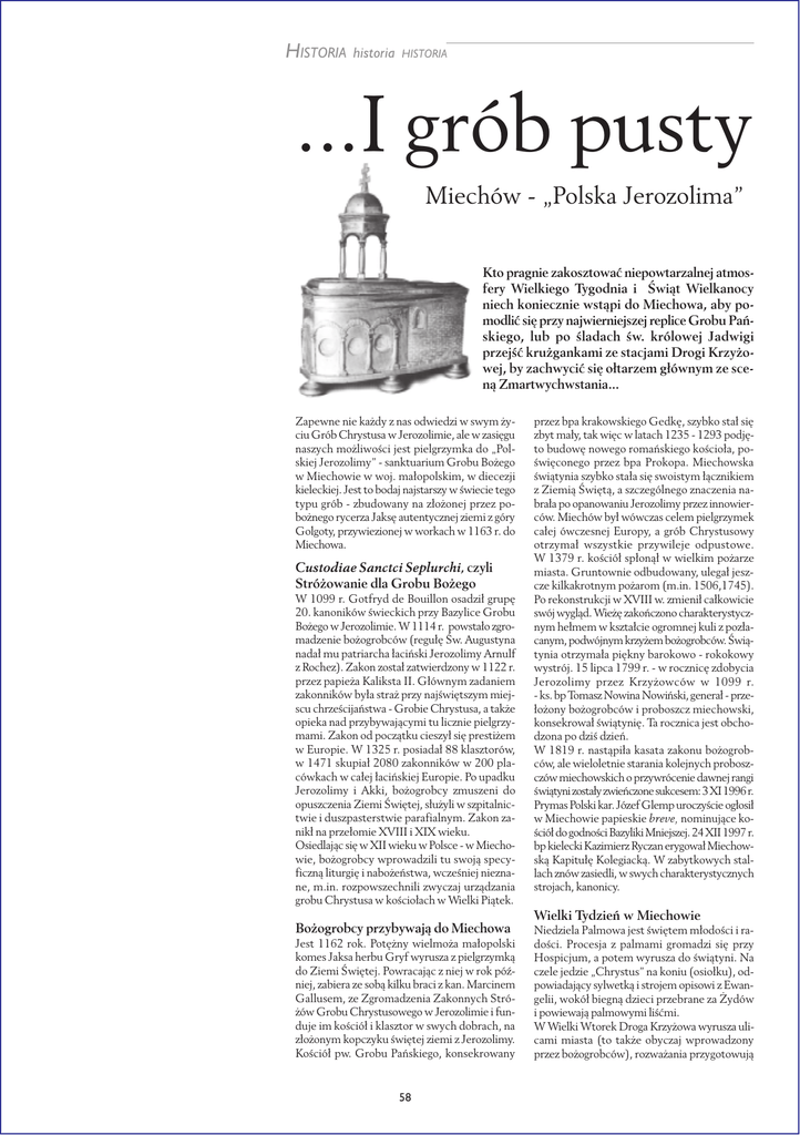 HISTORIA historia HISTORIA ...I grób pusty Miechów - „Polska Jerozolima” Kto pragnie zakosztować niepowtarzalnej atmosfery Wielkiego Tygodnia i Świąt Wielkanocy niech koniecznie wstąpi do Miechowa, aby pomodlić się przy najwierniejszej replice Grobu Pańskiego, lub po śladach św. królowej Jadwigi przejść krużgankami ze stacjami Drogi Krzyżowej, by zachwycić się ołtarzem głównym ze sceną Zmartwychwstania... Zapewne nie każdy z nas odwiedzi w swym życiu Grób Chrystusa w Jerozolimie, ale w zasięgu naszych możliwości jest pielgrzymka do „Polskiej Jerozolimy” - sanktuarium Grobu Bożego w Miechowie w woj. małopolskim, w diecezji kieleckiej. Jest to bodaj najstarszy w świecie tego typu grób - zbudowany na złożonej przez pobożnego rycerza Jaksę autentycznej ziemi z góry Golgoty, przywiezionej w workach w 1163 r. do Miechowa. Custodiae Sanctci Seplurchi, czyli Stróżowanie dla Grobu Bożego W 1099 r. Gotfryd de Bouillon osadził grupę 20. kanoników świeckich przy Bazylice Grobu Bożego w Jerozolimie. W 1114 r. powstało zgromadzenie bożogrobców (regułę Św. Augustyna nadał mu patriarcha łaciński Jerozolimy Arnulf z Rochez). Zakon został zatwierdzony w 1122 r. przez papieża Kaliksta II. Głównym zadaniem zakonników była straż przy najświętszym miejscu chrześcijaństwa - Grobie Chrystusa, a także opieka nad przybywającymi tu licznie pielgrzymami. Zakon od początku cieszył się prestiżem w Europie. W 1325 r. posiadał 88 klasztorów, w 1471 skupiał 2080 zakonników w 200 placówkach w całej łacińskiej Europie. Po upadku Jerozolimy i Akki, bożogrobcy zmuszeni do opuszczenia Ziemi Świętej, służyli w szpitalnictwie i duszpasterstwie parafialnym. Zakon zanikł na przełomie XVIII i XIX wieku. Osiedlając się w XII wieku w Polsce - w Miechowie, bożogrobcy wprowadzili tu swoją specyficzną liturgię i nabożeństwa, wcześniej nieznane, m.in. rozpowszechnili zwyczaj urządzania grobu Chrystusa w kościołach w Wielki Piątek. Bożogrobcy przybywają do Miechowa Jest 1162 rok. Potężny wielmoża małopolski komes Jaksa herbu Gryf wyrusza z pielgrzymką do Ziemi Świętej. Powracając z niej w rok później, zabiera ze sobą kilku braci z kan. Marcinem Gallusem, ze Zgromadzenia Zakonnych Stróżów Grobu Chrystusowego w Jerozolimie i funduje im kościół i klasztor w swych dobrach, na złożonym kopczyku świętej ziemi z Jerozolimy. Kościół pw. Grobu Pańskiego, konsekrowany 58 przez bpa krakowskiego Gedkę, szybko stał się zbyt mały, tak więc w latach 1235 - 1293 podjęto budowę nowego romańskiego kościoła, poświęconego przez bpa Prokopa. Miechowska świątynia szybko stała się swoistym łącznikiem z Ziemią Świętą, a szczególnego znaczenia nabrała po opanowaniu Jerozolimy przez innowierców. Miechów był wówczas celem pielgrzymek całej ówczesnej Europy, a grób Chrystusowy otrzymał wszystkie przywileje odpustowe. W 1379 r. kościół spłonął w wielkim pożarze miasta. Gruntownie odbudowany, ulegał jeszcze kilkakrotnym pożarom (m.in. 1506,1745). Po rekonstrukcji w XVIII w. zmienił całkowicie swój wygląd. Wieżę zakończono charakterystycznym hełmem w kształcie ogromnej kuli z pozłacanym, podwójnym krzyżem bożogrobców. Świątynia otrzymała piękny barokowo - rokokowy wystrój. 15 lipca 1799 r. - w rocznicę zdobycia Jerozolimy przez Krzyżowców w 1099 r. - ks. bp Tomasz Nowina Nowiński, generał - przełożony bożogrobców i proboszcz miechowski, konsekrował świątynię. Ta rocznica jest obchodzona po dziś dzień. W 1819 r. nastąpiła kasata zakonu bożogrobców, ale wieloletnie starania kolejnych proboszczów miechowskich o przywrócenie dawnej rangi świątyni zostały zwieńczone sukcesem: 3 XI 1996 r. Prymas Polski kar. Józef Glemp uroczyście ogłosił w Miechowie papieskie breve, nominujące kościół do godności Bazyliki Mniejszej. 24 XII 1997 r. bp kielecki Kazimierz Ryczan erygował Miechowską Kapitułę Kolegiacką. W zabytkowych stallach znów zasiedli, w swych charakterystycznych strojach, kanonicy. Wielki Tydzień w Miechowie Niedziela Palmowa jest świętem młodości i radości. Procesja z palmami gromadzi się przy Hospicjum, a potem wyrusza do świątyni. Na czele jedzie „Chrystus” na koniu (osiołku), odpowiadający sylwetką i strojem opisowi z Ewangelii, wokół biegną dzieci przebrane za Żydów i powiewają palmowymi liśćmi. W Wielki Wtorek Droga Krzyżowa wyrusza ulicami miasta (to także obyczaj wprowadzony przez bożogrobców), rozważania przygotowują poszczególne stany społeczne i grupy zawodowe Miechowa. W Wielki Czwartek - dzień kapłański, tradycyjne obmywanie nóg. Wyznacza się do tego obrzędu zesłańców i kombatantów z AK i to tylko takich, którzy legitymują się autentycznymi zasługami czy długim stażem więziennym. Wielkopiątkowej Liturgii w bazylice i Drodze Krzyżowej po gotyckich krużgankach przewodniczy zawsze Biskup Kielecki. Szczególnie uroczystym momentem jest „pogrzeb” Pana Jezusa, nawiązujący do „pogrzebu” Jego Matki w Kalwarii Zebrzydowskiej. Figura Chrystusa na marach niesiona jest przez osiem panien w białych szatach, tuż za marami wierni niosą młotek, gwoździe, drabinę, ciernie, włócznię i inne atrybuty Męki Chrystusa. Procesji towarzyszy dźwięk kołatek w rytm specyficznej melodii, przekazywanej w Miechowie z pokolenia na pokolenie. Wyrażanym uczuciom żalu i rozpaczy wtóruje pieśń chóru. Za Biskupem z Najświętszym Sakramentem podążają rycerze Grobu Bożego, kanonicy miechowscy, kapłani. Doskonała akustyka w bazylice sprzyja śpiewnemu dialogowi pomiędzy chórem, kapłanami, wiernymi. Tradycja dramatu liturgicznego Bliskie rytowi bożogrobców były niektóre formy średniowiecznego dramatu liturgicznego, takie jak: Mandatum Domini, Deposito Crucis, Elevatio Crucis, a zwłaszcza Visitatio Sepulchri. Ostatni z tych obrzędów obejmował wędrówkę ukostiumowanych 