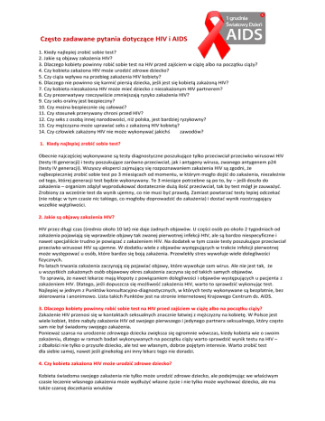 Często zadawane pytania dotyczące HIV i AIDS 1. Kiedy najlepiej zrobić sobie test? 2. Jakie są objawy zakażenia HIV? 3. Dlaczego kobiety powinny robić sobie test na HIV przed zajściem w ciążę albo na początku ciąży? 4. Czy kobieta zakażona HIV może urodzić zdrowe dziecko? 5. Czy ciąża wpływa na przebieg zakażenia HIV kobiety? 6. Dlaczego nie powinno się karmić piersią dziecka, jeśli jest się kobietą zakażoną HIV? 7. Czy kobieta niezakażona HIV może mieć dziecko z niezakażonym HIV partnerem? 8. Czy prezerwatywy rzeczywiście zmniejszają ryzyko zakażenia HIV? 9. Czy seks oralny jest bezpieczny? 10. Czy można bezpiecznie się całować? 11. Czy stosunek przerywany chroni przed HIV? 12. Czy seks z osobą innej narodowości, niż polska, jest bardziej ryzykowny? 13. Czy mężczyzna może uprawiać seks z zakażoną HIV kobietą? 14. Czy człowiek zakażony HIV nie może wykonywać jakichś zawodów? 1. Kiedy najlepiej zrobić sobie test? Obecnie najczęściej wykonywane są testy diagnostyczne poszukujące tylko przeciwciał przeciwko wirusowi HIV (testy III generacji) i testy poszukujące zarówno przeciwciał, jak i antygeny wirusa, zwanego antygenem p24 (testy IV generacji). Wszyscy eksperci zajmujący się rozpoznawaniem zakażenia HIV są zgodni, że najbezpieczniej zrobić sobie test po 3 miesiącach od momentu, w którym mogło dojść do zakażenia, niezależnie od tego, której generacji test będzie wykonywany. Te 3 miesiące potrzebne są po to, by – jeśli doszło do zakażenia – organizm zdążył wyprodukować dostatecznie dużą ilość przeciwciał, tak by test mógł je zauważyć. Zrobiony za wcześnie test da wynik ujemny, co nie musi być prawdą. Zamiast powtarzać testy lepiej odczekać (nie robiąc w tym czasie nic takiego, co mogłoby doprowadzić do zakażenia) i dostać wynik rozstrzygający wszelkie wątpliwości. 2. Jakie są objawy zakażenia HIV? HIV przez długi czas (średnio około 10 lat) nie daje żadnych objawów. U części osób po około 2 tygodniach od zakażenia pojawiają się wprawdzie objawy tak zwanej pierwotnej infekcji HIV, ale są bardzo niespecyficzne i nawet specjaliście trudno je powiązać z zakażeniem HIV. Na dodatek w tym czasie testy poszukujące przeciwciał przeciwko wirusowi HIV są ujemne. W dodatku wiele z objawów występujących w trakcie infekcji pierwotnej może występować u osób, które bardzo się boją zakażenia. Przewlekły stres wywołuje wiele dolegliwości fizycznych. Po latach trwania zakażenia zaczynają się pojawiać objawy, które wywołuje sam wirus. Ale nie jest tak, że u wszystkich zakażonych osób objawowy okres zakażenia zaczyna się od takich samych objawów. To sprawia, że nawet lekarze mają kłopoty z powiązaniem dolegliwości i objawów występujących u pacjenta z zakażeniem HIV. Dlatego, jeśli dopuszcza się możliwość zakażenia HIV, warto to sprawdzić wykonując test. Najlepiej w jednym z Punktów konsultacyjno-diagnostycznych, w których testy wykonywane są bezpłatnie, bez skierowania i anonimowo. Lista takich Punktów jest na stronie internetowej Krajowego Centrum ds. AIDS. 3. Dlaczego kobiety powinny robić sobie test na HIV przed zajściem w ciążę albo na początku ciąży? Zakażenie HIV przenosi się w kontaktach seksualnych znacznie łatwiej z mężczyzny na kobietę. W Polsce jest wiele kobiet, które nabyły zakażenie HIV od swojego pierwszego i jedynego partnera seksualnego, który często sam nie był świadomy swojego zakażenia. Ponieważ szansa na urodzenie zdrowego dziecka zwiększa się ogromnie wówczas, kiedy kobieta wie o swoim zakażeniu, dlatego w ramach badań wykonywanych na początku ciąży warto sprawdzić wynik testu na HIV – z dbałości nie tylko o przyszłe dziecko, ale też we własnym, dobrze pojętym interesie. Warto zrobić test dla siebie samej, nawet jeśli ginekolog ani inny lekarz tego nie doradzi. 4. Czy kobieta zakażona HIV może urodzić zdrowe dziecko? Kobieta świadoma swojego zakażenia nie tylko może urodzić zdrowe dziecko, ale podejmując we właściwym czasie leczenie własnego zakażenia może wydłużyć własne życie i nie tylko może wychować dziecko, ale ma także szansę doczekania wnuków 5. Czy ciąża wpływa na przebieg zakażenia HIV kobiety? W początkach epidemii HIV/AIDS, kiedy nie były jeszcze dostępne istniejące obecnie leki antyretrowirusowe, sądzono, że ciąża przyspiesza postęp zakażenia HIV do AIDS. Obecnie wiadomo już, u kobiety leczonej lekami antyretrowirusowymi ciąża nie pogarsza przebiegu zakażenia. Jedną z 3 dróg przenoszenia zakażenia jest możliwość przeniesienia go z matki na dziecko. Jeśli kobieta nie jest świadoma swojego zakażenia, wówczas ryzyko zakażenia swojego dziecka wynosi około 40%. Natomiast jeśli kobieta dowie się o swoim zakażeniu planując ciążę lub będąc na jej początku, będzie pozostawać w czasie ciąży pod opieką ginekologa, ciąż nie pogorszy przebiegu zakażenia. Nawet wielokrotne ciąże zakażonych HIV kobiet nie przyspieszają postępu zakażenia HIV. Warunkiem jest dokładne stosowanie się do zaleceń związanych z przyjmowaniem leków antyretrowirusowych. 6. Dlaczego nie powinno się karmić piersią dziecka, jeśli jest się kobietą zakażoną HIV? Wirus znajduje się w mleku kobiecym, a przewód pokarmowy noworodka jest wrażliwy na zakażenie HIV. Ponieważ ryzyko zakażenia dziecka przez kobietę nieświadomą zakażenia wynosi około 40%, więc nie powinno się dopuszczać dodatkowego ryzyka zakażenia. 7. Czy kobieta niezakażona HIV może mieć dziecko z zakażonym HIV partnerem? Od wielu lat już wiadomo, że same plemniki nie przenoszą wirusa HIV. Wirus znajduje się w innych komórkach znajdujących się w nasieniu i w płynie nasiennym. Znane są już metody oddzielania plemników od reszty nasienia. Podanie tak przygotowanych plemników nie powoduje zakażenia kobiety, a co za tym idzie 