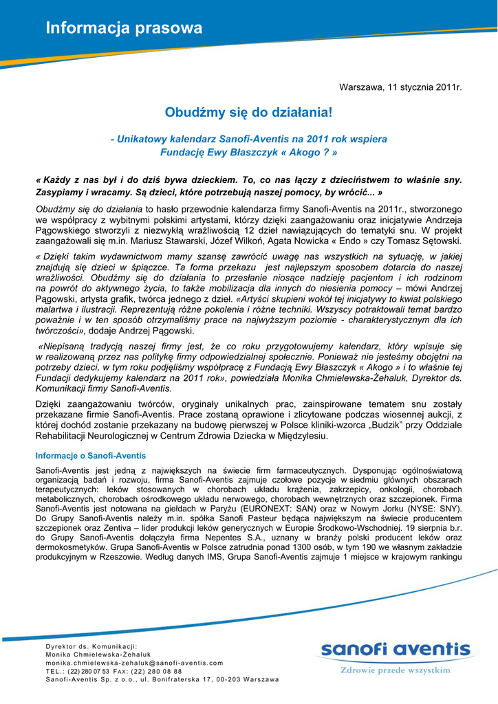 Informacja prasowa Warszawa, 11 stycznia 2011r. Obudźmy się do działania! - Unikatowy kalendarz Sanofi-Aventis na 2011 rok wspiera Fundację Ewy Błaszczyk « Akogo ? » « Każdy z nas był i do dziś bywa dzieckiem. To, co nas łączy z dzieciństwem to właśnie sny. Zasypiamy i wracamy. Są dzieci, które potrzebują naszej pomocy, by wrócić... » Obudźmy się do działania to hasło przewodnie kalendarza firmy Sanofi-Aventis na 2011r., stworzonego we współpracy z wybitnymi polskimi artystami, którzy dzięki zaangażowaniu oraz inicjatywie Andrzeja Pągowskiego stworzyli z niezwykłą wrażliwością 12 dzieł nawiązujących do tematyki snu. W projekt zaangażowali się m.in. Mariusz Stawarski, Józef Wilkoń, Agata Nowicka « Endo » czy Tomasz Sętowski. « Dzięki takim wydawnictwom mamy szansę zawrócić uwagę nas wszystkich na sytuację, w jakiej znajdują się dzieci w śpiączce. Ta forma przekazu jest najlepszym sposobem dotarcia do naszej wrażliwości. Obudźmy się do działania to przesłanie niosące nadzieję pacjentom i ich rodzinom na powrót do aktywnego życia, to także mobilizacja dla innych do niesienia pomocy – mówi Andrzej Pągowski, artysta grafik, twórca jednego z dzieł. «Artyści skupieni wokół tej inicjatywy to kwiat polskiego malartwa i ilustracji. Reprezentują różne pokolenia i różne techniki. Wszyscy potraktowali temat bardzo poważnie i w ten sposób otrzymaliśmy prace na najwyższym poziomie - charakterystycznym dla ich twórczości», dodaje Andrzej Pągowski. «Niepisaną tradycją naszej firmy jest, że co roku przygotowujemy kalendarz, który wpisuje się w realizowaną przez nas politykę firmy odpowiedzialnej społecznie. Ponieważ nie jesteśmy obojętni na potrzeby dzieci, w tym roku podjęliśmy współpracę z Fundacją Ewy Błaszczyk « Akogo » i to właśnie tej Fundacji dedykujemy kalendarz na 2011 rok», powiedziała Monika Chmielewska-Żehaluk, Dyrektor ds. Komunikacji firmy Sanofi-Aventis. Dzięki zaangażowaniu twórców, oryginały unikalnych prac, zainspirowane tematem snu zostały przekazane firmie Sanofi-Aventis. Prace zostaną oprawione i zlicytowane podczas wiosennej aukcji, z której dochód zostanie przekazany na budowę pierwszej w Polsce kliniki-wzorca „Budzik” przy Oddziale Rehabilitacji Neurologicznej w Centrum Zdrowia Dziecka w Międzylesiu. Informacje o Sanofi-Aventis Sanofi-Aventis jest jedną z największych na świecie firm farmaceutycznych. Dysponując ogólnoświatową organizacją badań i rozwoju, firma Sanofi-Aventis zajmuje czołowe pozycje w siedmiu głównych obszarach terapeutycznych: leków stosowanych w chorobach układu krążenia, zakrzepicy, onkologii, chorobach metabolicznych, chorobach ośrodkowego układu nerwowego, chorobach wewnętrznych oraz szczepionek. Firma Sanofi-Aventis jest notowana na giełdach w Paryżu (EURONEXT: SAN) oraz w Nowym Jorku (NYSE: SNY). Do Grupy Sanofi-Aventis należy m.in. spółka Sanofi Pasteur będąca największym na świecie producentem szczepionek oraz Zentiva – lider produkcji leków generycznych w Europie Środkowo-Wschodniej. 19 sierpnia b.r. do Grupy Sanofi-Aventis dołączyła firma Nepentes S.A., uznany w branży polski producent leków oraz dermokosmetyków. Grupa Sanofi-Aventis w Polsce zatrudnia ponad 1300 osób, w tym 190 we własnym zakładzie produkcyjnym w Rzeszowie. Według danych IMS, Grupa Sanofi-Aventis zajmuje 1 miejsce w krajowym rankingu Dyrektor ds. Komunikacji: Monika Chmielewska-Żehaluk [email protected] T E L . : ( 22) 280 07 53 F A X : ( 2 2 ) 2 8 0 0 8 8 8 Sanofi-Aventis Sp. z o.o., ul. Bonifraterska 17, 00-203 Warszawa największych firm farmaceutycznych. Sanofi-Aventis jest członkiem Związku Pracodawców Innowacyjnych Firm Farmaceutycznych INFARMA, Izby Gospodarczej Farmacja Polska, a także członkiem PASMI – Polskiego Związku Producentów Leków bez Recepty. Więcej informacji znajduje się na stronie www.sanofi-aventis.pl 2 Dyrektor ds. Komunikacji: Monika Chmielewska-Żehaluk [email protected] T E L . : ( 22) 280 07 53 F A X . : ( 2 2 ) 2 8 0 0 8 8 8 Sanofi-Aventis Sp. z o.o., ul. Bonifraterska 17, 00-203 Warszawa