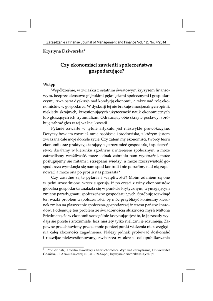 Zarz¹dzanie i Finanse Journal of Management and Finance Vol. 12, No. 4/2014 Krystyna Dziworska* Krystyna Dziworska Czy ekonomiœci zawiedli spo³eczeñstwa gospodaruj¹ce? Czy ekonomiœci zawiedli spo³eczeñstwa gospodaruj¹ce? Wstêp Wspó³czeœnie, w zwi¹zku z ostatnim œwiatowym kryzysem finansowym, bezprecedensowo g³êbokimi pêkniêciami spo³ecznymi i gospodarczymi, trwa ostra dyskusja nad kondycj¹ ekonomii, a tak¿e nad rol¹ ekonomistów w gospodarce. W dyskusji tej nie brakuje emocjonalnych opinii, niekiedy skrajnych, kwestionuj¹cych u¿ytecznoœæ nauk ekonomicznych lub g³osz¹cych ich tryumfalizm. Odrzucaj¹c obie skrajne postawy, spróbujê zabraæ g³os w tej wa¿nej kwestii. Pytanie zawarte w tytule artyku³u jest niezwykle prowokacyjne. Dotyczy bowiem równie¿ mnie osobiœcie i œrodowiska, z którym jestem zwi¹zana ca³e moje doros³e ¿ycie. Czy zatem my ekonomiœci, twórcy teorii ekonomii oraz praktycy, staraj¹cy siê zrozumieæ gospodarkê i spo³eczeñstwo, dzia³amy w kierunku zgodnym z interesem spo³ecznym, a mo¿e zatraciliœmy wra¿liwoœæ, mo¿e jednak zabrak³o nam wyobraŸni, mo¿e pos³ugujemy siê mitami i strzêpami wiedzy, a mo¿e rzeczywistoœæ gospodarcza wymknê³a siê nam spod kontroli i nie potrafimy nad ni¹ zapanowaæ, a mo¿e ona po prostu nas przerasta? Czy zasadne s¹ te pytania i w¹tpliwoœci? Moim zdaniem s¹ one w pe³ni uzasadnione, wrêcz sugeruj¹, i¿ po czêœci z winy ekonomistów globalna gospodarka znalaz³a siê w punkcie krytycznym, wymagaj¹cym zmiany paradygmatu spo³eczeñstw gospodaruj¹cych. Spróbujê rozwin¹æ ten wa¿ki problem wspó³czesnoœci, by móc przybli¿yæ konieczny kierunek zmian na p³aszczenie spo³eczno-gospodarczej interesu pañstw i narodów. Podejmujê ten problem ze œwiadomoœci¹ s³usznoœci myœli Miltona Friedmana, ¿e w ekonomii szczególnie fascynuj¹ce jest to, i¿ jej zasady wydaj¹ siê proste i zrozumia³e, lecz niestety tylko nieliczni je rozumiej¹. Zapewne przedstawiony przeze mnie poni¿ej punkt widzenia nie uwzglêdnia ca³ej z³o¿onoœci zagadnienia. Nale¿y jednak próbowaæ doskonaliæ i rozwijaæ niekwestionowany, zw³aszcza w okresie od opublikowania * Prof. dr hab., Katedra Inwestycji i Nieruchomoœci, Wydzia³ Zarz¹dzania, Uniwersytet Gdañski, ul. Armii Krajowej 101, 81-824 Sopot, [email protected] 106 Krystyna Dziworska przez Adama Smitha dzie³a pt.: Badania nad natur¹ i przyczynami bogactwa narodów, dorobek nauk ekonomicznych. Podejmuj¹c dyskusjê, warto na wstêpie nawi¹zaæ do tradycji keynesowskiej i opinii wybranych wspó³czesnych ekonomistów. John M. Keynes wyrazi³ znamienny pogl¹d, i¿: „Praktycy przekonani, ¿e nie podlegaj¹ ¿adnym wp³ywom intelektualnym, s¹ zazwyczaj niewolnikami idei jakiegoœ dawno zmar³ego ekonomisty. Praktycy (…) s¹ zazwyczaj niewolnikami idei jakiegoœ zapomnianego ekonomisty. (…) Prêdzej czy póŸniej w³aœnie idee, a nie interesy i przywileje, staj¹ siê groŸnym orê¿em dobrej lub z³ej s³awy” [Keynes, 2003, s. 350–351]. Zatem w opinii klasyka ekonomii idee oraz teorie ekonomii s¹ w istocie „religi¹” ekonomistów. Inaczej mówi¹c, ekonomiœci, wyjaœniaj¹c rzeczywistoœæ, przewiduj¹c przysz³oœæ i próbuj¹c j¹ naprawiaæ, s¹ jakoby kap³anami prowadz¹cymi do ziemi obiecanej. Keynes przestrzega³ zarazem: „Nied³ugo nadejdzie dzieñ, w którym zagadnienia ekonomiczne wróc¹ na nale¿ne miejsca, nasze serca i g³owy zajm¹ siê realnymi problemami – ¿ycia, relacji miêdzyludzkich, wszechœwiata, zachowañ i religii” [Keynes, 1946]. Wspó³czesny ekonomista R. Frydman podczas Europejskiego Kongresu Finansowego w Sopocie w 2013 roku tak oto stwierdzi³: „Nie uwa¿am, ¿e kryzys finansowy nale¿y traktowaæ jako pora¿kê kapitalizmu. Zamiast tego znacz¹c¹ czêœci¹ winy chcia³bym obarczyæ ekonomistów. To ich idee zwi¹zane z rol¹ i dzia³aniem rynków finansowych w gospodarkach kapitalistycznych da³y rzekomo naukow¹ podbudowê do decyzji politycznych i finansowych innowacji, które sprawi³y, ¿e kryzys sta³ siê bardziej prawdopodobny, wrêcz nieuchronny. (…) Zdolnoœæ rynku do niemal doskona³ego lokowania œrodków to w istocie mit w œcis³ym tego s³owa znaczeniu: albo jak okreœla to oksfordzki s³ownik jêzyka angielskiego „powszechnie wyznawane, lecz fa³szywe przekonanie”. Nie da siê go przekuæ w rzeczywistoœæ ¿adnymi œrodkami, ³¹cznie z polityk¹ nadzoru. Powód jest prosty: rzeczywista wartoœæ aktywów zmienia siê z czasem w sposób, którego nikt nie jest w stanie w pe³ni przewidzieæ. Z zasady nie mo¿e byæ ¿adnej „prawdziwej” wartoœci aktywów, któr¹ mogliby ustaliæ racjonalni uczestnicy rynku w warunkach konkurencji” [Frydman, 2013]. Podobn¹ i równie jednoznaczn¹ opiniê na temat nas samych wyra¿a T. Sedlacek, czeski ekonomista, w swoim dziele pt. Ekonomia dobra i z³a. Pisze bowiem: „My, ekonomiœci jesteœmy uczeni unikania normatywnych Czy ekonomiœci zawiedli spo³eczeñstwa gospodaruj¹ce? 107 ocen i opinii sugeruj¹cych, ¿e coœ jest dobre, a coœ z³e. Jednak wbrew temu co g³osz¹ nasze teksty naukowe, ekonomia jest dziedzin¹ w lwiej czêœci normatywn¹. Nie tylko opisuje œwiat, ale czêsto mówi tak¿e, jak on powinien wygl¹daæ (powinien byæ efektywny, mamy idea³ doskona³ej konkurencji, idea³ wysokiego wzrostu PKB przy niskiej inflacji, d¹¿enie do osi¹gania wysokiej konkurencyjnoœci…). W tym celu tworzymy modele – takie nowoczesne przypowieœci – które s¹ czêsto nierealistyczne (czêsto celowo) i maj¹ niewiele wspólnego z prawdziwym œwiatem. (…) Twierdzê, ¿e wiele g³ównych nurtów ekonomii pozbawia tê dziedzinê wielobarwnoœci i obsesyjnie oddaje czeœæ czarno-bia³emu homo economicus, które ignoruje kwestie dobra i z³a. Sami sobie zas³oniliœmy oczy i nie widzimy najwa¿niejszych si³ napêdzaj¹cych ludzkie dzia³ania” [Sedlacek, 2012, s. 19 i 21]. W odpowiedzi na nurt