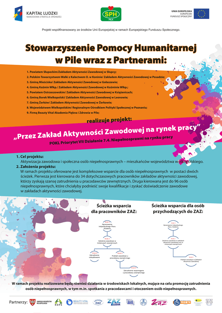 SPH PIŁA Projekt współfinansowany ze środków Unii Europejskiej w ramach Europejskiego Funduszu Społecznego. Stowarzyszenie Pomocy Humanitarnej w Pile wraz z Partnerami: 1. Powiatem Słupeckim/Zakładem Aktywności Zawodowej w Słupcy; 2. Polskim Towarzystwem Walki z Kalectwem O. w Koninie/ Zakładem Aktywności Zawodowej w Posadzie; 3. Gminą Mieścisko/ Zakładem Aktywności Zawodowej w Gołaszewie; 4. Gminą Koźmin Wlkp./ Zakładem Aktywności Zawodowej w Koźminie Wlkp.; 5. Powiatem Ostrzeszowskim/ Zakładem Aktywności Zawodowej w Książenicach; 6. Gminą Borek Wielkopolski/ Zakładem Aktywności Zawodowej w Leonowie; 7. Gminą Żerków/ Zakładem Aktywności Zawodowej w Żerkowie; 8. Województwem Wielkopolskim/ Regionalnym Ośrodkiem Polityki Społecznej w Poznaniu; 9. Firmą Beauty Vital Akademia Piękna i Zdrowia w Pile; realizuje projekt: ” y c a r p k e n y r a n j e w o d o w a Z i c ś o n w y t k A d a ł k racy p u k n y „Przez Za r a n i n w ra p s o ziałanie 7.4. Niepełn POKL Priorytet VII D 1. Cel projektu: Aktywizacja zawodowa i społeczna osób niepełnosprawnych – mieszkańców województwa wielkopolskiego. 2. Założenia projektu: W ramach projektu oferowane jest kompleksowe wsparcie dla osób niepełnosprawnych w postaci dwóch ścieżek. Pierwsza jest kierowana do 34 dotychczasowych pracowników zakładów aktywności zawodowej, którzy zyskają szansę zatrudnienia u pracodawców zewnętrznych. Druga kierowana jest do 96 osób niepełnosprawnych, które chciałyby podnieść swoje kwalifikacje i zyskać doświadczenie zawodowe w zakładach aktywności zawodowej. Ścieżka wsparcia dla pracowników ZAZ: Ścieżka wsparcia dla osób przychodzących do ZAZ: Krok 1 Opracowanie Indywidualnego Planu Działania Krok 1 Opracowanie Indywidualnego Planu Działania Krok 2 Szkolenia zawodowe w instytucjach zewnętrznych Krok 2 Szkolenia zawodowe w zakładach aktywności zawodowej oraz w instytucjach zewnętrznych Krok 3 Zatrudnienie subsydiowane Krok 3 Praktyki zawodowe u pracodawcy zewnętrznego Krok 3 Praktyki zawodowe w Zakładach Aktywności Zawodowej Krok 4 Zatrudnienie wspomagane u pracodawcy zewnętrznego W ramach projektu realizowane będą również działania w środowiskach lokalnych, mające na celu promocję zatrudnienia osób niepełnosprawnych, w tym m.in. spotkania z pracodawcami i otoczeniem osób niepełnosprawnych. Partnerzy: KSIĄŻENICE