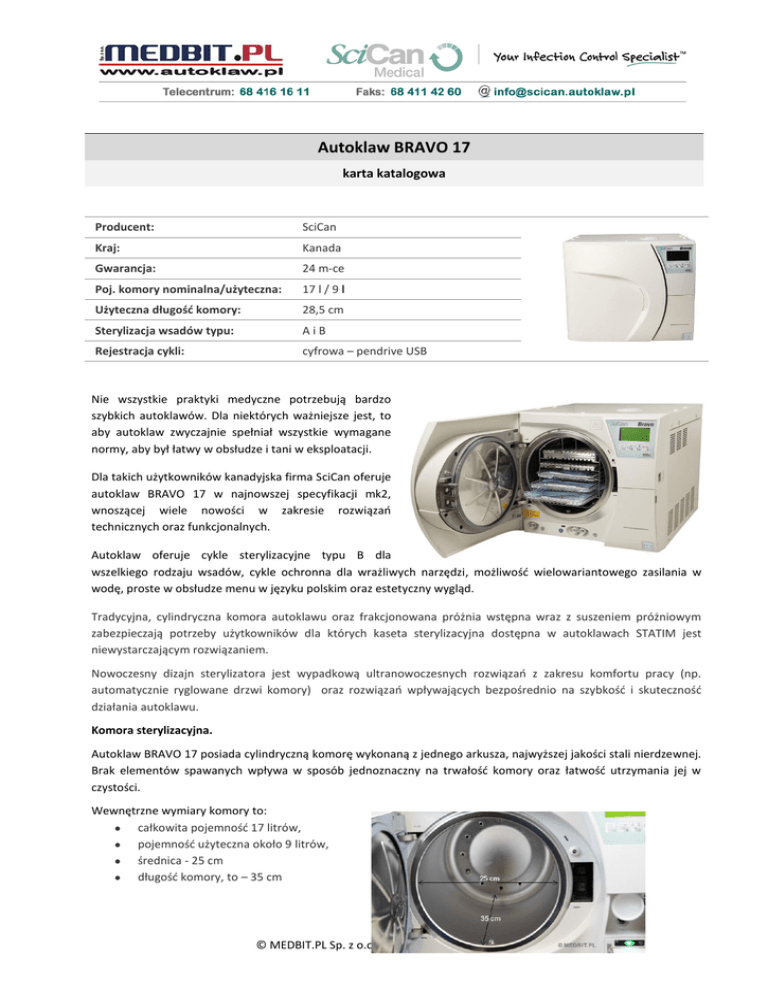 Autoklaw BRAVO 17 karta katalogowa Producent: SciCan Kraj: Kanada Gwarancja: 24 m-ce Poj. komory nominalna/użyteczna: 17 l / 9 l Użyteczna długość komory: 28,5 cm Sterylizacja wsadów typu: AiB Rejestracja cykli: cyfrowa – pendrive USB Nie wszystkie praktyki medyczne potrzebują bardzo szybkich autoklawów. Dla niektórych ważniejsze jest, to aby autoklaw zwyczajnie spełniał wszystkie wymagane normy, aby był łatwy w obsłudze i tani w eksploatacji. Dla takich użytkowników kanadyjska firma SciCan oferuje autoklaw BRAVO 17 w najnowszej specyfikacji mk2, wnoszącej wiele nowości w zakresie rozwiązań technicznych oraz funkcjonalnych. Autoklaw oferuje cykle sterylizacyjne typu B dla wszelkiego rodzaju wsadów, cykle ochronna dla wrażliwych narzędzi, możliwość wielowariantowego zasilania w wodę, proste w obsłudze menu w języku polskim oraz estetyczny wygląd. Tradycyjna, cylindryczna komora autoklawu oraz frakcjonowana próżnia wstępna wraz z suszeniem próżniowym zabezpieczają potrzeby użytkowników dla których kaseta sterylizacyjna dostępna w autoklawach STATIM jest niewystarczającym rozwiązaniem. Nowoczesny dizajn sterylizatora jest wypadkową ultranowoczesnych rozwiązań z zakresu komfortu pracy (np. automatycznie ryglowane drzwi komory) oraz rozwiązań wpływających bezpośrednio na szybkość i skuteczność działania autoklawu. Komora sterylizacyjna. Autoklaw BRAVO 17 posiada cylindryczną komorę wykonaną z jednego arkusza, najwyższej jakości stali nierdzewnej. Brak elementów spawanych wpływa w sposób jednoznaczny na trwałość komory oraz łatwość utrzymania jej w czystości. Wewnętrzne wymiary komory to: całkowita pojemność 17 litrów, pojemność użyteczna około 9 litrów, średnica - 25 cm długość komory, to – 35 cm © MEDBIT.PL Sp. z o.o. - www.scican.autoklaw.pl Pojemność użyteczna komory, to około 9 litrów. Skąd bierze się pojemność użyteczna. Przestrzeń użyteczna w komorze jest ograniczona stelażem i tackami, czyli mamy do czynienia z prostopadłościanem wpisanym w cylinder. Para wodna wytwarzana jest w generatorze znajdującym się poza komorą autoklawu. Dzięki temu czas potrzebny do uruchomienia procesu sterylizacji znacznie się skraca oraz poprawiają się warunki samego procesu. W komorze znajduje się stelaż na standardowe tacki druciane. Stelaż można swobodnie obracać lub bezproblemowo usunąć z komory, tak aby najlepiej dostosować autoklaw do aktualnych potrzeb załadunku. Możliwa jest również sterylizacja narzędzi w kontenerach i kasetach. W wyposażeniu standardowym znajdują się trzy tace o wymiarach 18x28 cm. Jest, to ilość wystarczająca do standardowej sterylizacji. Stelaż może pomieścić pięć tacek lub trzy kasety. Drzwi komory otwierane i zamykane są automatycznie. Jest, to bardzo komfortowe rozwiązanie, bezpośrednio wpływające na jakość codziennej obsługi autoklawu. © MEDBIT.PL Sp. z o.o. - www.scican.autoklaw.pl Panel sterowania. Autoklaw BRAVO 17 wyposażony jest w duży, graficzny wyświetlacz LCD prezentujący w języku polskim aktualny status urządzenia jak również umożliwiający jego banalnie prostą obsługę. Użytkownik ma do dyspozycji cztery, wielofunkcyjne przyciski za pomocą, których może w łatwy sposób wybierać i uruchamiać procesy sterylizacyjne jak również zmieniać ustawienia autoklawu. Programy sterylizacyjne. Cechą charakterystyczną autoklawów oferowanych przez firmę SciCan jest idea szybkiej i bezpiecznej sterylizacji wszelkiego typu narzędzi medycznych. Autoklaw BRAVO 17 umożliwia przeprowadzenie skutecznej sterylizacji opakowanych wsadów typu A już w 38 min wraz z niezwykle skutecznym suszeniem próżniowym. Dodatkowo program szybki umożliwia sterylizację wsadów nieopakowanych w niespełna 12 minut łącznie z suszeniem. Możliwa jest skuteczne i bezpieczna sterylizacja wszelkich narządzi medycznych poczynając od okulistyki, stomatologii, ginekologii i chirurgii oraz materiałów z gumy i tworzyw sztucznych. Orientacyjne czasy sterylizacji w autoklawie BRAVO 17 134C opakowane 134C nie opakowane 121C opakowane 121C nieopakowane Cykl szybki 43 min 38 min 58 min 53 min 16 min Archiwizacja. Autoklaw BRAVO 17 jest wyposażony we wbudowany system elektronicznej rejestracji cykli sterylizacyjnych. Jeden z najbardziej przyjaznych użytkownikowi systemów. Cykle zapisywane są na podłączonej do autoklawu pamięci pendrive z interfejsem USB. Aby zarchiwizować zapisane cykle wystarczy podłączyć pamięć do komputera i skopiować na jego dysk wszystkie wpisy za pomocą dostarczonej do autoklawu prostej aplikacji Data Flash pracującej w każdym systemie Windows. Rejestry są archiwizowane w katalogach, które usystematyzowane są według lat oraz miesięcy. Każdy rejestr można bardzo łatwo wydrukować na podłączonej do komputera drukarce lub zwyczajnie przejrzeć w oknie aplikacji. © MEDBIT.PL Sp. z o.o. - www.scican.autoklaw.pl Zasilanie w wodę. Autoklaw BRAVO 17 pracuje w systemie jednokrotnego obiegu wody. Oznacza, to że do każdego cyklu sterylizacyjnego używana jest świeża woda destylowana. Urządzenie posiada wbudowany zbiornik na wodę destylowaną oraz wbudowany zbiornik na skropliny. Dzięki temu autoklaw ma dużą autonomię pracy. Może zostać umieszczony niemal w dowolnym miejscu gabinetu lub kliniki. Autoklaw opcjonalnie posiada możliwość pobierania wody z sieci wodociągowej poprzez demineralizator oraz spust skroplin do kanalizacji. Podsumowanie. Autoklaw BRAVO 17 jest kolejnym, szybkim i bezpiecznym dla narzędzi autoklawem oferowanym przez kanadyjską firmę SciCan. Tradycyjna, cylindryczna komora z mobilnym stelażem daje duże możliwości jej aranżacji przez co autoklaw staje się jeszcze bardziej uniwersalny. Łatwość obsługi oraz autonomia pracy pozwalają wykorzystać ten autoklaw do sterylizacji wszelkich typów narzędzi w każdej praktyce lekarskiej oraz klinice. Bravo 17 stan