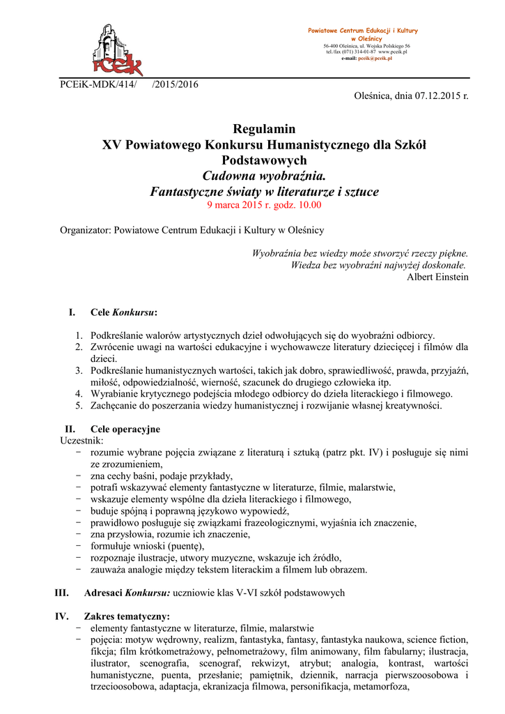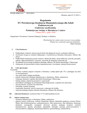 Powiatowe Centrum Edukacji i Kultury w Oleśnicy 56-400 Oleśnica, ul. Wojska Polskiego 56 tel./fax (071) 314-01-87 www.pceik.pl e-mail: [email protected] PCEiK-MDK/414/ /2015/2016 Oleśnica, dnia 07.12.2015 r. Regulamin XV Powiatowego Konkursu Humanistycznego dla Szkół Podstawowych Cudowna wyobraźnia. Fantastyczne światy w literaturze i sztuce 9 marca 2015 r. godz. 10.00 Organizator: Powiatowe Centrum Edukacji i Kultury w Oleśnicy Wyobraźnia bez wiedzy może stworzyć rzeczy piękne. Wiedza bez wyobraźni najwyżej doskonałe. Albert Einstein I. Cele Konkursu: 1. Podkreślanie walorów artystycznych dzieł odwołujących się do wyobraźni odbiorcy. 2. Zwrócenie uwagi na wartości edukacyjne i wychowawcze literatury dziecięcej i filmów dla dzieci. 3. Podkreślanie humanistycznych wartości, takich jak dobro, sprawiedliwość, prawda, przyjaźń, miłość, odpowiedzialność, wierność, szacunek do drugiego człowieka itp. 4. Wyrabianie krytycznego podejścia młodego odbiorcy do dzieła literackiego i filmowego. 5. Zachęcanie do poszerzania wiedzy humanistycznej i rozwijanie własnej kreatywności. II. Cele operacyjne Uczestnik: - rozumie wybrane pojęcia związane z literaturą i sztuką (patrz pkt. IV) i posługuje się nimi ze zrozumieniem, - zna cechy baśni, podaje przykłady, - potrafi wskazywać elementy fantastyczne w literaturze, filmie, malarstwie, - wskazuje elementy wspólne dla dzieła literackiego i filmowego, - buduje spójną i poprawną językowo wypowiedź, - prawidłowo posługuje się związkami frazeologicznymi, wyjaśnia ich znaczenie, - zna przysłowia, rozumie ich znaczenie, - formułuje wnioski (puentę), - rozpoznaje ilustracje, utwory muzyczne, wskazuje ich źródło, - zauważa analogie między tekstem literackim a filmem lub obrazem. III. IV. Adresaci Konkursu: uczniowie klas V-VI szkół podstawowych Zakres tematyczny: - elementy fantastyczne w literaturze, filmie, malarstwie - pojęcia: motyw wędrowny, realizm, fantastyka, fantasy, fantastyka naukowa, science fiction, fikcja; film krótkometrażowy, pełnometrażowy, film animowany, film fabularny; ilustracja, ilustrator, scenografia, scenograf, rekwizyt, atrybut; analogia, kontrast, wartości humanistyczne, puenta, przesłanie; pamiętnik, dziennik, narracja pierwszoosobowa i trzecioosobowa, adaptacja, ekranizacja filmowa, personifikacja, metamorfoza, - cechy baśni, - związki frazeologiczne kojarzące się ze znanymi baśniami oraz postawami bohaterów utworów o tematyce dziecięcej, - twórczość (dotyczącej literatury dziecięcej) polskich ilustratorów wymienionych w pkt.V. V. Bibliografia LITERATURA Joanne Kathleen Rowling Harry Potter i kamień filozoficzny Clive Staples Lewis Opowieści z Narnii: Lew, czarownica i stara szafa Dorota Terakowska Córka Czarownic Jean Michel Payet 2065. Zatopione miasto Oscar Wilde Szczęśliwy książę Baśnie Hans Christiana Andersena (Dziewczynka z zapałkami, Królowa Śniegu, Calineczka, Brzydkie kaczątko, Mała syrenka, Anioł, Świniopas), braci Grimm (Śpiąca królewna, Muzykanci z Bremy), Charlesa Perrault (Wróżki, Kopciuszek) Do wyboru: Popławska Anna i in.: Słownik terminów literackich. 2008, Wyd. Greg Szary Lucyna: Ilustrowany słownik frazeologiczny. 2012, Wyd. Greg Białek Małgorzata: Ilustrowany słownik przysłów. 2012, Wyd.Greg Sopol Elżbieta: Słownik frazeologiczny PWN z Bralczykiem. 2008, PWN http://www.wiking.edu.pl/article.php?id=621 http://sjp.pwn.pl/ http://przyslowia-polskie.pl/ http://basnie.republika.pl/motywy.htm FILMY Harry Potter i kamień filozoficzny, reż. Cris Columbus, 2001 Lew, czarownica i stara szafa, reż. Andrew Adamson, 2005 Złoty kompas, reż. Chris Weitz, 2007 Wally E., reż Andrew Stanton, 2008 Hugo i jego wynalazek, reż. Martin Scorsese, 2011 ILUSTRACJE (baśni i książek dla dzieci) Jana Marcina Szancera, Marii Orłowskiej-Gabryś, Jerzego Srokowskiego, Bohdana Butenki, Olgi Siemaszko, Jerzego Skarżyńskiego, Bożeny Truchanowskiej-Majchrzak, Janusza Grabiańskiego, Józefa Wilkonia, Antoniego Boratyńskiego, Ignacego Witza, Kazimierza Mikulskiego, Krystyny Witkowskiej, Zofii Fijałkowskiej i Jerzego Flisaka. Dodatkowo w FINALE POWIATOWYM: MUZYKA Motywy muzyczne z filmów w wersji polskiej, np.: Naprawdę chcę z „Małej syrenki” https://www.youtube.com/watch?v=Pf-w29hcLcA Mam tę moc z „Krainu Lodu” https://www.youtube.com/watch?v=5BSY_bsfIvk Kolorowy wiatr z „Pocahontas” https://www.youtube.com/watch?v=4udfZegF4RM Chcę wolnym być z „Mustanga z Dzikiej Doliny” https://www.youtube.com/watch?v=TK6bBNBf5w Ze snem budzą się marzenia z „Kopciuszka” https://www.youtube.com/watch?v=16BRC8uvJgo Miłość rośnie wokół nas z „Króla Lwa” https://www.youtube.com/watch?v=DrXSXYfYV0o oraz znane utwory instrumentalne, motywy z widowisk scenicznych lub filmów, np.: W. A. Mozart „Czarodziejski flet” P. Czajkowski „Dziadek do orzechów” N. Rimski-Korsakow „Bajka o carze Sałtanie” S. Prokofiew „Kopciuszek” VI. Organizacja i przebieg Konkursu: 1. Eliminacje szkolne (etap I). Dyrektor powołuje Szkolną Komisję Konkursową, do której obowiązków należy: - zapoznanie uczniów z Regulaminem, - organizacja eliminacji szkolnych - 31 stycznia 2016 r. - wyłonienie uczestników do etapu miejsko-gminnego (szkoła może zgłosić maksymalnie 4 osoby) na zasadach ustalonych wewnętrznie, - do dnia 16 lutego 2016 r. szkoły przesyłają informacje o ilości uczestników etapu szkolnego oraz wykazu uczniów zakwalifikowanych do etapu miejsko-gminnego na adres: - [email protected] na załączonej karcie zgłoszeniowej. Karta zgłoszeniowa powinna być w programie Woord – załącznik nr 1 - Zadania konkursowe przygotowuje Szkolna Komisja Konkursowa 2. Eliminacje miejsko-gminne (etap II) odbędą się pod kierunkiem Komisji Konkursowej powołanej przez dyrektora PCEiK, w następujących szkołach w dniu 19 lutego 2016 r. - Miasto Oleśnica – Szkoła Podstawowa nr 2 w 