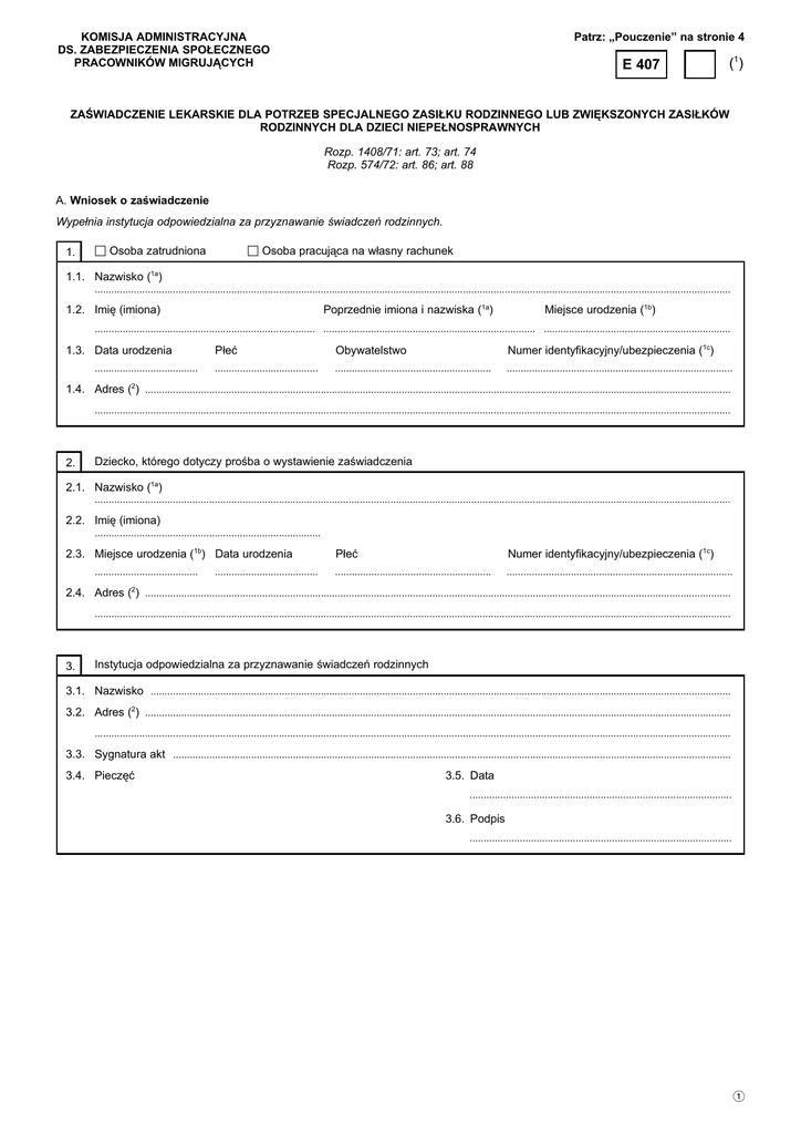 Patrz: „Pouczenie” na stronie 4 KOMISJA ADMINISTRACYJNA DS. ZABEZPIECZENIA SPOŁECZNEGO PRACOWNIKÓW MIGRUJĄCYCH E 407 (1) ZAŚWIADCZENIE LEKARSKIE DLA POTRZEB SPECJALNEGO ZASIŁKU RODZINNEGO LUB ZWIĘKSZONYCH ZASIŁKÓW RODZINNYCH DLA DZIECI NIEPEŁNOSPRAWNYCH Rozp. 1408/71: art. 73; art. 74 Rozp. 574/72: art. 86; art. 88 A. Wniosek o zaświadczenie Wypełnia instytucja odpowiedzialna za przyznawanie świadczeń rodzinnych. 1. n Osoba zatrudniona n Osoba pracująca na własny rachunek 1.1. Nazwisko (1a) .................................................................................................................................................................................................................................... Poprzednie imiona i nazwiska (1a) 1.2. Imię (imiona) Miejsce urodzenia (1b) ............................................................................... ............................................................................ ................................................................... 1.3. Data urodzenia ..................................... Płeć Obywatelstwo Numer identyfikacyjny/ubezpieczenia (1c) ..................................... ........................................................ ................................................................................. 2 1.4. Adres ( ) .................................................................................................................................................................................................................. .................................................................................................................................................................................................................................... 2. Dziecko, którego dotyczy prośba o wystawienie zaświadczenia 2.1. Nazwisko (1a) .................................................................................................................................................................................................................................... 2.2. Imię (imiona) ................................................................................. 2.3. Miejsce urodzenia (1b) Data urodzenia ..................................... ..................................... Płeć Numer identyfikacyjny/ubezpieczenia (1c) ........................................................ ................................................................................. 2 2.4. Adres ( ) .................................................................................................................................................................................................................. .................................................................................................................................................................................................................................... 3. Instytucja odpowiedzialna za przyznawanie świadczeń rodzinnych 3.1. Nazwisko ................................................................................................................................................................................................................ 3.2. Adres (2) .................................................................................................................................................................................................................. .................................................................................................................................................................................................................................... 3.3. Sygnatura akt ........................................................................................................................................................................................................ 3.4. Pieczęć 3.5. Data .............................................................................................. 3.6. Podpis .............................................................................................. 1 E 407 B. Zaświadczenie Lekarz wyznaczony przez instytucję w miejscu zamieszkania badanego dziecka powinien wypełnić tę stronę i następną oraz przesłać formularz do instytucji wskazanej w punkcie 3, załączając wszystkie dokumenty medyczne (zdjęcia, zdjęcia rentgenowskie, wyniki badań medycznych itp.) (4). 4. 4.1. Wiek dziecka w dniu badania: ........................................................................ lat ........................................................................ miesięcy Waga dziecka: ............................. kilogramów ............................. gramów wzrost: ............................................... centymetrów 4.2. Opóźnienie rozwoju psychomotorycznego Opóźnienie w odniesieniu do poziomu normalnego dla wieku dziecka: n Tak n Nie Jeśli tak, proszę je określić: ................................................................................................................................................................................ 4.3. Samodzielność Czy dziecko potrafi samo usiąść? Czy potrafi mówić? Czy potrafi samo jeść? n Tak n Tak n Tak n Nie n Nie n Nie Czy potrafi chodzić? Czy potrafi się samo ubrać? Czy potrafi pisać? Czy dziecko nie trzyma moczu lub stolca? n n n n Tak Tak Tak Tak n n n n Nie Nie Nie (3) Nie (3) 4.4. Pomoc n Tak n Nie Czy stan dziecka wymaga opieki osoby trzeciej? n Tak n Nie n Tak n Nie Stałej opieki? Codziennej opieki, ale nie ciągłej? Lub innych środków (proszę podać jakich): .................................................................................................................................................... 4.5. Charakter głównej niezdolności Czy niezdolność dziecka ma charakter czuciowy? wzrokowy? ...........................................................