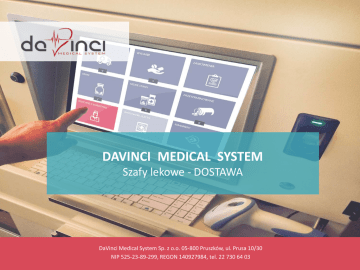DAVINCI MEDICAL SYSTEM Szafy lekowe - DOSTAWA DaVinci Medical System Sp. z o.o. 05-800 Pruszków, ul. Prusa 10/30 NIP 525-23-89-299, REGON 140927984, tel. 22 730 64 03 Wersja 1.0 Ładowanie leków z apteki do szafy 2 DaVinci Medical System Sp. z o.o. 05-800 Pruszków, ul. Prusa 10/30 NIP 525-23-89-299, REGON 140927984, tel. 22 730 64 03 Wersja 1.0 Ładowanie leków z apteki do szafy 1 W celu uruchomienia procesu ładowania szafy, klikamy przycisk „DOSTAWA”. 2 Po zalogowaniu się do systemu zobaczymy listę z historią wszystkich dostaw leków. Pojawi się nam okno logowania, w którym wpisujemy login oraz hasło, a następnie klikamy przycisk „ZALOGUJ”. * Głównym sposobem, aby zalogować się do systemu, jest użycie karty magnetycznej. 3 3 DaVinci Medical System Sp. z o.o. 05-800 Pruszków, ul. Prusa 10/30 NIP 525-23-89-299, REGON 140927984, tel. 22 730 64 03 Wersja 1.0 Ładowanie leków z apteki do szafy Klikając na ikonę przedstawioną na rys. 1 przejdziemy do zakładki wyświetlającej elementy importu w danej dostawie. 1 2 Pojawi się lista leków załadowanych i oczekujących na zatwierdzenie. W celu załadowania leku, należy wczytać lek czytnikiem z kodu kreskowego. Po wczytaniu leku status „Przyjęty” zostanie zmieniony na status „Załadowany”. 4 DaVinci Medical System Sp. z o.o. 05-800 Pruszków, ul. Prusa 10/30 NIP 525-23-89-299, REGON 140927984, tel. 22 730 64 03 Wersja 1.0 Ładowanie leków z apteki do szafy W celu zatwierdzenia i ostatecznego dodania stanu leków do szafy, po przyjęciu dostawy, klikamy przycisk „ZAPISZ”. Jeżeli nie wszystkie leki będziemy chcieli dodać do stanu naszej szafy klikamy „ODRZUĆ OCZEKUJĄCE I ZAPISZ”. Leki niewczytane należy zwrócić do miejsca, z jakiego były wydane. 1 Widoczny wcześniej status dostawy „Do przyjęcia” zostanie zmieniony na „Przyjęty”. 2 5 DaVinci Medical System Sp. z o.o. 05-800 Pruszków, ul. Prusa 10/30 NIP 525-23-89-299, REGON 140927984, tel. 22 730 64 03 Wersja 1.0 Ładowanie leków spoza apteki do szafy Ładowanie leków spoza apteki do szafy 6 DaVinci Medical System Sp. z o.o. 05-800 Pruszków, ul. Prusa 10/30 NIP 525-23-89-299, REGON 140927984, tel. 22 730 64 03 Wersja 1.0 Ładowanie leków spoza apteki do szafy 1 W celu uruchomienia procesu ładowania szafy, klikamy przycisk „DOSTAWA”. 2 Po zalogowaniu się do systemu zobaczymy listę z historią wszystkich dostaw leków. Pojawi się nam okno logowania, w którym wpisujemy login oraz hasło, a następnie klikamy przycisk „ZALOGUJ”. * Głównym sposobem, aby zalogować się do systemu, jest użycie karty magnetycznej. 3 7 DaVinci Medical System Sp. z o.o. 05-800 Pruszków, ul. Prusa 10/30 NIP 525-23-89-299, REGON 140927984, tel. 22 730 64 03 Wersja 1.0 Ładowanie leków spoza apteki do szafy Klikamy przycisk „ŁADOWANIE” w celu dodania nowego koszyka z listą leków. 1 2 Pojawi okno w którym należy zeskanować opakowania z lekami aby znalazły się na szafie lekowej. 8 DaVinci Medical System Sp. z o.o. 05-800 Pruszków, ul. Prusa 10/30 NIP 525-23-89-299, REGON 140927984, tel. 22 730 64 03 Wersja 1.0 Ładowanie leków spoza apteki do szafy 1 W pierwszej kolejności skanujemy lub wpisujemy kod zewnętrzny (EAN) opakowania. Jeżeli kod nie zostanie wczytany potwierdzamy przyciskiem „ZATWIERDŹ”. 2 Następnie skanujemy lub podajemy kod wewnętrzny opakowania przydzielony przez jednostkę szpitalną. Pozycje z lekami będą dodawanie na liście. Będzie tam widoczna nazwa leku, kod opakowania, kod wewnętrzny, itp. Jeżeli kod nie zostanie wczytany potwierdzamy przyciskiem „ZATWIERDŹ”. 3 9 DaVinci Medical System Sp. z o.o. 05-800 Pruszków, ul. Prusa 10/30 NIP 525-23-89-299, REGON 140927984, tel. 22 730 64 03 Wersja 1.0 Ładowanie leków spoza apteki do szafy W celu zakończenia dodawaniu koszyka do szafy klikamy przycisk „X”. 1 2 Nowa pozycja zostanie dodana do listy, a opakowania z lekami w tym momencie są gotowe do rozchodu na pacjentów. 10 DaVinci Medical System Sp. z o.o. 05-800 Pruszków, ul. Prusa 10/30 NIP 525-23-89-299, REGON 140927984, tel. 22 730 64 03