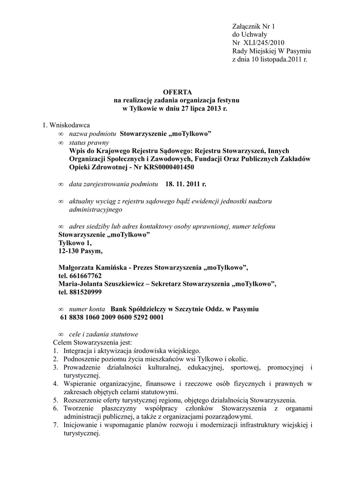 Załącznik Nr 1 do Uchwały Nr XLI/245/2010 Rady Miejskiej W Pasymiu z dnia 10 listopada.2011 r. OFERTA na realizację zadania organizacja festynu w Tylkowie w dniu 27 lipca 2013 r. 1. Wniskodawca • nazwa podmiotu Stowarzyszenie „moTylkowo” • status prawny Wpis do Krajowego Rejestru Sądowego: Rejestru Stowarzyszeń, Innych Organizacji Społecznych i Zawodowych, Fundacji Oraz Publicznych Zakładów Opieki Zdrowotnej - Nr KRS0000401450 • data zarejestrowania podmiotu • aktualny wyciąg z rejestru sądowego bądź ewidencji jednostki nadzoru administracyjnego 18. 11. 2011 r. • adres siedziby lub adres kontaktowy osoby uprawnionej, numer telefonu Stowarzyszenie „moTylkowo” Tylkowo 1, 12-130 Pasym, Małgorzata Kamińska - Prezes Stowarzyszenia „moTylkowo”, tel. 661667762 Maria-Jolanta Szuszkiewicz – Sekretarz Stowarzyszenia „moTylkowo”, tel. 881520999 • numer konta Bank Spółdzielczy w Szczytnie Oddz. w Pasymiu 61 8838 1060 2009 0600 5292 0001 • cele i zadania statutowe Celem Stowarzyszenia jest: 1. Integracja i aktywizacja środowiska wiejskiego. 2. Podnoszenie poziomu życia mieszkańców wsi Tylkowo i okolic. 3. Prowadzenie działalności kulturalnej, edukacyjnej, sportowej, promocyjnej i turystycznej. 4. Wspieranie organizacyjne, finansowe i rzeczowe osób fizycznych i prawnych w zakresach objętych celami statutowymi. 5. Rozszerzenie oferty turystycznej regionu, objętego działalnością Stowarzyszenia. 6. Tworzenie płaszczyzny współpracy członków Stowarzyszenia z organami administracji publicznej, a także z organizacjami pozarządowymi. 7. Inicjowanie i wspomaganie planów rozwoju i modernizacji infrastruktury wiejskiej i turystycznej. 8. Wspieranie inicjatyw społecznych w zakresie dobroczynności, kultury, kultury fizycznej i promocji: kultury, zdrowia, sportu, ochrony dóbr dziedzictwa kulturowego, ochrony środowiska, edukacji i rozwoju gospodarczego. 9. Wspieranie współpracy europejskiej, szczególnie w odniesieniu do środowisk lokalnych. 10. Rozwijanie i popularyzowanie postaw filantropijnych sprzyjających rozwojowi społecznemu i gospodarczemu. Stowarzyszenie realizuje swoje cele poprzez: 1. organizowanie spotkań, szkoleń i konferencji, 2. gromadzenie funduszy na realizację celów statutowych, 3. rozdzielanie funduszy na cele dobroczynne w dziedzinie: kultury, oświaty i wychowania, sportu, kultury fizycznej, ochrony zabytków, ochrony środowiska , rozwoju gospodarczego i spraw obywatelskich, 4. prowadzenie programów stypendialnych, 5. prowadzenie działalności integracyjnej członków Stowarzyszenia, 6. współpracę z innymi organizacjami wspierającymi inicjatywy lokalne, 7. współpracę z organizacjami krajowymi i zagranicznymi w zakresie pozyskiwania środków, wymiany doświadczeń i realizacji wspólnych programów dobroczynnych, 8. świadczenie usług dla donatorów w realizacji celów dobroczynnych, 9. świadczenie usług dla firm w zakresie umów sponsoringu, 10. podejmowanie wszelkich innych działań służących rozwojowi społeczności lokalnych oraz realizacji celów Stowarzyszenia. • dotychczasowe przedsięwzięcia i osiągnięte efekty w zakresie realizacji zadań o charakterze społecznie użytecznym Stowarzyszenie „moTylkowo” istnieje od 18 listopada 2011 r. w 2012 r. W lipcu 2013 r. zrealizowało we wsi Tylkowo Festyn „motylkowo” 2012 na który pozyskało środki finansowe w ramach działania 413 Wdrażanie lokalnych strategii rozwoju dla małych projektów, tj. operacji, które nie odpowiadają warunkom przyznania pomocy w ramach działań Osi 3 ale przyczyniają się do osiągnięcia celów tej osi. 2. Określenie celu dofinansowania: • Rodzaj przedsięwzięcia Organizacja festynu w Tylkowie „PONADLOKALNY FESTIWAL MUZYKI DISCO POLO” , który odbędzie się w dniu 27 lipca 2013 r. w godz. 16.00 -24.00 na wydzielonej części boiska wiejskiego w ramach: Upowszechniania kultury, wspierania działań i inicjatyw kulturalnych promujących gminę – organizacja zajęć kulturalnych dla dzieci i młodzieży oraz mieszkańców gminy. 3. Harmonogram realizacji: • Data rozpoczęcia i zakończenia: od 15.06. 2013 r. do 30.08.2013 r., 1. 15 czerwca – 30 czerwca 2013 r. – opracowanie scenariusza festynu, przygotowanie projektów reklamowych imprezy, pozyskanie artystów i DJ w celu poprowadzenia zabawy tanecznej, pozyskanie stoisk handlowych, kiermaszowych i innych atrakcji w postaci kul wodnych i zjeżdżalni dmuchanych dla dzieci, podpisanie umowy na ochronę, wynajem toalet chemicznych, druku plakatów, zamieszczenie informacji w prasie lokalnej 2. 01 lipca 20 lipca 2013 r. – rozreklamowanie imprezy na terenie Gminy Pasym, Przygotowanie terenu imprezy: ustawienie sceny, wydzielenie terenu zabawy, wydzielenie miejsc na stoiska handlowe, kiermasze i inne atrakcje w postaci kul wodnych i zjeżdżalni dmuchanych dla dzieci 3. 27 lipca 2013 r. godz:16.00 – 24.00 – boisko wiejskie we wsi Tylkowo - realizacja projektu – przeprowadzenie operacji „PONADLOKALNY FESTIWAL MUZYKI DISCO POLO” 4. 27 lipca – 30 sierpnia 2013 r. rozliczenie imprezy: przedstawienie rozliczenia finansowego, wykonanie sprawozdania z realizacji zadania publicznego. • możliwości kontynuacji: „PONADLOKALNY FESTIWAL MUZYKI DISCO POLO” to impreza, która może być realizowana przez Stowarzyszenie „moTylkowo” następnym roku. 4. Przewidywany całkowity koszt realizacji i jego kalkulacja: 13733,00zł • wynajem ochrony – 1 574,40 zł (20 zł x 8 godz. x 8 ochroniarzy – 23% VAT). • wynajem 2 toalet – 298,08 zł ( 1 toaleta -138,00,zł + 8% VAT) • gaże artystów i DJ – 10168,52 zl (brutto) • gorący posiłek dla artystów amatorów – 300,- zł • nagrody rzeczowe do konkursów dla dzieci i dorosłych – 900,00 zł (brutto) • reklama: plakaty – 100 szt. – 492,00- (400,- zł + 23%VAT) 5. Kwota wnioskowanej dotacji w złotych – 4.750,00 zł (cztery tysiące siedemset pięćdziesiąt) 6 