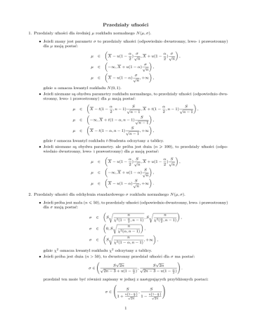 Przedziały ufności 1. Przedziały ufności dla średniej µ rozkładu normalnego N (µ, σ). • Jeżeli znany jest parametr σ to przedziały ufności (odpowiednio dwustronny, lewo- i prawostronny) dla µ mają postać: α σ α σ µ ∈ X − u(1 − ) √ , X + u(1 − ) √ , 2 2 n n σ µ ∈ −∞, X + u(1 − α) √ , n σ µ ∈ X − u(1 − α) √ , +∞ , n gdzie u oznacza kwantyl rozkładu N (0, 1). • Jeżeli nieznane są obydwa parametry rozkładu normalnego, to przedziały ufności (odpowiednio dwustronny, lewo- i prawostronny) dla µ mają postać: α S α S , X + t(1 − , n − 1) √ X − t(1 − , n − 1) √ , µ ∈ 2 2 n−1 n−1 S , µ ∈ −∞, X + t(1 − α, n − 1) √ n−1 S µ ∈ , +∞ , X − t(1 − α, n − 1) √ n−1 gdzie t oznacza kwantyl rozkładu t-Studenta odczytany z tablicy. • Jeżeli nieznane są obydwa parametry. ale próba jest duża (n 100), to przedziały ufności (odpowiednio dwustronny, lewo- i prawostronny) dla µ mają postać: α S α S µ ∈ X − u(1 − ) √ , X + u(1 − ) √ , 2 2 n n S µ ∈ −∞, X + u(1 − α) √ , n S X − u(1 − α) √ , +∞ . µ ∈ n 2. Przedziały ufności dla odchylenia standardowego σ rozkładu normalnego N (µ, σ). • Jeżeli próba jest mała (n ¬ 50), to przedziały ufności (odpowiednio dwustronny, lewo- i prawostronny) dla σ mają postać: r r n n σ ∈ S , S , χ2 (1 − α2 , n − 1) χ2 ( α2 , n − 1) r n , σ ∈ 0, S χ2 (α, n − 1) r n σ ∈ S , +∞ , χ2 (1 − α, n − 1) gdzie χ2 oznacza kwantyl rozkładu χ2 odczytany z tablicy. • Jeżeli próba jest duża (n > 50), to dwustronny przedział ufności dla σ ma postać: ! √ √ S 2n S 2n σ∈ √ ,√ . 2n − 3 + u(1 − α2 ) 2n − 3 − u(1 − α2 ) przedział ten może być również zapisany w jednej z następujących przybliżonych postaci: S S σ∈ , u(1− α ) u(1− α ) 1 + √2n2 1 − √2n2 1 lub σ∈ α S α S √ ,S + u 1 − √ S−u 1− 2 2 2n 2n 3. Przedział ufności dla wskaźnika struktury. Przedział ufności dla wskaźnika struktury (frakcji elementów wyróżnionych) p w przypadku dużych prób (n 100) ma postać: ! r r m m m m m α α n (1 − n ) m n (1 − n ) p∈ − u(1 − ) , + u(1 − ) , n 2 n n 2 n gdzie m oznacza liczbę elementów wyróżnionych w próbie, oznaczając przez p0 = m n wskaźnik struktury wyliczony z próby, wzór powyższy zapiszemy w prostszej postaci: ! r r p0 (1 − p0 ) α p0 (1 − p0 ) α , , p0 + u(1 − ) p ∈ p0 − u(1 − ) 2 n 2 n 4. Przedział ufności dla średniej w rozkładzie dowolnym. Jeżeli λ jest parametrem pełniącym rolę wartości oczekiwanej w dowolnym rozkładzie (np. rozkładzie wykładniczym lub Poissona), natomiast próba jest duża (n 100), to obustronny przedział ufności dla λ ma postać: α S α S λ ∈ X − u(1 − ) √ , X + u(1 − ) √ , 2 2 n n S λ ∈ −∞, X + u(1 − α) √ , n S X − u(1 − α) √ , +∞ . λ ∈ n 2
