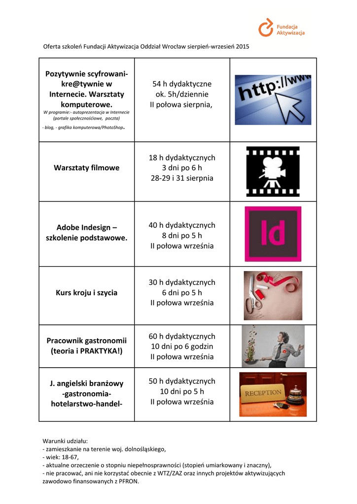 Oferta szkoleń Fundacji Aktywizacja Oddział Wrocław sierpień-wrzesień 2015 Pozytywnie scyfrowanikre@tywnie w Internecie. Warsztaty komputerowe. W programie:- autoprezentacja w Internecie (portale społecznośćiowe, poczta) - blog, - grafika komputerowa/PhotoShop 54 h dydaktyczne ok. 5h/dziennie II połowa sierpnia, . Warsztaty filmowe 18 h dydaktycznych 3 dni po 6 h 28-29 i 31 sierpnia Adobe Indesign – szkolenie podstawowe. 40 h dydaktycznych 8 dni po 5 h II połowa września Kurs kroju i szycia 30 h dydaktycznych 6 dni po 5 h II połowa września Pracownik gastronomii (teoria i PRAKTYKA!) 60 h dydaktycznych 10 dni po 6 godzin II połowa września J. angielski branżowy -gastronomiahotelarstwo-handel- 50 h dydaktycznych 10 dni po 5 h II połowa września Warunki udziału: - zamieszkanie na terenie woj. dolnośląskiego, - wiek: 18-67, - aktualne orzeczenie o stopniu niepełnosprawności (stopień umiarkowany i znaczny), - nie pracować, ani nie korzystać obecnie z WTZ/ZAZ oraz innych projektów aktywizujących zawodowo finansowanych z PFRON. Informacje i zapisy: Dominika Zaskórska Asystent Koordynatora Fundacja Aktywizacja Centrum Edukacji i Aktywizacji Osób Niepełnosprawnych we Wrocławiu Pl. Strzelecki 25, 50-224 Wrocław tel. +48 511 944 126 [email protected] www.aktywizacja.org.pl/wroclaw www.facebook.com/CEiAZON.WROCLAW