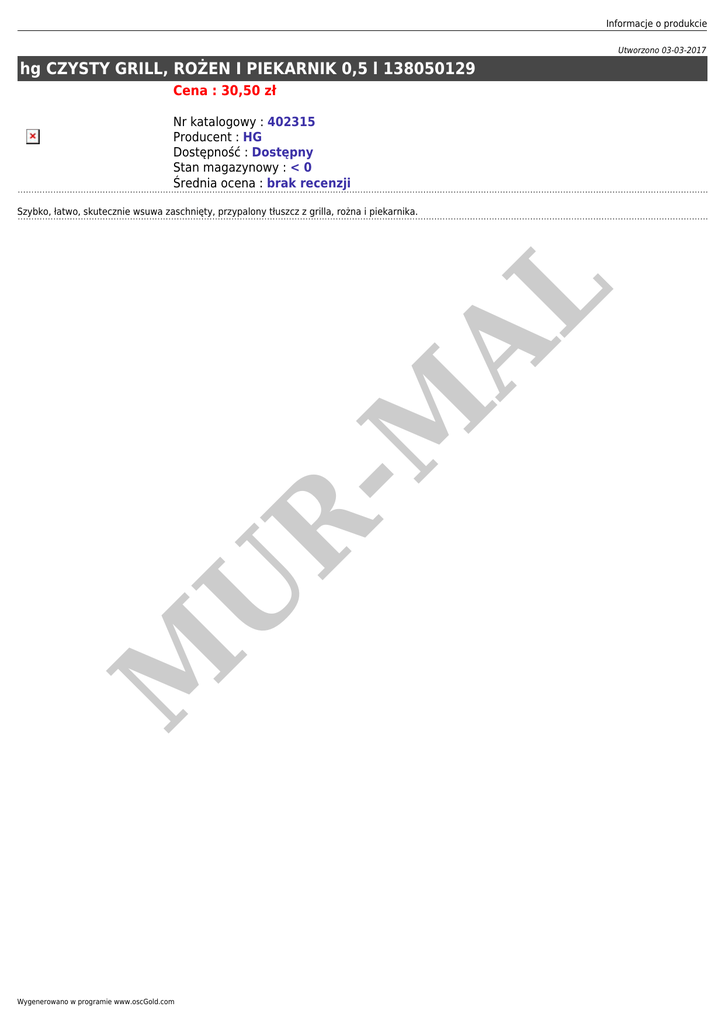 Informacje o produkcie Utworzono 03-03-2017 hg CZYSTY GRILL, ROŻEN I PIEKARNIK 0,5 l 138050129 Cena : 30,50 zł Nr katalogowy : 402315 Producent : HG Dostępność : Dostępny Stan magazynowy : < 0 Średnia ocena : brak recenzji M U R -M AL Szybko, łatwo, skutecznie wsuwa zaschnięty, przypalony tłuszcz z grilla, rożna i piekarnika. Wygenerowano w programie www.oscGold.com