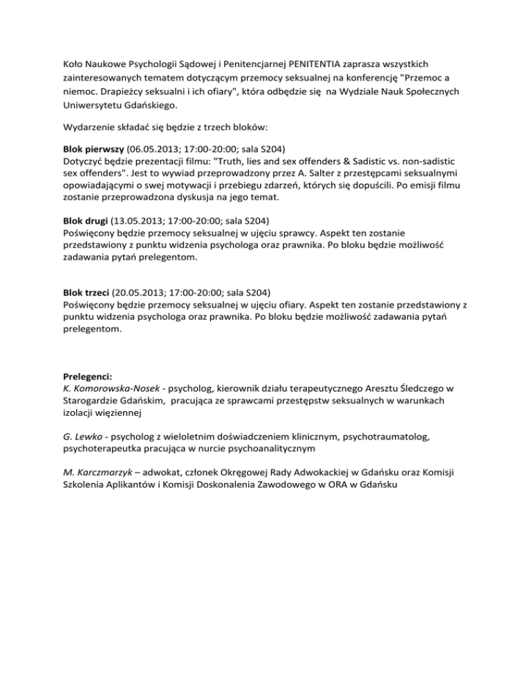 Koło Naukowe Psychologii Sądowej i Penitencjarnej PENITENTIA zaprasza wszystkich zainteresowanych tematem dotyczącym przemocy seksualnej na konferencję "Przemoc a niemoc. Drapieżcy seksualni i ich ofiary", która odbędzie się na Wydziale Nauk Społecznych Uniwersytetu Gdaoskiego. Wydarzenie składad się będzie z trzech bloków: Blok pierwszy (06.05.2013; 17:00-20:00; sala S204) Dotyczyd będzie prezentacji filmu: "Truth, lies and sex offenders & Sadistic vs. non-sadistic sex offenders". Jest to wywiad przeprowadzony przez A. Salter z przestępcami seksualnymi opowiadającymi o swej motywacji i przebiegu zdarzeo, których się dopuścili. Po emisji filmu zostanie przeprowadzona dyskusja na jego temat. Blok drugi (13.05.2013; 17:00-20:00; sala S204) Poświęcony będzie przemocy seksualnej w ujęciu sprawcy. Aspekt ten zostanie przedstawiony z punktu widzenia psychologa oraz prawnika. Po bloku będzie możliwośd zadawania pytao prelegentom. Blok trzeci (20.05.2013; 17:00-20:00; sala S204) Poświęcony będzie przemocy seksualnej w ujęciu ofiary. Aspekt ten zostanie przedstawiony z punktu widzenia psychologa oraz prawnika. Po bloku będzie możliwośd zadawania pytao prelegentom. Prelegenci: K. Komorowska-Nosek - psycholog, kierownik działu terapeutycznego Aresztu Śledczego w Starogardzie Gdaoskim, pracująca ze sprawcami przestępstw seksualnych w warunkach izolacji więziennej G. Lewko - psycholog z wieloletnim doświadczeniem klinicznym, psychotraumatolog, psychoterapeutka pracująca w nurcie psychoanalitycznym M. Karczmarzyk – adwokat, członek Okręgowej Rady Adwokackiej w Gdaosku oraz Komisji Szkolenia Aplikantów i Komisji Doskonalenia Zawodowego w ORA w Gdaosku