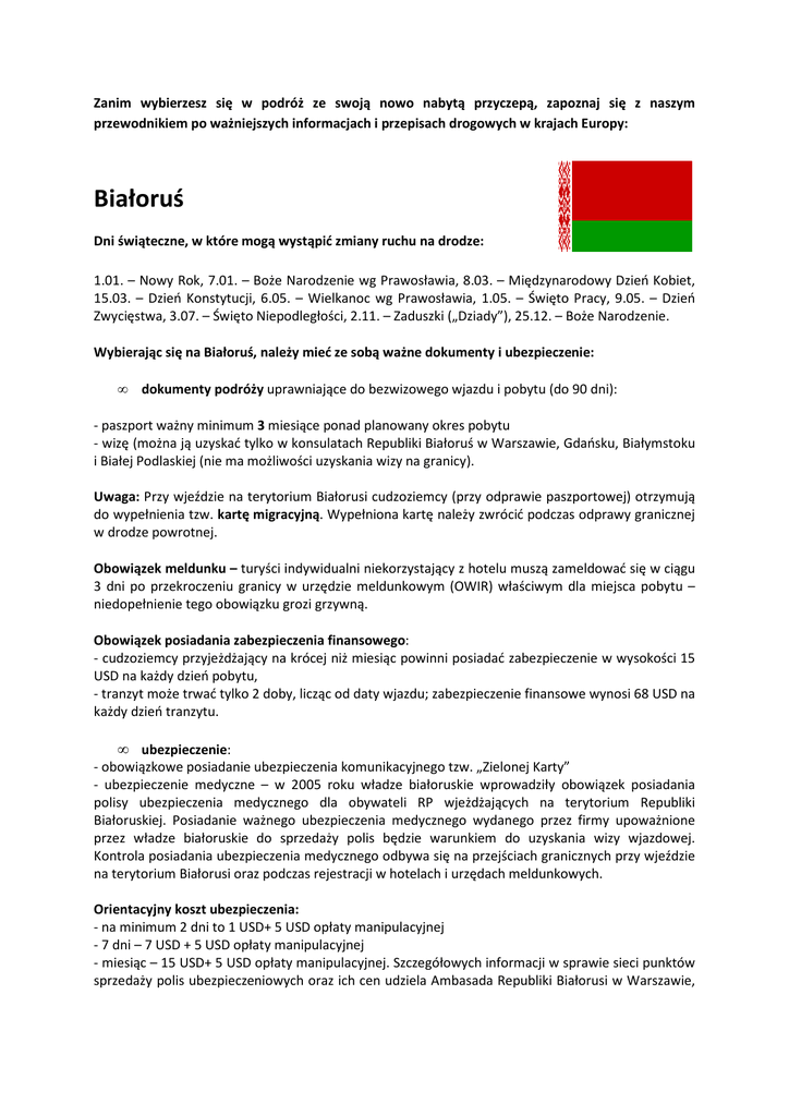 Zanim wybierzesz się w podróż ze swoją nowo nabytą przyczepą, zapoznaj się z naszym przewodnikiem po ważniejszych informacjach i przepisach przepisach drogowych w krajach Europy: Europy Białoruś Dni świąteczne, w które mogą wystąpić zmiany ruchu na drodze: 1.01. – Nowy Rok, 7.01. – Boże oże Narodzenie wg Prawosławia, 8.03. – Międzynarodowy Dzień Kobiet, 15.03. – Dzień Konstytucji, 6.05. 6.05 – Wielkanoc wg Prawosławia, 1.05. – Święto więto Pracy, 9.05. – Dzień Zwycięstwa, 3.07. – Święto więto Niepodległości, 2.11. – Zaduszki („Dziady”), 25.12. – Boże Narodzenie. Wybierając się na Białoruś,, należy mieć ze sobą ważne dokumenty i ubezpieczenie: • dokumenty podróży uprawniające do bezwizowego wjazdu i pobytu (do 90 dni): - paszport ważny minimum 3 miesiące ponad planowany okres pobytu - wizę (można ją uzyskać tylko w konsulatach Republiki Białoruś w Warszawie, Gdańsku, Białymstoku i Białej Podlaskiej (nie ma możliwości uzyskania wizy na granicy). Uwaga: Przy wjeździe na terytorium Białorusi cudzoziemcy (przy odprawie paszportowej) otrzymują otrzym do wypełnienia tzw. kartę migracyjną. migracyjną. Wypełniona kartę należy zwrócić podczas odprawy granicznej w drodze powrotnej. Obowiązek meldunku – turyści uryści indywidualni niekorzystający z hotelu muszą zameldować się w ciągu 3 dni po przekroczeniu granicy w urzędzie meldunkowym (OWIR) właściwym dla miejsca pobytu – niedopełnienie tego obowiązku grozi grzywną. Obowiązek posiadania zabezpieczenia finansowego: finansowego - cudzoziemcy przyjeżdżający na krócej niż miesiąc powinni posiadaćć zabezpieczenie w wysokości 15 USD na każdy dzień pobytu, - tranzyt może trwać tylko 2 doby, doby licząc od daty wjazdu; zabezpieczenie finansowe wynosi 68 USD na każdy dzień tranzytu. • ubezpieczenie: - obowiązkowe posiadanie ubezpieczenia komunikacyjnego komunikacy tzw. „Zielonej Karty” - ubezpieczenie medyczne – w 2005 roku władze białoruskie wprowadziły obowiązek posiadania polisy ubezpieczenia medycznego dla obywateli RP wjeżdżających na terytorium Republiki Białoruskiej.. Posiadanie ważnego ubezpieczenia medycznego wydanego przez firmy upoważnione przez władze białoruskie do sprzedaży polis będzie warunkiem do uzyskania wizy wjazdowej. Kontrola posiadania ubezpieczenia medycznego odbywa się na przejściach granicznych przy wjeździe na terytorium Białorusi oraz podczas rejestracji w hotelach i urzędach meldunkowych. meldunkowych. Orientacyjny ientacyjny koszt ubezpieczenia: - na minimum 2 dni to 1 USD+ 5 USD opłaty opł manipulacyjnej - 7 dni – 7 USD + 5 USD opłaty aty manipulacyjnej - miesiąc – 15 USD+ 5 USD opłaty aty manipulacyjnej. Szczegółowych informacji w sprawie sieci punktów sprzedaży polis ubezpieczeniowych oraz ich cen udziela Ambasada Republiki Białorusi w Warszawie, Konsulaty Generalne Republiki Białoruś w Białymstoku i Gdańsku oraz Konsulat Republiki Białoruś w Białej Podlaskiej. Podróżujący pożyczonym samochodem i/lub przyczepą obowiązani są posiadać notarialną umowę użyczenia środka transportu. Czasowy wwóz samochodu – Procedura rejestrowania czasowego wwozu środków transportu obowiązuje w odniesieniu do samochodów ciężarowych i autokarów o DMC powyżej 5 t. Nieposiadanie ważnego zaświadczenia o bezcłowym wwozie może grozić konfiskata pojazdu w trybie administracyjnym (przy okazji rutynowej kontroli lub w drodze powrotnej na granicy). Przed wyruszeniem w podróż sprawdź niezbędne wyposażenie pojazdu: - pasy bezpieczeństwa na przednich i tylnych siedzeniach pod warunkiem, że pojazd ma je zamontowane - trójkąt ostrzegawczy - gaśnica - koło zapasowe - kask ochronny dla motocyklisty i pasażera - apteczka pierwszej pomocy – w apteczce powinny się znaleźć: 10% roztwór amoniaku, walidol, jodyna, bandaże sterylne i elastyczne, wata, plastry opatrunkowe, opaska uciskowa, nożyczki z zaokrąglonymi końcówkami, rękawiczki chirurgiczne, chusteczki higieniczne. Uwaga: Stan apteczek samochodowych może być sprawdzany wyrywkowo zarówno przez białoruską straż graniczną, jak i przez patrole milicji drogowej. W razie stwierdzenia uchybień i nieprzestrzegania zasad ruchu drogowego wymierzane są kary. Obowiązek używania świateł mijania dotyczy: kierującego pojazdem od świtu do zmierzchu w przypadku złej widoczności spowodowanej warunkami atmosferycznymi (np. mgła, ulewa), holowania innego pojazdu, przewozu dzieci, przewozu ładunków niebezpiecznych i dla pojazdów ponadgabarytowych. Motocykliści powinni poruszać się za włączonymi światłami mijania przez całą dobę. Zespoły jezdne powinny mieć następujące wymiary: - wysokość zewnętrzna – 4,0 m - szerokość zewnętrzna – 2,5 m - długość zewnętrzna zespołu pojazdów (samochód + przyczepa) – 20 m. Uprawnienia do prowadzenia pojazdu mają tylko osoby pełnoletnie, które ukończyły 18 lat. Zasady przewozu dzieci: Dzieci do lat 12 nie mogą być przewożone na przednim siedzeniu pojazdu. W trakcie jazdy obowiązuje całkowity zakaz prowadzenia rozmów przez telefon komórkowy bez przystosowanego w tym celu sprzętu głośnomówiącego. Na drodze należy poruszać się zgodnie z tabelą ograniczenia prędkości, km/h: - na terenie zabudowanym – do 60 km/h, o ile znaki nie wskazują inaczej -teren niezabudowany: motocykl autostrady drogi krajowe 90 90 samochód osobowy 110 90 samochód osobowy z przyczepą powyżej 3,5 tony, samochód ciężarowy 90 70 początkujący kierowcy, legitymujący się prawem jazdy nie starszym niż 2 lata 70 70 Ruch pojazdów handlowych – ograniczenia ruchu dotyczą pojazdów wielkogabarytowych (o DMC powyżej 33 t) i z naciskiem na oś ponad 10 t, które mogą poruszać się tylko po wyznaczonych trasach, np.: Kozłowicze (gran. z Polską) – Brześć – Mińsk – granica Rosji Bruzgi (gran. z Polską) – Grodn