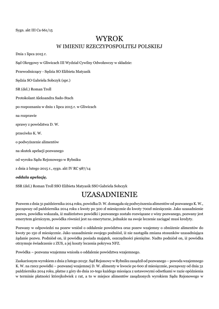 Sygn. akt III Ca 661/15 WYROK W IMIENIU RZECZYPOSPOLITEJ POLSKIEJ Dnia 1 lipca 2015 r. Sąd Okręgowy w Gliwicach III Wydział Cywilny Odwoławczy w składzie: Przewodniczący - Sędzia SO Elżbieta Matyasik Sędzia SO Gabriela Sobczyk (spr.) SR (del.) Roman Troll Protokolant Aleksandra Sado-Stach po rozpoznaniu w dniu 1 lipca 2015 r. w Gliwicach na rozprawie sprawy z powództwa D. W. przeciwko K. W. o podwyższenie alimentów na skutek apelacji pozwanego od wyroku Sądu Rejonowego w Rybniku z dnia 2 lutego 2015 r., sygn. akt IV RC 987/14 oddala apelację. SSR (del.) Roman Troll SSO Elżbieta Matyasik SSO Gabriela Sobczyk UZASADNIENIE Pozwem z dnia 31 października 2014 roku, powódka D. W. domagała się podwyższenia alimentów od pozwanego K. W., począwszy od października 2014 roku z kwoty po 300 zł miesięcznie do kwoty 700zł miesięcznie. Jako uzasadnienie pozwu, powódka wskazała, iż małżeństwo powódki i pozwanego zostało rozwiązane z winy pozwanego, pozwany jest emerytem górniczym, powódka również jest na emeryturze, jednakże na swoje leczenie zaciągać musi kredyty. Pozwany w odpowiedzi na pozew wniósł o oddalenie powództwa oraz pozew wzajemny o obniżenie alimentów do kwoty po 150 zł miesięcznie. Jako uzasadnienie swojego podniósł, iż nie nastąpiła zmiana stosunków uzasadniająca żądanie pozwu. Podniósł on, iż powódka posiada majątek, oszczędności pieniężne. Nadto podniósł on, iż powódka otrzymuje świadczenie z ZUS, a jej koszty leczenia pokrywa NFZ. Powódka – pozwana wzajemna wniosła o oddalenie powództwa wzajemnego. Zaskarżonym wyrokiem z dnia 2 lutego 2015r. Sąd Rejonowy w Rybniku zasądził od pozwanego – powoda wzajemnego K. W. na rzecz powódki – pozwanej wzajemnej D. W. alimenty w kwocie po 600 zł miesięcznie, począwszy od dnia 31 października 2014 roku, płatne z góry do dnia 10-tego każdego miesiąca z ustawowymi odsetkami w razie opóźnienia w terminie płatności którejkolwiek z rat, a to w miejsce alimentów zasądzonych wyrokiem Sądu Rejonowego w Rybniku z dnia 07 czerwca 2006r. w sprawie IV RC 363/06; w pozostałej części oddalił powództwo główne. Ponadto oddalił powództwo wzajemne, nakazał pobrać od pozwanego – powoda wzajemnego K. W. na rzecz Skarbu Państwa Sądu Rejonowego w Rybniku kwotę 180 zł tytułem kosztów postępowania; a wyrokowi w punkcie 1 nadał rygor natychmiastowej wykonalności Sąd Rejonowy ustalił jako okoliczności bezsporne, że strony są po rozwodzie, a rozwód orzeczono z winy pozwanego ( w sprawie XXIC 1627/97), ostatnie alimenty zostały zasądzone w sprawie IV RC 363/06 na kwotę 300 zł miesięcznie, zaś obecnie strony utrzymują się ze świadczeń emerytalnych. Wskazał, że sporne w sprawie były kwestie, jaki jest koszt usprawiedliwionych potrzeb stron; jakie są ich możliwości zarobkowe i majątkowe, a nadto czy nastąpiła zmiana stosunków w rozumieniu art. 138 k.r.o. uzasadniająca podwyższenie alimentów lub ich obniżenie. Sąd Rejonowy wskazał, że ostatnie alimenty orzeczono wyrokiem tut. Sądu z dnia 7 czerwca 2006 roku, sygnatura akt IV RC 363/06 na kwotę 300 zł. W dacie ustalania tych alimentów powódka pracowała i zarabiała 1320 zł netto, nadto otrzymywała nagrody kwartalne. Razem z premią jej dochód wynosił ok. 2,5 tysiąca złotych. Powódka mieszkała z córką. Koszty utrzymania mieszkania wynosiły 542 zł. Powódka leczyła się na nadciśnienie tętnicze, nerwicę, skrzywienie kręgosłupa i na leczenie wydawała 250 zł. Zobowiązania powódki, z tytułu zaciągniętych pożyczek wynosiły 730 zł miesięcznie. Pozwany utrzymywał się wówczas z emerytury, która wynosiła 2581,86 zł i miał przyznany deputat w wysokości 3 ton węgla. Opłaty za mieszkanie pozwanego zajmowanego z synem wynosiły 423 zł. Pozwany 400 zł przeznaczał na spłatę zadłużeń własnych. Koszty jego leczenia wyniosły 100 zł. Sąd Rejonowy ustalił, że aktualnie powódka – pozwana wzajemna D. W. utrzymuje się z emerytury, która wynosi 1519,40 zł netto. Otrzymuje ona również alimenty w kwocie 300 zł. Łącznie dysponuje ona kwotą 1819,40 zł. Obecnie mieszka sama. Opłaty za mieszkanie powódki, wynoszą: czynsz 520 zł, gaz 105,18 zł, płatne co dwa miesiące; prąd 135,35 zł, płatne co dwa miesiące. Miesięcznie koszty utrzymanie mieszkania wynoszą ok. 640 zł. Powódka leczy się w poradni ogólnej i cukrzycowej. Leczy się ona z powodu nadciśnienia tętniczego, zaburzeń rytmu serca, choroby wrzodowej żołądka, jest po operacji przepukliny pachwinowej, zwyrodnień kręgosłupa i dyskopatii, przewlekłego zapalenia trzustki. Miesięczny koszt leczenia powódki wynosi nie mniej niż 300 zł. Na pozostałe koszty utrzymania powódki składają się wydatki na: wyżywienie 800 zł; środki czystości i kosmetyki 200 zł; odzież 100 zł miesięcznie; buty 150 zł miesięcznie. Powódka spłaca pożyczkę zaciągniętą w banku w wysokości 400 zł miesięcznie, którą zaciągnęła na pokrycie kosztów leczenia oraz przygotowanie się na operację do szpitala. Sąd Rejonowy wskazał, że miesięczne koszty utrzymania podane przez powódkę to kwota ok. 2550 zł. Jednakże w ocenie Sądu Rejonowy koszty te są zawyżone, chociażby w zakresie co- miesięcznego wydatku na buty w kwocie 150 zł, czy kosztów wyżywienia w kwocie 800 zł. Sąd Rejonowy uznał, kierując się doświadczeniem życiowym powódka dysponując kwotą ok. 2100 zł winna zaspokoić swoje bieżące potrzeby. Sąd Rejonowy ustalił, że powódka jest współwłaścicielem mieszkania w L., które to mieszkanie odziedziczyła wraz z bratanicą. Mieszkanie to jest pustostanem i nie może być zbyte, albowiem bratanica jest osobą małoletnią i przebywa w placówce. Odnośnie sytuacji pozwanego – powoda wzajemnego Sąd Rejonowy ustalił, że utrzymuje się on z emerytury, która wynosi 3454,35 zł netto. Pozwany nie otrzymuje deputatu węglowego. P