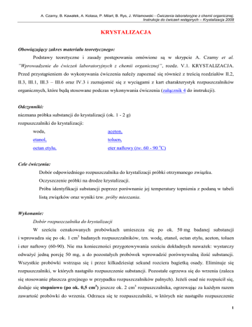 A. Czarny, B. Kawałek, A. Kolasa, P. Milart, B. Rys, J. Wilamowski - Ćwiczenia laboratoryjne z chemii organicznej. Instrukcje do ćwiczeń wstępnych – Krystalizacja 2008 KRYSTALIZACJA Obowiązujący zakres materiału teoretycznego: Podstawy teoretyczne i zasady postępowania omówione są w skrypcie A. Czarny et al. ”Wprowadzenie do ćwiczeń laboratoryjnych z chemii organicznej”, rozdz. V.1. KRYSTALIZACJA. Przed przystąpieniem do wykonywania ćwiczenia należy zapoznać się również z treścią rozdziałów II.2, II.3, III.1, III.3 – III.6 oraz IV.3 i zaznajomić się z wyciągami z kart charakterystyk rozpuszczalników organicznych, które będą stosowane podczas wykonywania ćwiczenia (załącznik 4 do instrukcji). Odczynniki: nieznana próbka substancji do krystalizacji (ok. 1 - 2 g) rozpuszczalniki do krystalizacji: woda, aceton, etanol, toluen, octan etylu, eter naftowy (tw. 60 - 90 oC) Cele ćwiczenia: Dobór odpowiedniego rozpuszczalnika do krystalizacji próbki otrzymanego związku. Oczyszczenie próbki na drodze krystalizacji. Próba identyfikacji substancji poprzez porównanie jej temperatury topnienia z podaną w tabeli listą związków oraz wyniki tzw. próby mieszania. Wykonanie: Dobór rozpuszczalnika do krystalizacji W sześciu oznakowanych probówkach umieszcza się po ok. 50 mg badanej substancji i wprowadza się po ok. 1 cm3 badanych rozpuszczalników, tzn. wodę, etanol, octan etylu, aceton, toluen i eter naftowy (60-90). Nie ma konieczności przygotowywania sześciu dokładnych naważek: wystarczy odważyć jedną porcję 50 mg, a do pozostałych probówek wprowadzić porównywalną ilość substancji. Wszystkie probówki wstrząsa się i przez kilkadziesiąt sekund rozciera bagietką osady. Eliminuje się rozpuszczalniki, w których nastąpiło rozpuszczenie substancji. Pozostałe ogrzewa się do wrzenia (zaleca się stosowanie płaszcza grzejnego w przypadku rozpuszczalników palnych). Jeżeli osad nie rozpuścił się, dodaje się stopniowo (po ok. 0,5 cm3) jeszcze ok. 2 cm3 rozpuszczalnika, ogrzewając za każdym razem zawartość probówki do wrzenia. Odrzuca się te rozpuszczalniki, w których nie nastąpiło rozpuszczenie 1 A. Czarny, B. Kawałek, A. Kolasa, P. Milart, B. Rys, J. Wilamowski - Ćwiczenia laboratoryjne z chemii organicznej. Instrukcje do ćwiczeń wstępnych – Krystalizacja 2008 próbki w 3 cm3 roztworu. Pozostałe probówki chłodzi się i obserwuje krystalizację produktu. W oparciu o kryteria podane w skrypcie (rozdz. V.1.), to znaczy ilość i rodzaj powstających kryształów, względy bezpieczeństwa itd., dokonuje się wyboru optymalnego rozpuszczalnika do krystalizacji próbki.1 Należy rozważyć też możliwość krystalizacji z mieszaniny rozpuszczalników. Krystalizacja Próbkę pozostałą po doborze rozpuszczalnika waży się, mierzy się jej temperaturę topnienia, a następnie przeprowadza się krystalizację całej ilości związku z uprzednio dobranego rozpuszczalnika. Niezbędną ilość rozpuszczalnika można oszacować na podstawie wyników prób doboru rozpuszczalnika, stosując odpowiednią proporcję. Przykładowo, jeżeli 50 mg próbki rozpuściło się na gorąco w 2 cm 3 wody, to można oczekiwać, że do krystalizacji 1 g próbki będzie należało użyć 40 cm 3 wody. Nie należy jednak dodawać od razu całej ilości rozpuszczalnika, lecz rozpocząć od wprowadzenia ok. 2/3 oszacowanej ilości, czyli w omawianym przypadku ok. 25 cm3 wody. Możliwe jest jednak, że efektywna krystalizacja będzie wymagała użycia znacznie większej ilości rozpuszczalnika, niż wynikało to z szacunków. Kolba, w której będzie ogrzewany roztwór, powinna zatem pomieścić objętość roztworu nawet dwukrotnie większą od oszacowanej. Kolejne etapy ćwiczenia, czyli rozpuszczanie badanej próbki we wrzącym rozpuszczalniku w kolbie okrągłodennej pod chłodnicą zwrotną, sączenie gorącego roztworu przez sączek fałdowany, pozostawienie roztworu do krystalizacji i odsączenie wydzielonego osadu na lejku Büchnera należy wykonywać zgodnie z opisem podanym w rozdziale "Krystalizacja". Przesącze po krystalizacji należy pozostawić do czasu uzyskania pewności, że wydajność krystalizacji jest zadawalająca.2 Oczyszczoną i wysuszoną substancję waży się i ponownie oznacza temperaturę topnienia. Próbki pozostawiane do wysuszenia należy koniecznie opisać symbolem próbki i swoim nazwiskiem! Gdy istnieje podejrzenie, że próbka nadal jest zanieczyszczona (topnienie zachodzi w szerokim przedziale temperatury lub w temperaturze niższej niż przed krystalizacją), należy ponownie przeprowadzić krystalizację. Jeżeli można uznać, że próbka jest czysta, oblicza się wydajność procesu krystalizacji. 1 Pozostałe po doborze rozpuszczalnika roztwory umieszcza się w odpowiednich pojemnikach: toluen, eter naftowy i octan etylu w pojemniku O (ciekłe, palne, bez fluorowców), rozwór acetonowy oraz wodny w pojemniku A (roztwory acetonowe), a roztwór etanolowy w pojemniku E. 2 Niepotrzebne przesącze umieszcza się w odpowiednich pojemnikach: toluen, eter naftowy i octan etylu w pojemniku O (ciekłe, palne, bez fluorowców), rozwór acetonowy w pojemniku A (roztwory acetonowe), a roztwór etanolowy w pojemniku E. Sposób postępowania z roztworami wodnymi należy uzgodnić z prowadzącym ćwiczenie. Sączki należy umieścić w pojemniku P (stałe, palne). 2 A. Czarny, B. Kawałek, A. Kolasa, P. Milart, B. Rys, J. Wilamowski - Ćwiczenia laboratoryjne z chemii organicznej. Instrukcje do ćwiczeń wstępnych – Krystalizacja 2008 Identyfikacja związku w oparciu o wyniki próby mieszania Spośród związków podanych w poniższej tabeli (załącznik 1) wybiera się substancje o temperaturach topnienia zbliżonych do badanej próbki i wykonuje się z nimi próby mieszania. Jednakowe ilości badanego związku i wzorca miesza się i dokładnie rozciera, a następnie oznacza temperaturę topnienia. Obniż
