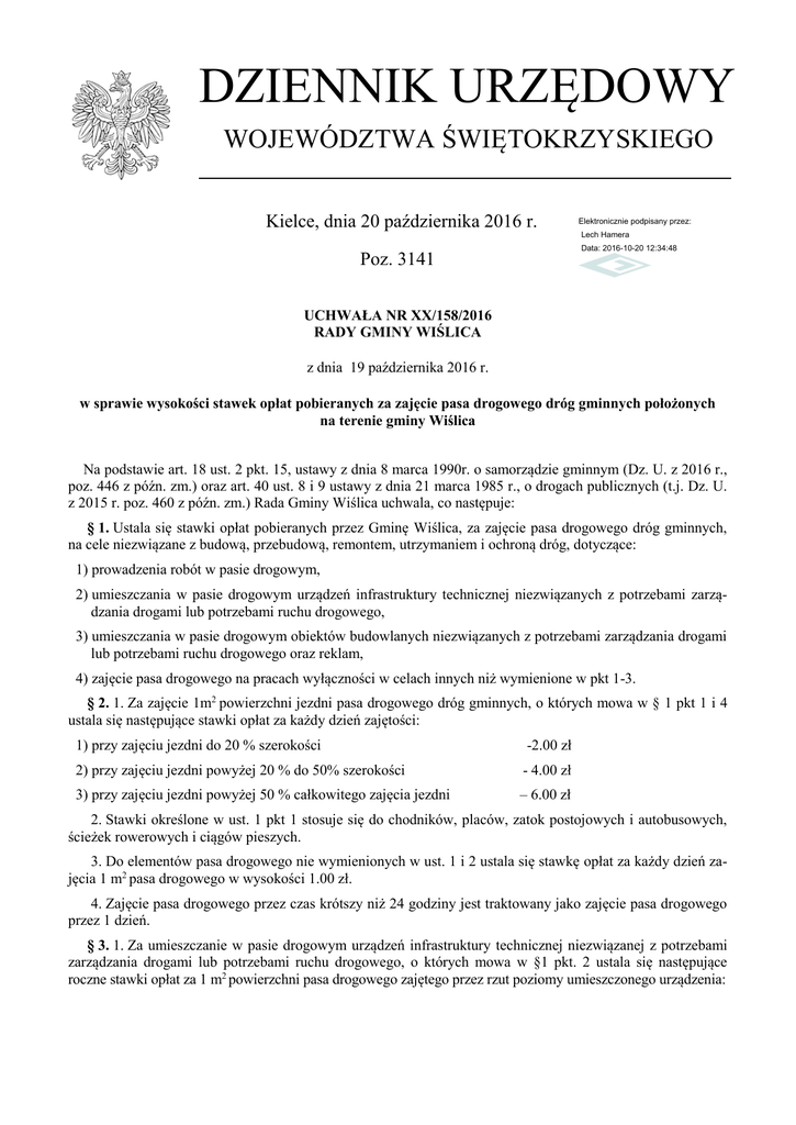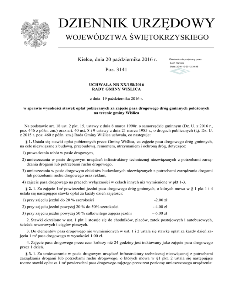 DZIENNIK URZĘDOWY WOJEWÓDZTWA ŚWIĘTOKRZYSKIEGO Kielce, dnia 20 października 2016 r. Elektronicznie podpisany przez: Lech Hamera Data: 2016-10-20 12:34:48 Poz. 3141 UCHWAŁA NR XX/158/2016 RADY GMINY WIŚLICA z dnia 19 października 2016 r. w sprawie wysokości stawek opłat pobieranych za zajęcie pasa drogowego dróg gminnych położonych na terenie gminy Wiślica Na podstawie art. 18 ust. 2 pkt. 15, ustawy z dnia 8 marca 1990r. o samorządzie gminnym (Dz. U. z 2016 r., poz. 446 z późn. zm.) oraz art. 40 ust. 8 i 9 ustawy z dnia 21 marca 1985 r., o drogach publicznych (t.j. Dz. U. z 2015 r. poz. 460 z późn. zm.) Rada Gminy Wiślica uchwala, co następuje: § 1. Ustala się stawki opłat pobieranych przez Gminę Wiślica, za zajęcie pasa drogowego dróg gminnych, na cele niezwiązane z budową, przebudową, remontem, utrzymaniem i ochroną dróg, dotyczące: 1) prowadzenia robót w pasie drogowym, 2) umieszczania w pasie drogowym urządzeń infrastruktury technicznej niezwiązanych z potrzebami zarządzania drogami lub potrzebami ruchu drogowego, 3) umieszczania w pasie drogowym obiektów budowlanych niezwiązanych z potrzebami zarządzania drogami lub potrzebami ruchu drogowego oraz reklam, 4) zajęcie pasa drogowego na pracach wyłączności w celach innych niż wymienione w pkt 1-3. § 2. 1. Za zajęcie 1m2 powierzchni jezdni pasa drogowego dróg gminnych, o których mowa w § 1 pkt 1 i 4 ustala się następujące stawki opłat za każdy dzień zajętości: 1) przy zajęciu jezdni do 20 % szerokości -2.00 zł 2) przy zajęciu jezdni powyżej 20 % do 50% szerokości - 4.00 zł 3) przy zajęciu jezdni powyżej 50 % całkowitego zajęcia jezdni – 6.00 zł 2. Stawki określone w ust. 1 pkt 1 stosuje się do chodników, placów, zatok postojowych i autobusowych, ścieżek rowerowych i ciągów pieszych. 3. Do elementów pasa drogowego nie wymienionych w ust. 1 i 2 ustala się stawkę opłat za każdy dzień zajęcia 1 m2 pasa drogowego w wysokości 1.00 zł. 4. Zajęcie pasa drogowego przez czas krótszy niż 24 godziny jest traktowany jako zajęcie pasa drogowego przez 1 dzień. § 3. 1. Za umieszczanie w pasie drogowym urządzeń infrastruktury technicznej niezwiązanej z potrzebami zarządzania drogami lub potrzebami ruchu drogowego, o których mowa w §1 pkt. 2 ustala się następujące roczne stawki opłat za 1 m2 powierzchni pasa drogowego zajętego przez rzut poziomy umieszczonego urządzenia: Dziennik Urzędowy Województwa Świętokrzyskiego –2– Poz. 3141 1) w odniesieniu do urządzeń infrastruktury telekomunikacyjnej: a) w jezdni - 2.00 zł b) poza jezdnią - 1.00 zł c) na drogowym obiekcie inżynierskim - 2.00 zł 2) w odniesieniu do pozostałych urządzeń infrastruktury technicznej: a) na obiekcie mostowym b) na pozostałych elementach pasa drogowego -180.00 zł -18.00 zł 2. Za umieszczenie w pasie drogowym urządzenia o powierzchni rzutu poziomego mniejszej niż 1 m2 pobiera się opłatę jak za 1 m2 urządzenia. 3. Roczne stawki opłaty w wysokości określonej w ust. 1 obejmują pełny rok kalendarzowy umieszczenia urządzenia w pasie drogowym. 4. Za niepełny rok kalendarzowy wysokość rocznych stawek opłat obliczana jest proporcjonalnie do liczby miesięcy / wliczając miesiące niepełne/ umieszczenia urządzenia w pasie drogowym. § 4. 1. Za każdy dzień zajęcia pasa drogowego, o którym mowa w §1 pkt 3 ustala się następujące stawki opłat: 1) za umieszczenie w pasie drogowym obiektu budowlanego ustala się stawkę opłaty w wysokości 0.20 zł za 1 m2 powierzchni rzutu poziomego obiektu 2) za umieszczenie w pasie drogowym reklamy ustala się stawkę opłaty w wysokości 1,50 zł za 1 m2 powierzchni reklamy. § 5. 1. Odstępuje się od pobierania opłat za zajecie pasa drogowego, którym mowa w § 1 pkt 1 w związku z realizacją zadań, których inwestorem jest Gmina Wiślica. 2. Odstępuje się od pobierania opłat za umieszczenie w pasie drogowym urządzeń infrastruktury technicznej będącej własnością Gminy Wiślica, o której jest mowa w § 1 pkt 2. § 6. Traci moc uchwała Nr XXXII/187/2005 Rady Gminy Wiślica z dnia 29 września 2005 r. w sprawie wysokości stawek opłat pobieranych za zajęcie pasa drogowego dróg gminnych położonych na terenie gminy Wiślica. § 7. Wykonanie uchwały powierza się Wójtowi Gminy Wiślica. § 8. Uchwała wchodzi w życie po upływie 14 dni od ogłoszenia w Dzienniku Urzędowym Województwa Świętokrzyskiego. Przewodniczący Rady Gminy Stanisław Bystrzanowski