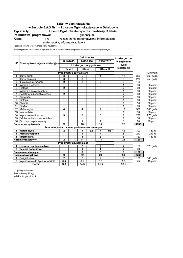 Szkolny plan nauczania w Zespole Szkół Nr 1 - I Liceum Ogólnokształcące w Działdowie Typ szkoły: Liceum Ogólnokształcące dla młodzieży, 3 letnie Podbudowa programowa: gimnazjum Klasa: III A rozszerzenie matematyczno-informatyczne matematyka, informatyka, fizyka Podstawa prawna opracowanego planu nauczania: Rozporządzernie MEN z dnia 20 stycznia 2012 r. w sprawie ramowych planów nauczania w szkołach publicznych Rok szkolny LP Obowiązkowe zajęcia edukacyjne 2014/2015 2015/2016 2016/2017 Liczba godzin tygodniowo Klasa I Klasa II Klasa III Przedmioty obowiązkowe 1 Język polski 3 5 4 2 Język angielski 3 3 3 3 J. niemiecki/j.rosyjski 2 2 2 4 Wiedza o kulturze 1 5 Historia 2 6 Wiedza o społeczeństwie 1 7 Podstawy przedsiębiorczości 2 8 Geografia 1 9 Biologia 1 10 Chemia 1 11 Fizyka 1 12 Matematyka 4 4 2 13 Informatyka 1 14 Wychowanie fizyczne 3 3 3 15 Edukacja dla bezpieczeństwa 1 16 Godziny z wychowawcą 1 1 1 Suma obowiązkowych: 28 18 15 Przedmioty nauczane na poziomie rozszerzonym 1 Matematyka 2 4 d2 4 d2 2 Fizyka/geografia 4 4 3 Informatyka 3 3 Razem rozszerzone: 2 11 11 Przedmioty uzupełniajace 1 Historia i społeczeństwo 2 2 2 Zajęcia dodatkowe 1 1 Razem uzupełniające: 3 3 Razem obowiązkowe: 30 32 29 1 Religia\ etyka 2 2 2 2 Wychowanie do życia w rodzinie 0,5 0,5 0,5 Razem 32,5 34,5 31,5 D - godziny dodatkowa Rok szkolny 30 tyg. WDŻ - 14 godzin/rok Liczba godzin w trzyletnim cyklu kształcenia Minimum 360 godz. 450 godz. 12 9 6 1 2 1 2 1 1 1 1 10 1 9 1 3 26 360 270 180 30 60 30 60 30 30 30 30 300 30 270 30 90 1830 10 8 6 24 300 240 180 720 180 R 240 R 180 R 4 2 6 91 6 1,5 98,5 120 60 180 2730 180 45 120 godz. 30 godz. 60 godz. 30 godz. 60 godz. 30 godz. 30 godz. 30 godz. 30 godz. 300 godz. 30 godz. 270 godz. 30 godz. 90 godz. 180 godz. 45 godz.