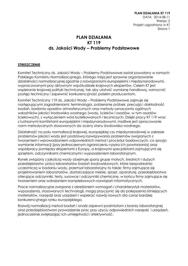 PLAN DZIAŁANIA KT 119 DATA: 2014-08-11 Wersja: 2 Projekt uzgodniony w KT Strona 1 PLAN DZIAŁANIA KT 119 ds. Jakości Wody ‒ Problemy Podstawowe STRESZCZENIE Komitet Techniczny ds. Jakości Wody – Problemy Podstawowe został powołany w ramach Polskiego Komitetu Normalizacyjnego, którego misją jest sprawne organizowanie działalności normalizacyjnej zgodnie z rozwiązaniami europejskimi i międzynarodowymi, wypracowanymi przy aktywnym współudziale krajowych ekspertów. Celem KT jest wspieranie krajowej polityki technicznej, tak aby ułatwić wymianę handlową, wzmocnić postęp techniczny i zapewnić konkurencyjność polskim producentom. Komitet Techniczny 119 ds. Jakości Wody – Problemy Podstawowe zajmuje się następującymi zagadnieniami: terminologia, pobieranie próbek, precyzja i dokładność badań, badania opadów atmosferycznych oraz metody oznaczania ogólnych wskaźników jakości środowiska wodnego (wody, ścieków i osadów, w tym osadów ściekowych), z wyłączeniem wód butelkowanych i leczniczych. Dzięki pracy KT 119 wraz z lustrzanymi komitetami europejskimi i międzynarodowymi, możliwe jest opracowanie norm metodycznych stosowanych do oceny stanu środowiska wodnego. Działalność na polu normalizacji krajowej, europejskiej czy międzynarodowej w zakresie problemów jakości wody jest podstawą rozwiązywania problemów związanych z tworzeniem i wprowadzaniem odpowiednich metod i procedur badawczych, co sprzyja wymianie informacji (przy jednoczesnym ograniczeniu ryzyka ich powtarzania) oraz współpracy pomiędzy ekspertami z Europy, a krajowymi specjalistami zajmującymi się sprzętem, odczynnikami chemicznymi i wyposażeniem laboratoryjnym. Rynek związany z jakością wody obejmuje sporą grupę małych, średnich i dużych przedsiębiorstw; prócz laboratoriów badań środowiskowych, które bezpośrednio uczestniczą w badaniu wody, przemysł laboratoryjny to także: firmy zajmujące się projektowaniem laboratoriów, dostarczające meble, sprzęt, aparaturę, przedsiębiorstwa oferujące odczynniki, testy, surowce i odczynniki chemiczne, w końcu firmy zajmujące się tworzeniem oraz wdrażaniem kompleksowych rozwiązań informatycznych. Prace normalizacyjne związane z określaniem wymagań i charakterystyk materiałów, wyposażenia, stosowanych technologii, mogą przyczynić się do polepszenia istniejących materiałów, narzędzi oraz urządzeń i wspierać rozwój nowych dla coraz bardziej konkurencyjnego rynku europejskiego. Rozwój normalizacji metod badań i analiz zapewni podmiotom z branży laboratoryjnej oraz przedsiębiorstwom prowadzenie prac przy użyciu odpowiednich narzędzi i urządzeń, jednocześnie zwiększając ich umiejętności i efektywność. PLAN DZIAŁANIA KT 119 DATA: 2014-08-11 Wersja: 2 Projekt uzgodniony w KT Strona 2 1 ŚRODOWISKO BIZNESOWE KT 1.1 Opis środowiska biznesowego Na działalność gospodarczą objętą zakresem KT znaczący wpływ mają następujące uwarunkowania polityczne, gospodarcze, techniczne, prawne, społeczne i/lub aspekty regionalne/międzynarodowe: Polityczne/społeczne: Dostęp do bezpiecznej wody jest podstawowym czynnikiem dla zdrowia i życia organizmów żywych, jednym z podstawowych praw człowieka i częścią efektywnej polityki ochrony zdrowia ludzi. Dostęp do wody jest niezwykle istotny zarówno na szczeblu lokalnym, jak i światowym. Każdego roku społeczeństwa, ich polityczne i ekonomiczne decyzje ukierunkowywane są coraz bardziej na kwestie czystości wody, dostępu do niej, ochrony źródeł i racjonalnego jej użytkowania (kwestie te były wielokrotnie omawiane na międzynarodowych forach, m.in. na Konferencji Narodów Zjednoczonych dotyczącej wody (1977), Międzynarodowej Konferencji dotyczącej Wody i Środowiska (1992)). W Polsce, zgodnie z danymi zawartymi w Raporcie o stanie środowiska w Polsce w 2008 roku, sporządzonym przez Główny Inspektorat Ochrony Środowiska, wskazano, że do głównych niekorzystnych zmian w przyrodzie, obserwowanych m.in. w ramach monitoringu gatunków i siedlisk przyrodniczych, zaliczono zanieczyszczenie wód (jako środowiska flory i fauny). W celu zachowania dziedzictwa przyrodniczego Polski (co można rozciągnąć na wszystkie kraje europejskie oraz kraje spoza Starego Kontynentu), ważne jest, by dbać o odpowiednią jakość wody, bez której niemożliwe jest funkcjonowanie i rozwój ekosystemów (co wiąże się z atrakcyjnością turystyczną regionu, z rozwojem niektórych gałęzi gospodarki oraz wpływa na rozwój cywilizacyjny kraju, a tym samym na poziom życia społeczeństwa). Aspekty polityczny i społeczny dotyczące wody są ze sobą silnie powiązane. Przeprowadzono badania, na podstawie których prognozuje się, że w 46 krajach, w których mieszka 2,7 mld ludzi, na skutek zmian klimatycznych i związanych z nimi problemów z dostępem do czystej wody, może nastąpić eskalacja konfliktów zbrojnych1. Kolejne 56 państw, które zamieszkuje 1,2 mld ludzi, są to obszary zagrożone polityczną niestabilnością, np. prognozuje się, iż deficyt wody na Bliskim Wschodzie czy w Afryce może prowadzić do eskalacji napięć i konfliktów (np. Egipt, który korzysta z wody Nilu, powołując się na traktat z 1929 r. wielokrotnie groził, że zacznie działania wojenne przeciw każdemu, kto usiłowałby wpływać na bieg rzeki). Przewiduje się, że do roku 2025 ponad połowa krajów na świecie będzie musiała zmierzyć się z ograniczeniem dostępu do czystej wody, a w roku 2050 aż 75 % populacji świata będzie cierpiało na niedostatek wody odpowiedniej jakości. Rosnąca populacja ludzi wykorzystuje źródła wody dla potrzeb przemysłu i obszarów rolniczych, tak szybko, jak nigdy wcześniej. Zachodzące zmiany klimatyczne dodatkowo pogłębią problem. Woda, jako podstawa życia, wymaga ochrony. Ochrona wód to odpowiednie postępowanie ze źródłami wody przeznaczonej do spożycia, kontrole wód podziemnyc