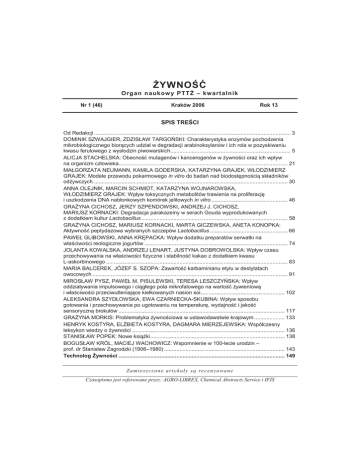 ŻYWNOŚĆ Org an n auk ow y PT T Ż – kw a rt aln i k Nr 1 (46) Kraków 2006 Rok 13 SPIS TREŚCI Od Redakcji ................................................................................................................................. 3 DOMINIK SZWAJGIER, ZDZISŁAW TARGOŃSKI: Charakterystyka enzymów pochodzenia mikrobiologicznego biorących udział w degradacji arabinoksylanów i ich rola w pozyskiwaniu kwasu ferulowego z wysłodzin piwowarskich............................................................................... 5 ALICJA STACHELSKA: Obecność mutagenów i kancerogenów w żywności oraz ich wpływ na organizm człowieka............................................................................................................... 21 MAŁGORZATA NEUMANN, KAMILA GODERSKA, KATARZYNA GRAJEK, WŁODZIMIERZ GRAJEK: Modele przewodu pokarmowego in vitro do badań nad biodostępnością składników odżywczych ............................................................................................................................... 30 ANNA OLEJNIK, MARCIN SCHMIDT, KATARZYNA WOJNAROWSKA, WŁODZIMIERZ GRAJEK: Wpływ toksycznych metabolitów trawienia na proliferację i uszkodzenia DNA nabłonkowych komórek jelitowych in vitro .................................................. 46 GRAŻYNA CICHOSZ, JERZY SZPENDOWSKI, ANDRZEJ J. CICHOSZ, MARIUSZ KORNACKI: Degradacja parakazeiny w serach Gouda wyprodukowanych z dodatkiem kultur Lactobacillus ................................................................................................ 58 GRAŻYNA CICHOSZ, MARIUSZ KORNACKI, MARTA GICZEWSKA, ANETA KONOPKA: Aktywność peptydazowa wybranych szczepów Lactobacillus ................................................... 66 PAWEŁ GLIBOWSKI, ANNA KRĘPACKA: Wpływ dodatku preparatów serwatki na właściwości reologiczne jogurtów .............................................................................................. 74 JOLANTA KOWALSKA, ANDRZEJ LENART, JUSTYNA DOBROWOLSKA: Wpływ czasu przechowywania na właściwości fizyczne i stabilność kakao z dodatkiem kwasu L-askorbinowego ....................................................................................................................... 83 MARIA BALCEREK, JÓZEF S. SZOPA: Zawartość karbaminianu etylu w destylatach owocowych ................................................................................................................................ 91 MIROSŁAW PYSZ, PAWEŁ M. PISULEWSKI, TERESA LESZCZYŃSKA: Wpływ oddziaływania impulsowego i ciągłego pola mikrofalowego na wartość żywieniową i właściwości przeciwutleniające kiełkowanych nasion soi ....................................................... 102 ALEKSANDRA SZYDŁOWSKA, EWA CZARNIECKA-SKUBINA: Wpływ sposobu gotowania i przechowywania po ugotowaniu na temperaturę, wydajność i jakość sensoryczną brokułów ............................................................................................................. 117 GRAŻYNA MORKIS: Problematyka żywnościowa w ustawodawstwie krajowym .................... 133 HENRYK KOSTYRA, ELŻBIETA KOSTYRA, DAGMARA MIERZEJEWSKA: Współczesny leksykon wiedzy o żywności .................................................................................................... 136 STANISŁAW POPEK: Nowe książki ........................................................................................ 138 BOGUSŁAW KRÓL, MACIEJ WACHOWICZ: Wspomnienie w 100-lecie urodzin – prof. dr Stanisław Zagrodzki (1906–1980) ............................................................................... 143 Technolog Żywności ............................................................................................................. 149 Zamieszczone artykuły są recenzowane Czasopismo jest referowane przez: AGRO-LIBREX, Chemical Abstracts Service i IFIS FOOD The Scientific Organ of Polish Food Technologists’ Society (PTTŻ) – quarterly No 1 (46) Kraków 2006 Vol. 13 CONTENTS From the Editor ............................................................................................................................ 3 DOMINIK SZWAJGIER, ZDZISŁAW TARGOŃSKI: Characterization of arabinoxylan – degrading microbial enzymes and their role in release of ferulic acid from barley spent grain .... 5 ALICJA STACHELSKA: Presence of mutagens and carcinogens in food and its influence on consumers health ...................................................................................................................... 21 MAŁGORZATA NEUMANN, KAMILA GODERSKA, KATARZYNA GRAJEK, WŁODZIMIERZ GRAJEK: The in vitro models of gastrointestinal tract to study bioavailability of nutriments ........................................................................................................ 30 ANNA OLEJNIK, MARCIN SCHMIDT, KATARZYNA WOJNAROWSKA, WŁODZIMIERZ GRAJEK: The influence of toxic digestive metabolites on the proliferation and DNA damage of epithelial intestinal cells in vitro ................................................................ 46 GRAŻYNA CICHOSZ, JERZY SZPENDOWSKI, ANDRZEJ J. CICHOSZ, MARIUSZ KORNACKI: Paracasein degradation in Gouda cheeses produced with Lactobacillus culture .................................................................................................................. 58 GRAŻYNA CICHOSZ, MARIUSZ KORNACKI, MARTA GICZEWSKA, ANETA KONOPKA: Peptidase activity of some Lactobacillus strains ........................................................................ 66 PAWEŁ GLIBOWSKI, ANNA KRĘPACKA: Effect of whey preparations addition on rheological properties of yoghurts .............................................................................................. 74 JOLANTA KOWALSKA, ANDRZEJ LENART, JUSTYNA DOBROWOLSKA: Influence of storage time on general properties and stability of cacao powder with L-ascorbic acid added ........................................................