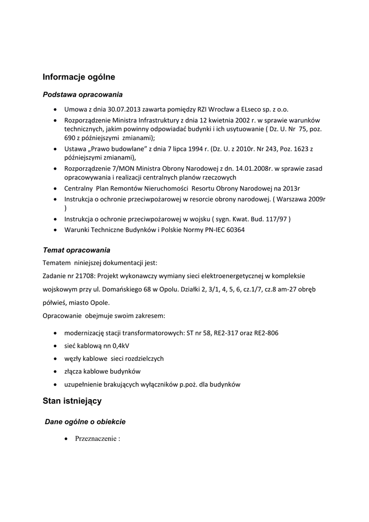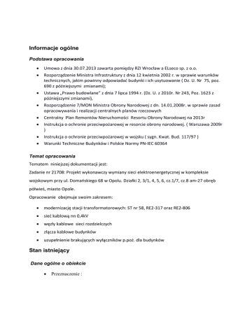 Informacje ogólne Podstawa opracowania • Umowa z dnia 30.07.2013 zawarta pomiędzy RZI Wrocław a ELseco sp. z o.o. • Rozporządzenie Ministra Infrastruktury z dnia 12 kwietnia 2002 r. w sprawie warunków technicznych, jakim powinny odpowiadać budynki i ich usytuowanie ( Dz. U. Nr 75, poz. 690 z późniejszymi zmianami); • Ustawa „Prawo budowlane” z dnia 7 lipca 1994 r. (Dz. U. z 2010r. Nr 243, Poz. 1623 z późniejszymi zmianami), • Rozporządzenie 7/MON Ministra Obrony Narodowej z dn. 14.01.2008r. w sprawie zasad opracowywania i realizacji centralnych planów rzeczowych • Centralny Plan Remontów Nieruchomości Resortu Obrony Narodowej na 2013r • Instrukcja o ochronie przeciwpożarowej w resorcie obrony narodowej. ( Warszawa 2009r ) • Instrukcja o ochronie przeciwpożarowej w wojsku ( sygn. Kwat. Bud. 117/97 ) • Warunki Techniczne Budynków i Polskie Normy PN‐IEC 60364 Temat opracowania Tematem niniejszej dokumentacji jest: Zadanie nr 21708: Projekt wykonawczy wymiany sieci elektroenergetycznej w kompleksie wojskowym przy ul. Domańskiego 68 w Opolu. Działki 2, 3/1, 4, 5, 6, cz.1/7, cz.8 am‐27 obręb półwieś, miasto Opole. Opracowanie obejmuje swoim zakresem: • modernizację stacji transformatorowych: ST nr 58, RE2‐317 oraz RE2‐806 • sieć kablową nn 0,4kV • węzły kablowe sieci rozdzielczych • złącza kablowe budynków • uzupełnienie brakujących wyłączników p.poż. dla budynków Stan istniejący Dane ogólne o obiekcie • Przeznaczenie : Zaopatrzenie w energię elektryczną kompleksu koszarowego nr 2707 poprzez sieć energetyczną NN. Istniejąca sieć zasila 48 obiektów z trzech trafostacji z sieci SN 15/0,4kV, sieci zasilające SN pozostają własnością operatora sieciowego. • Podstawowe parametry charakterystyczne sieci zasilającej: Istniejące stacje transformatorowe 0,4/15kV ST nr 58 400kVA (obok budynku nr 19) Stacja kontenerowa będącą własnością wojska i eksploatowana przez Sekcje Obsługi Infrastruktury. RE2‐317 250kVA (obok budynku nr 65) Murowana stacja, budynek z lat 70 będąca własnością zakładu energetycznego z dostępem użytkownika do rozdzielni NN. RE2‐806 250kVA (obok budynku nr 13). Murowana stacja, budynek z lat 70 będąca własnością zakładu energetycznego z dostępem użytkownika do rozdzielni NN. Linie NN z lat 60‐tych i 70‐tych oraz modernizowane współcześnie są wykonane kablami miedzianymi i aluminiowymi pokrytymi tworzywami sztucznymi, na obiekcie nie występują kable olejowe. Układ sieci jest promienisty, złącza kablowe przy niemodernizowanych budynkach typu ZK‐1b oraz skrzynki Sbi. Opis stanu technicznego infrastruktury Stan techniczny obiektów energetycznych: Stacje transformatorowe: ST nr 58 400kVA Stan techniczny dobry nie ma potrzeby modernizacji, RE2‐317 250kVA Stan techniczny budynku zły, część elektroenergetyczna kompletnie wyeksploatowana i nie spełniającą wymogów aktualnych przepisów i standardów pracy układów zasilania. RE2‐806 250kVA Stan techniczny budynku zły, część elektroenergetyczna kompletnie wyeksploatowana i nie spełniającą wymogów aktualnych przepisów i standardów pracy układów zasilania. Linie NN z lat 60‐tych i 70‐tych oraz stare złącza kablowe i żeliwne szafki SBi, wyeksploatowane kompletnie nie nadają się do dalszej eksploatacji, stanowią zarówno zagrożenie użytkowników i zagrożenie pożarowe obiektów. Istniejące sieci NN nie są wstanie gwarantować ciągłości zasilania i nie spełniają podstawowych kryteriów funkcjonowania. Część złączy kablowych została wymieniona podczas prac remontowych budynków jednak bez wymiany sieci zasilających. Dla części ważniejszych obiektów wymieniono złącza i kable zasilające na Cu240 i Al185, kawałkami bez zmiany układu pracy sieci. Budynki nie poddane modernizacji nie posiadają wyłączników pożarowych. Zużycie techniczne określono na podstawie inwentaryzacji, która jako odrębny dokument została przekazana inwestorowi. Na tej podstawie zużycie sieci można oszacować na znacznie większe niż 40 % . Zakres zadania remontowego: Zakresy prac wymiany sieci elektroenergetycznych oraz modernizacji wymagają wyłączeń zasilania w pracującym obiekcie. Większość prac przyłączeniowych oraz wyłączenia zasilania należy przewidywać w godzinach popołudniowych, nocnych, w dni wolne od pracy. Wykonawca ma obowiązek sporządzić harmonogram wyłączeń zasilania i uzgodnić go z użytkowaniem. Przy wymianie rozdzielni NN i remoncie pomieszczeń należy zapewnić tymczasowe zasilanie odbiorców. Zakres prac projektowych obejmuje modernizację istniejących stacji transformatorowych: ST nr 58 – prace remontowe prace malarskie metalowego kontenera stacji od wewnątrz i z zewnątrz oraz demontaż istniejącego przełącznika agregat sieć i inne drobne prace elektryczne wynikające z tego zakresu. Prace wymagają wyłączenia po stronie SN i dopuszczenia do prac przez pogotowie energetyczne. RE2‐S317 i RE2‐806 Ze względu na wzrost zapotrzebowania w energię elektryczną zakład energetyczny Tauron Dystrubucja S.A. przewiduje wymianę istniejących transformatorów w stacjach RE2‐317 i RE2‐806 z 250kVA na 630kVA oraz wymianę przekładników pomiarowych zgodnie z warunkami technicznymi przyłączenia wydanymi przez firmę Tauron dystrybucja Zakres prac objętych projektem obejmuje: •demontaż wszystkich istniejących rozdzielni i instalacji w pomieszczeniu NN od zacisków NN transformatora •wymianę rozdzielni NN w tych stacjach wraz z kablami od zacisków NN nowego transformatora •wymianę kompletnych układów pomiarowych od zacisków przekładników wraz z okablowaniem, •montaż zdemontowanych układów kompensacji mocy biernej, •wymianę instalacji elektrycznych komory NN, jedna oprawa OPK2x36W z modułem awaryjnym oraz zestaw gniazdowy 230/400/16A z wbudowanym wyłącznikiem róznicowoprądowym. Projekt zawiera uzgodn
