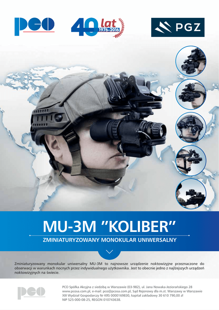 MU-3M ”KOLIBER” ZMINIATURYZOWANY MONOKULAR UNIWERSALNY Zminiaturyzowany monokular uniwersalny MU-3M to najnowsze urządzenie noktowizyjne przeznaczone do obserwacji w warunkach nocnych przez indywidualnego użytkownika. Jest to obecnie jedno z najlżejszych urządzeń noktowizyjnych na świecie. PCO Spółka Akcyjna z siedzibą w Warszawie (03-982), ul. Jana Nowaka-Jeziorańskiego 28 www.pcosa.com.pl, e-mail: [email protected], Sąd Rejonowy dla m.st. Warszawy w Warszawie XIII Wydział Gospodarczy Nr KRS 0000169830, kapitał zakładowy 30 610 790,00 zł NIP 525-000-08-25, REGON 010743638. MU-3M ”KOLIBER” Urządzenie po zamontowaniu na broni może być wykorzystywane jako strzelecki celownik noktowizyjny (we współpracy z celownikiem kolimatorowym lub holograficznym). Możliwy jest także montaż urządzenia na mostku i wykorzystanie go jako gogli noktowizyjnych dla kierowców pojazdów. Monokular może być montowany na każdym typie hełmu, wykorzystując istniejące standardowe mocowania, np. monokulara MU-3. Konstrukcja monokulara oparta jest na 16 mm wzmacniaczu obrazu INTENS® z systemem auto-gating. Dzięki zastosowaniu nowoczesnej optyki asferycznej, urządzenie jest także znacznie krótsze od dotychczas produkowanych monokularów. Noktowizor może pracować w zestawie z nasadką termowizyjną ClipIR, umożliwiając w ten sposób obserwację w trybie fuzji obrazów: noktowizyjnego i termalnego. Cechy wyróżniające produkt: • czarno-biały system wyświetlania (rozróżnienie szczegółów wyższe o 20% od klasycznej noktowizji), • łatwyy i sszybki zybki zyb ki mon montaż taż a ur urząd urządzenia ą zenia na wsz wszyst wszystkich ystkic kich rodzajach hełmów, • sze szeroka errok ka g gama ama ogniw w za zasil zasilających, s ają sil ący c h, cyc • op o opt optycz optyczne ptycz ycc ne nasadk nasadki dkii pow dk p powiększające owiększające 3x i 5x, ow • wb wbu wbudowany budow dowany o any an oś oświe oświetlacz wie ietla ie tlacz tla tlacz c podczerwieni umożliwiaj umożliwiający ająccy ają cy obserwację w wa warunkach arun u kac un ka k ach a absolutnej bsolut utnej n ci nej ciemn ciemności, emn m ośc ości, i • nis niska iska is ka k a mas masa au urz urządzenia rządze rzą dzenia i (265 (2 26 g bez baterii). Monokular MU-3M W skła sskład k d zzestawu kła estawu est sttawu aw wc w wchodzi: chod od dzzi: i: monokular MU–3M, • monok oku ok kular la a MU–3M MU U–3M 3M, M, • ram ramię amię am ę mon monokulara onoku o lar oku arra p prawy/lewy, rawy/l ra raw y/lewy ewy wy wy wy, • mo mos o tek ek do m onta ta ażu żu zzes estawu ug gogl ogl og g i, mostek montażu zestawu gogli, • adapte adapter pterr FFlip-up pte lip p-up - do mo m mont montażu ontażu na heł hełmie, • uchwyt na a hełm, Milil – STD 1913, • uchwyt na broń, na n sz sszynie yni neM • uprząż nagłowna, • sznurek zabezpi piecz pi ecz cczają ający. cy. zabezpieczający. wyróżnienia: Nagrody i wyró ró róż ó nie ienia: •T Tyt Tytuł ytuł Ja Jak Jakość ośćć R oś o Roku oku – Złoto (przyznany przez czaso czasopismo opis p mo Biznes Ra pi Raport), apor port) t), t) ) • DEF D EFEN END DER 2013 (przyznany przez Kapitułę podcz dcz czas MSPO), DEFENDER podczas • Pre Prestigious resti re stigio sti ig giious gio u Pri Pr Prize ze (przyznany przez IDEB Newss M Magazine), agazine), • Inn In Innowacyjny no ow wacyj w yyjjny n p pro produkt odukt 2012 (przyznany przez INE PAN, Sieć MSN), • Med edal Eur Europe opejjjsk ski ki ((przyznany przyznany przez Business Ce C ntre Club). Medal Europejski Centre Flip-up ClipIR Dane Techniczne Powiększenie Pole widzenia Zakres ogniskowania obiektywu Bez nasadki Nasadka Nasadka 1x 3x 5x 38° od 0,25 m do 11,5° od 2,5 m do Typ wzmacniacza obrazu Intens® 16 mm Ruch dioptryjny od -5 do +2 dpt Zakres regulacji rozstawu osi Zasilanie 58 mm ÷72 mm 1x AA 1,5V lub 1x akumulator AA 1,2V lub 1x 3,6V lub 1x D123 3,0V Czas pracy w temperaturze normalnej Zakres temperatury pracy Masa 6,5° od 7 m do - monokular - gogle ok. 40h (1x bateria litowa 3.6V) -35°C ÷ +50°C ok. 265 g ok. 630 g