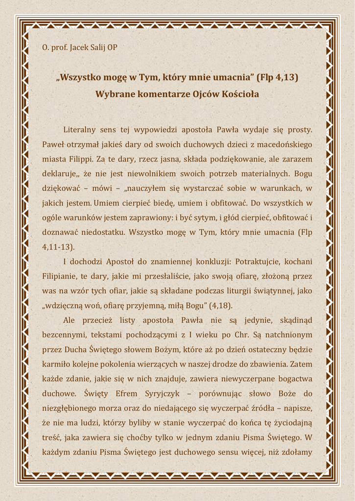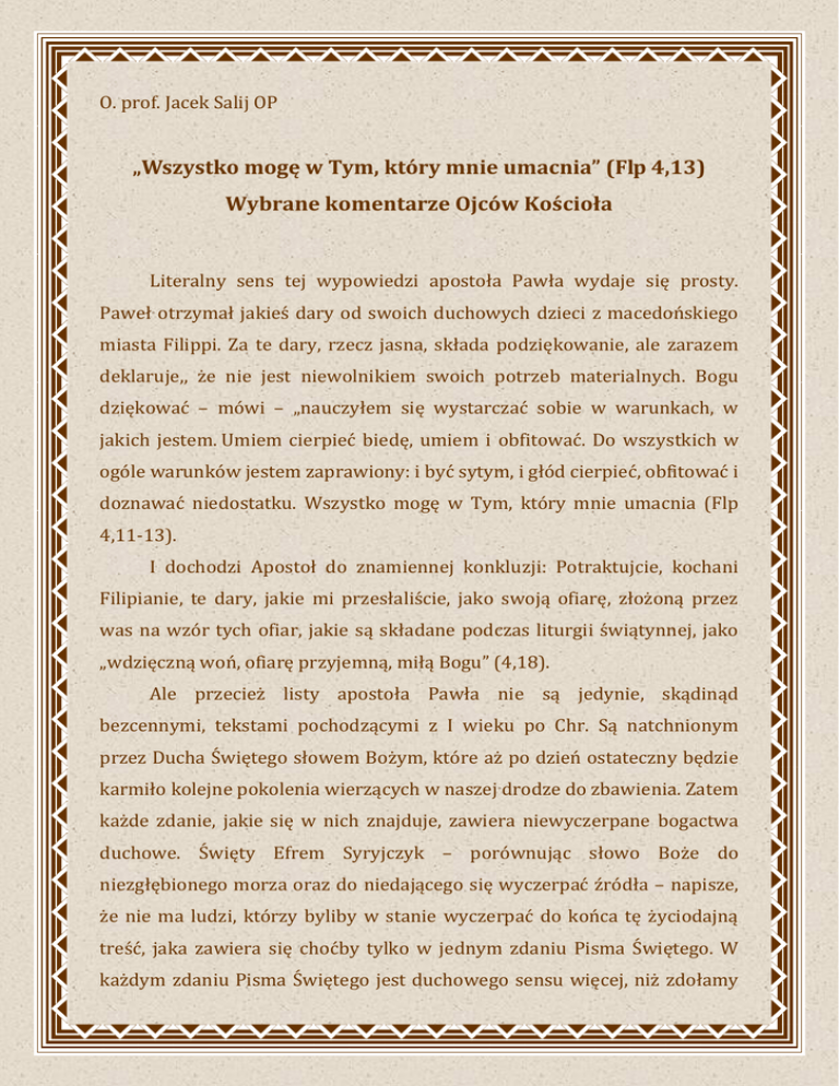 1 O. prof. Jacek Salij OP „Wszystko mogę w Tym, który mnie umacnia” (Flp 4,13) Wybrane komentarze Ojców Kościoła Literalny sens tej wypowiedzi apostoła Pawła wydaje się prosty. Paweł otrzymał jakieś dary od swoich duchowych dzieci z macedońskiego miasta Filippi. Za te dary, rzecz jasna, składa podziękowanie, ale zarazem deklaruje,, że nie jest niewolnikiem swoich potrzeb materialnych. Bogu dziękować – mówi – „nauczyłem się wystarczać sobie w warunkach, w jakich jestem. Umiem cierpieć biedę, umiem i obfitować. Do wszystkich w ogóle warunków jestem zaprawiony: i być sytym, i głód cierpieć, obfitować i doznawać niedostatku. Wszystko mogę w Tym, który mnie umacnia (Flp 4,11-13). I dochodzi Apostoł do znamiennej konkluzji: Potraktujcie, kochani Filipianie, te dary, jakie mi przesłaliście, jako swoją ofiarę, złożoną przez was na wzór tych ofiar, jakie są składane podczas liturgii świątynnej, jako „wdzięczną woń, ofiarę przyjemną, miłą Bogu” (4,18). Ale przecież listy apostoła Pawła nie są jedynie, skądinąd bezcennymi, tekstami pochodzącymi z I wieku po Chr. Są natchnionym przez Ducha Świętego słowem Bożym, które aż po dzień ostateczny będzie karmiło kolejne pokolenia wierzących w naszej drodze do zbawienia. Zatem każde zdanie, jakie się w nich znajduje, zawiera niewyczerpane bogactwa duchowe. Święty Efrem Syryjczyk – porównując słowo Boże do niezgłębionego morza oraz do niedającego się wyczerpać źródła – napisze, że nie ma ludzi, którzy byliby w stanie wyczerpać do końca tę życiodajną treść, jaka zawiera się choćby tylko w jednym zdaniu Pisma Świętego. W każdym zdaniu Pisma Świętego jest duchowego sensu więcej, niż zdołamy 2 w nim poznać. Jest bowiem ono dane wszystkim ludziom i wszystkim pokoleniom aż do wypełnienia dziejów. Wypowiedź św. Efrema zasługuje na to, żeby ją przytoczyć w nieco większych fragmentach: „Jeśli ktokolwiek potrafił pojąć cząstkę owych bogactw, niechaj nie sądzi, iż w Bożym słowie znajduje się tylko to, co sam znalazł, ale niech wie, iż spośród wielu skarbów, to jedynie udało mu się zobaczyć... Raduj się przeto nasyceniem, a nie smuć się, iż obfitość słowa przerasta twe pragnienie. Kto pragnie, ten pije z radością i nie smuci się, że nie potrafi wypić źródła. Niechaj raczej źródło przewyższa twoje pragnienie, niżby pragnienie miało wyczerpać źródło. Jeśli ugasisz pragnienie nie wyczerpując źródła, możesz zeń pić ponownie, gdy tylko zapragniesz... Dziękuj więc za to, co otrzymałeś, i nie smuć się z powodu obfitości tego, co pozostało. To, co osiągnąłeś i zabrałeś, jest już twoją własnością, a to, co zostało, również czeka na ciebie. To, czego nie mogłeś z powodu słabości otrzymać natychmiast, otrzymasz później, jeżeli wytrwasz. Nie chciej nierozważnie od razu zrozumieć to, czego w ten sposób pojąć się nie da, ani też nie odstępuj w swoim lenistwie od tego, co jedynie pomału można osiągnąć”1. W ciągu prawie dwóch tysięcy lat, odkąd listy apostoła Pawła zostały darowane Kościołowi, to zdanie „Wszystko mogę w Tym, który mnie umacnia” przemówiło słowem Bożym do milionów ludzkich serc. Zachował się dosłownie bezlik świadectw zgłębiania tego zdania w duchu wiary. W krótkim odczycie nawet w przybliżeniu nie da się tego pokazać, zresztą w tej chwili nawet bym tego nie potrafił. Mam cel bardziej skromny. Chciałbym dać małe konkretne potwierdzenie, że św. Efrem miał rację, bo każde zdanie Pisma Świętego naprawdę zawiera treść niewyczerpalną i Jest to fragment komentarza do Diatessaronu, 1,19, czytany podczas Liturgii Godzin w 6. Niedzielę Zwykłą. 1 3 zawsze znajduje się w nim jej niewyobrażalnie więcej, niż dotąd w niej znaleźliśmy. Argument chrystologiczny przeciwko doketyzmowi Zacznijmy od przypatrzenia się niezmiernie interesującemu fragmentowi listu św. Ignacego do Smyrneńczyków. Jest to chronologicznie pierwsze z zachowanych świadectw sięgnięcia w wykładzie wiary po słowa „Wszystko mogę w Tym, który mnie umacnia”. List do Smyrneńczyków, podobnie jak pozostałe listy św. Ignacego, został napisany w roku ok. 108. Ignacy jest już skazany na śmierć męczeńską, mianowicie ma zostać rzucony na pożarcie dzikim zwierzętom. Przerażają go jednak nie lwy, które go rozszarpią, ale „drapieżne zwierzęta w postaci ludzkiej”, które zagrażają wspólnotom chrześcijańskim. Ignacy ma na myśli doketów, którzy przyjmując dobrą nowinę o Jezusie Chrystusie, sądzili, że człowieczeństwo przyjął On pozornie i nie był prawdziwie jednym z nas. Przed doketami jako wielkim zagrożeniem pierwszego Kościoła przestrzegał w niezwykle ostrych słowach już apostoł Jan: „Wielu bowiem pojawiło się na świecie zwodzicieli, którzy nie uznają, że Jezus Chrystus przyszedł w ciele ludzkim; taki jest zwodzicielem i Antychrystem” (2 J 7; por. 1 J 4,2-3). Otóż Ignacy podpowiada Smyrneńczykom, żeby przyjęli Jego męczeństwo jako dowód, że Chrystus Pan jest prawdziwym człowiekiem. Jego męczeństwo nie będzie przecież czymś pozornym, on naprawdę będzie rozszarpany przez lwy. Podobnie i Chrystus, który będzie go w męczeństwie umacniał, będzie umacniał nie pozornie, ale prawdziwie, bo On jest prawdziwym człowiekiem, a nie pozornym. W tej perspektywie biskup Ignacy swoje męczeństwo traktuje jako świadectwo bliskości Boga, a dzikie zwierzęta, wśród których się znajdzie na arenie, odbiera jako znak odzyskiwania raju. Aż trudno uwierzyć, że 4 sędziwy biskup naprawdę tak myślał, ale na dowód, że nie dokonuję jakiejś nadinterpretacji, przytoczę całą tę jego wypowiedź: „Przestrzegam was przed zwierzętami drapieżnymi w postaci ludzkiej, których nie powinniście nie tylko podejmować, ale jeśli możliwe, nawet się z nimi nie sp