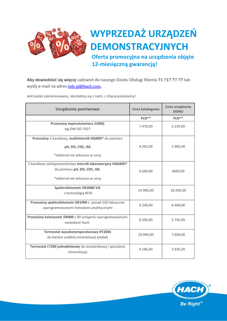 WYPRZEDAŻ URZĄDZEŃ DEMONSTRACYJNYCH Oferta promocyjna na urządzenia objęte 12-miesięczną gwarancją! Aby dowiedzieć się więcej zadzwoń do naszego Działu Obsługi Klienta 71 717 77 77 lub wyślij e-mail na adres [email protected]. Jeśli jesteś zainteresowany, skontaktuj się z nami, z chęcią pomożemy! Cena katalogowa Cena urządzenia DEMO PLN** PLN** 7.470,00 5.229,00 4.262,00 2.983,40 6.690,00 4683,00 Spektrofotometr DR3900 VIS z technologią RFID 14.900,00 10.430,00 Przenośny spektrofotometr DR1900 z ponad 220 fabrycznie zaprogramowanymi metodami analitycznymi 9.240,00 6.468,00 Przenośny kolorymetr DR900 z 90 wstępnie zaprogramowanymi metodami Hach. 8.200,00 5.740,00 Termostat wysokotemperaturowy HT200S do bardzo szybkiej mineralizacji próbek 10.940,00 7.658,00 Termostat LT200 jednoblokowy do standardowej i specjalnej mineralizacji 4.186,00 2.930,20 Urządzenie pomiarowe Przenośny mętnościomierz 2100Q wg DIN ISO 7027 Przenośny 2-kanałowy, multimiernik HQ40D* do pomiaru pH, DO, CDC, ISE; *elektrod nie wliczono w cenę 2-kanałowy wieloparametrowy miernik laboratoryjny HQ440D* do pomiaru pH, DO, CDC, ISE; *elektrod nie wliczono w cenę Multimiernik analiz równoległych SL1000 do jednoczesnej analizy nawet 6 próbek 12.990,00 9872,40 Spektrofotometr DR6000 UV-VIS z technologią RFID 31.240,00 23.117,60 **do podanych cen należy doliczyć podatek VAT. Szukasz przyrządu, którego nie ma na tej liście? Zadzwoń do nas! Należy pamiętać, że są to pojedyncze przyrządy pochodzące z naszej bazy urządzeń używanych podczas prezentacji u Klientów oraz podczas targów. Niektóre urzadzenia są dostępne tylko w wybranych konfiguracjach. Oferta obowiązuje do wyczerpania zapasów. Zamówienia należy złożyć do 16 grudnia 2016 roku. Przy składaniu zamówienia należy powołać się na promocyjny kod oferty TT1640. Niniejsza oferta specjalna nie łączy się z innymi promocjami lub rabatami. HACH LANGE Sp. z. o.o. Tel. 71 717 77 77 | [email protected] | www.pl.hach.com