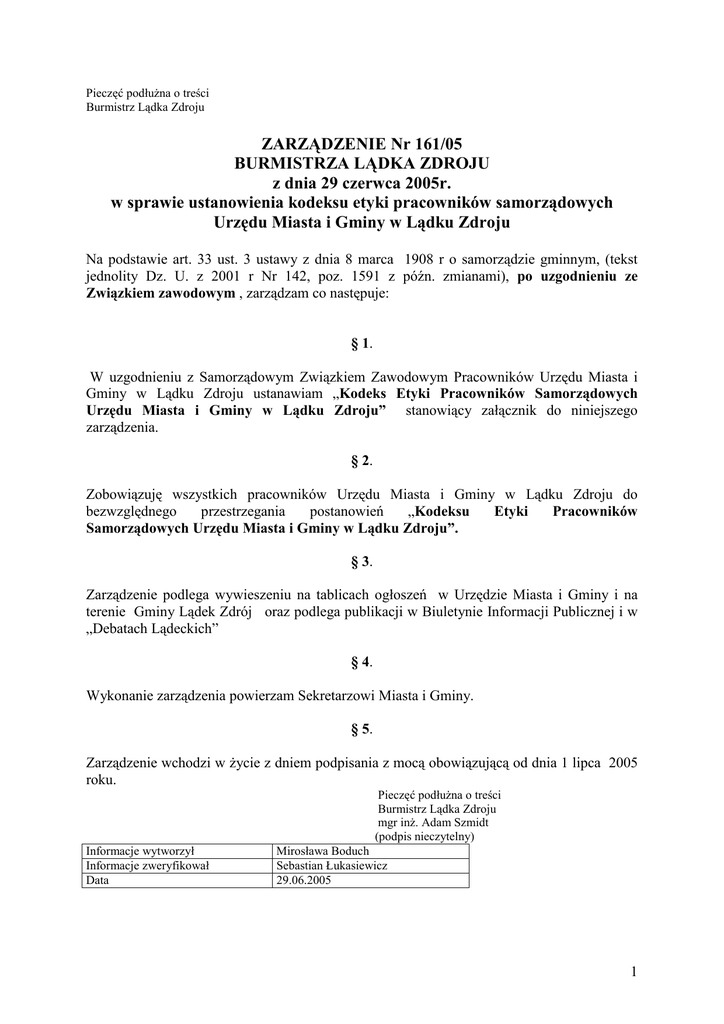 Pieczęć podłużna o treści Burmistrz Lądka Zdroju ZARZĄDZENIE Nr 161/05 BURMISTRZA LĄDKA ZDROJU z dnia 29 czerwca 2005r. w sprawie ustanowienia kodeksu etyki pracowników samorządowych Urzędu Miasta i Gminy w Lądku Zdroju Na podstawie art. 33 ust. 3 ustawy z dnia 8 marca 1908 r o samorządzie gminnym, (tekst jednolity Dz. U. z 2001 r Nr 142, poz. 1591 z późn. zmianami), po uzgodnieniu ze Związkiem zawodowym , zarządzam co następuje: § 1. W uzgodnieniu z Samorządowym Związkiem Zawodowym Pracowników Urzędu Miasta i Gminy w Lądku Zdroju ustanawiam „Kodeks Etyki Pracowników Samorządowych Urzędu Miasta i Gminy w Lądku Zdroju” stanowiący załącznik do niniejszego zarządzenia. § 2. Zobowiązuję wszystkich pracowników Urzędu Miasta i Gminy w Lądku Zdroju do przestrzegania postanowień „Kodeksu Etyki Pracowników bezwzględnego Samorządowych Urzędu Miasta i Gminy w Lądku Zdroju”. § 3. Zarządzenie podlega wywieszeniu na tablicach ogłoszeń w Urzędzie Miasta i Gminy i na terenie Gminy Lądek Zdrój oraz podlega publikacji w Biuletynie Informacji Publicznej i w „Debatach Lądeckich” § 4. Wykonanie zarządzenia powierzam Sekretarzowi Miasta i Gminy. § 5. Zarządzenie wchodzi w życie z dniem podpisania z mocą obowiązującą od dnia 1 lipca 2005 roku. Pieczęć podłużna o treści Burmistrz Lądka Zdroju mgr inż. Adam Szmidt (podpis nieczytelny) Informacje wytworzył Informacje zweryfikował Data Mirosława Boduch Sebastian Łukasiewicz 29.06.2005 1 Załącznik do Zarządzenia Nr 161/05 Burmistrza Lądka Zdroju z dnia 29 czerwca 2005r. KODEKS ETYKI PRACOWNIKÓW SAMORZĄDOWYCH URZĘDU MIASTA I GMINY W LĄDKU ZDROJU Celem Kodeksu Etyki Pracowników Samorządowych Urzędu Miasta i Gminy w Lądku Zdroju , zwanego dalej „Kodeksem”, jest sprecyzowanie wartości i standardów zachowania pracowników samorządowych, związanych z pełnieniem przez nich obowiązków, zebranie ich w postaci katalogu oraz poinformowanie obywateli o standardach zachowania, jakich mają prawo oczekiwać od pracowników samorządowych Urzędu Miasta i Gminy w Lądku Zdroju. ZASADY OGÓLNE §1 1. 2. 3. 4. 5. Kodeks wyznacza zasady (standardy) postępowania pracowników samorządowych Urzędu Miasta i Gminy w Lądku Zdroju związanych z wykonywaniem przez nich zadań publicznych w związku z pełnieniem służby publicznej. Zasady określone w niniejszym kodeksie winny być stosowane przez wszystkich pracowników posiadających status pracownika samorządowego, o których mowa w art. 1 ustawy z dnia 22 marca 1990 r. o pracownikach samorządowych (tekst jednolity z 2001 r. Dz. U. Nr 142, poz. 1593 z póź. zm.). Pracownicy samorządowi traktują pracę jako służbę publiczną, na zajmowanych stanowiskach służą państwu i społeczności lokalnej, przestrzegają porządku prawnego i wykonują rzetelnie powierzone zadania. Pracownicy samorządowi obowiązani są przestrzegać norm prawnych, etycznych i moralnych, w tym zawartych w niniejszym Kodeksie. Normy niniejszego Kodeksu naruszają pracownicy samorządowi, którzy wskutek postępowania, zarówno w miejscu pracy, jak i poza nim, ryzykują utratę zaufania niezbędnego do wykonywania zadań publicznych. ZASADY POSTĘPOWANIA §2 1. Pracownicy samorządowi pełniący służbę publiczną zobowiązani są dbać o wykonywanie zadań publicznych oraz o środki publiczne z uwzględnieniem interesu państwa, interesu wspólnoty samorządowej oraz indywidualnego interesu obywateli. 2. W szczególności pracownicy samorządowi powinni przestrzegać i działać zgodnie z zasadami: 1) praworządności, 2) bezstronności 2 3) bezinteresowności, 4) obiektywizmu, 5) uczciwości i rzetelności, 6) odpowiedzialności, 7) jawności, 8) dbałości o dobre imię urzędu i pracowników samorządowych, 9) godnego zachowania w miejscu pracy i poza nim, 10) uprzejmości i życzliwości w kontaktach z obywatelami, zwierzchnikami, radnymi, podwładnymi i współpracownikami. WYKONYWANIE ZADAŃ §3 1. Służba publiczna opiera się na zaufaniu publicznym i wymaga od pracowników samorządowych poszanowania Konstytucji i prawa oraz stawiania interesu publicznego ponad interes osobisty. Obywatele oczekują od pracowników samorządowych wysokich standardów etycznych zachowań. 2. Pracownicy samorządowi pełnią urząd w ramach prawa i działają zgodnie z prawem; podejmowane przez nich rozstrzygnięcia i decyzje posiadają podstawę prawną, ich treść jest zgodna z obowiązującymi przepisami prawa, zawierają uzasadnienie oraz informację o możliwości złożenia odwołania. 3. W toku podejmowania decyzji pracownicy samorządowi uwzględniają wszystkie istotne czynniki i przypisują każdemu z nich należne mu znaczenie, nie uwzględniają żadnych okoliczności nie należących do sprawy. 4. Pracownicy samorządowi załatwiają sprawy niezwłocznie, zgodnie z przepisami określającymi terminy załatwiania spraw. 5. Pracownicy samorządowi reprezentują konstruktywną, twórczą i praktyczną postawę wobec spraw samorządu terytorialnego, oraz przejawiają głębokie poczucie odpowiedzialności społecznej, właściwej dla godnego zaufania pracownika służby publicznej. §4 1. Pracownicy samorządowi działają bezstronnie i bezinteresownie. 2. Pracownicy samorządowi nie uczestniczą w podejmowaniu decyzji, naradach, opiniowaniu lub głosowaniu w sprawach, w których mają bezpośredni lub pośredni interes osobisty. 3. Pracownicy samorządowi nie wykorzystują i nie pozwalają na wykorzystanie powierzonych im zasobów, kadr i mienia publicznego w celach prywatnych. W szczególności pracownicy samorządowi przeznaczają czas pracy na wykonywanie czynności zawodowych. 4. Pracownicy samorządowi nie podejmują prac, ani zajęć kolidujących z pełnionymi obowiązkami służbowymi. 5. Pracownicy samorządowi nie podejmują arbitralnych decyzji, które mogą mieć negatywny wpływ na sytuację obywateli oraz powstrzymują się od wsze
