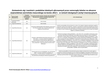 Zestawienie ulg i zwolnień z podatków lokalnych oferowanych przez samorządy lokalne na obszarze województwa warmińsko-mazurskiego na koniec 2012 r. w ramach dostępnych zachęt inwestycyjnych. lp. Nazwa Urzędu Miasta/Gminy Czy gmina odpowiedziała na zapytanie WMCOI? Czy gmina posiada stosowną uchwałę rady miasta/gminy dotyczącą ulg i zwolnień z podatków lokalnych dla przedsiębiorców? treść uchwały/uwagi 1 Urząd Gminy Banie Mazurskie tak brak uchwały 2 Urząd Gminy Barciany tak brak uchwały tak Uchwała Nr XXXVII(227)2013 Rady Miejskiej w Barczewie z dn. 28 stycznia 2013 roku w sprawie zwolnienia od podatku od nieruchomości Zwalnia się od podatku od nieruchomości na okres 2 lat, budynki i budowle wybudowane zgodnie z przepisami ustawy Prawo budowlane, związane z prowadzeniem działalności gospodarczej, których budowa została zakończona albo rozpoczęto ich użytkowanie przed ich ostatecznym wykończeniem, po wejściu w życie niniejszej uchwały. Zwolnienie nie dotyczy budynków lub ich części oraz budowli zajętych na działalność handlową. tak Uchwała nr XXII/150/2012 Rady Miasta Bartoszyce z dn. 28.11.2012 r. w sprawie zwolnień od podatku od nieruchomości w ramach pomocy regionalnej na wspieranie nowych inwestycji i tworzenie nowych miejsc pracy związanych z nową inwestycją na terenie miasta Bartoszyce Zwolnienie przysługuje mikroprzedsiębiorcy - przez okres 2 lat, w przypadku zrealizowania nowej inwestycji, której koszty kwalifikujące się do objęcia pomocą wyniosą nie mniej niż 200.000 zł i utworzenia 2 nowych miejsc pracy związanych z nową inwestycją. Małemu przedsiębiorcy - przez okres 3 lat, w przypadku zrealizowania nowej inwestycji, której koszty kwalifikujące się do objęcia pomocą wyniosą nie mniej niż 600.000 zł i utworzenia 8 nowych miejsc pracy związanych z nową inwestycją. Średniemu przedsiębiorcy - przez okres 4 lat, w przypadku zrealizowania nowej inwestycji, której koszty kwalifikujące się do objęcia pomocą wyniosą nie mniej niż 3.000.000 zł i utworzenia 15 nowych miejsc pracy związanych z nową inwestycją. Przedsiębiorcy innemu niż mikroprzedsiębiorca, mały przedsiębiorca i średni przedsiębiorca - przez okres 5 lat, w przypadku zrealizowania nowej inwestycji, której koszty kwalifikujące się do objęcia pomocą wyniosą nie mniej niż 10.000.000 zł i utworzenia 30 nowych miejsc pracy związanych z nową inwestycją w rozumieniu Rozporządzenia Komisji (WE) nr 70/2001 z dnia 12 stycznia 2001 r. tak Uchwała Rady Gminy Nr XVI/99/2007 z dnia 28 listopada 2007 r. w sprawie zwolnienia od podatku od nieruchomości w ramach pomocy o charakterze de minimis dla podmiotów prowadzących działalność gospodarczą. Zwalnia się od podatku od nieruchomości grunty, budynki, budowle lub ich części zajęte na prowadzenie działalności gospodarczej przez podmioty podlegające obowiązkowi podatkowemu w podatku od nieruchomości podejmujące po raz pierwszy działalność gospodarczą na terenie Gminy Bartoszyce pod warunkiem utworzenia nowych miejsc pracy i utrzymania tego zatrudnienia przez okres zwolnienia podatkowego. 3 4 5 Urząd Miasta Barczewo Urząd Miasta Bartoszyce Urząd Gminy Bartoszyce 1 Portal Inwestycyjny Warmii i Mazur www.InvestInWarmiaAndMazury.pl 6 Urząd Miasta i Gminy Biała Piska tak Uchwała Nr IX/92/11 Rady Miejskiej w Białej Piskiej z dnia 28 kwietnia 2011 r. w sprawie zwolnień przedmiotowych od podatku od nieruchomości na terenie Gminy Biała Piska w ramach pomocy regionalnej na wspieranie nowych inwestycji lub tworzenie nowych miejsc pracy związanych z nową inwestycją. Zwalnia się od podatku od nieruchomości grunty, budynki lub ich części oraz budowle lub ich części związane z prowadzeniem działalności gospodarczej, na których realizowano nową inwestycję lub utworzono nowe miejsca pracy w związku z realizacją nowej inwestycji. Uchwała Rady Miasta Nr XIII/89/07 z dnia 30 października 2007 r. w sprawie zwolnień od podatku od nieruchomości w ramach pomocy de minimis zmieniona Uchwałą Rady Miasta Nr XV/118/07 z dnia 28 grudnia 2007 r. Zwalnia się z podatku od nieruchomości budynki lub ich części, budowle i grunty, które są wykorzystywane do prowadzenia działalności gospodarczej przez przedsiębiorców podejmujących po raz pierwszy działalność na terenie Gminy Biskupiec oraz budynki lub ich części, budowle i grunty, które są wykorzystywane do prowadzenia działalności gospodarczej na zwiększenie istniejącego stanu zatrudnienia na terenie Gminy Biskupiec. 7 Urząd Miasta Biskupiec tak 8 Urząd Gminy Biskupiec nie 9 Urząd Gminy i Miasta Bisztynek tak 10 Urząd Miasta Braniewo tak do momentu zamknięcia prac nad niniejszym zestawieniem z Urzędu Gminy nie otrzymano informacji w przedmiotowej sprawie Uchwała Nr XXVII/128/05 Rady Miejskiej w Bisztynku z dnia 8 grudnia 2005 r. w sprawie zwolnień od podatku od nieruchomości Zwolnienie od podatku od nieruchomości w związku z uruchomieniem nowej działalności gospodarczej przez osoby będące bezrobotnymi, którzy bezpośrednio przed podjęciem tej działalności byli zarejestrowani w Powiatowym Urzędzie Pracy. Uchwała nr XVII/112/08 Rady Miejskiej w Braniewie z dnia 30 kwietnia 2008 r. w sprawie udzielenia przedsiębiorcom zwolnień od podatku od nieruchomości, stanowiących regionalną pomoc inwestycyjną na lata 2007-2013 Pomoc obejmuje związane z prowadzeniem działalności gospodarczej budynki lub ich części oraz budowle lub ich części stanowiące nowe inwestycje. Pomoc obejmuje swym działaniem przedsiębiorców inwestujących na terenie Gminy Miasta Braniewa. Wniosek o udzielenie wsparcia można złożyć od momentu wejścia w życie uchwały do dnia 31 grudnia 2013 roku. Pomoc udzielana jest na okres 3 lat. warunki otrzymania pomocy: 1) minimalna wysokość kosztów inwestycji wynosi 100 000,00 zł lub utworzono 3 nowe miejsca pracy związane z nową inwestycją, 2)