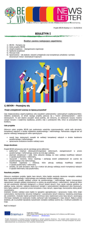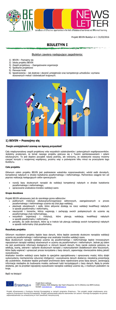 Projekt BEVIN Biuletyn nr 1 31/03/2016 BIULETYN I Biuletyn zawiera następujące zagadnienia: 1) 2) 3) 4) 5) 6) BEVIN – Poznajmy się Istota projektu BEVIN Zespół projektowy – Zaangażowane organizacje Spotkanie projektowe Pierwsze kroki Spostrzeżenia – Jak dostrzec i docenić umiejętności oraz kompetencje uchodźców: wymiana stosowanych metod i doświadczeń krajowych. 1) BEVIN – Poznajmy się Twoje umiejętności szansą na lepszą przyszłość Cały międzynarodowy zespół projektowy wita wszystkich subskrybentów i potencjalnych współpracowników. Jesteśmy przekonani, że temat naszego projektu pokrywa się z Twoimi zainteresowaniami i celami edukacyjnymi. To jest dopiero początek naszej podróży, ale wierzymy, że ostatecznie wszyscy możemy czerpać korzyści z wzajemnej współpracy, prosimy więc o poświęcenie kilku minut na przeczytanie tego biuletynu. Cele projektu Głównym celem projektu BEVIN jest podniesienie wskaźnika rozpoznawalności, wśród osób dorosłych, kompetencji nabytych w drodze kształcenia pozaformalnego i nieformalnego. Partnerstwo osiągnie ten cel poprzez realizację następujących celów operacyjnych: rozwój bazy skutecznych narzędzi do walidacji kompetencji nabytych w drodze kształcenia pozaformalnego i nieformalnego; opracowanie analizatora trendów walidacji szans Grupa docelowa Projekt BEVIN adresowany jest do szerokiego grona odbiorców: publicznych instytucji edukacyjnych/organizacji sektorowych, zaangażowanych w proces pozaformalnego i nieformalnego uczenia się i/lub jego walidacji, placówek oświatowych i osób, które aktywnie działają na rzecz walidacji kwalifikacji nabytych w sposób pozaformalny i nieformalny, nauczycieli i trenerów, którzy wspierają i zachęcają swoich podopiecznych do uczenia się pozaformalnego i/lub nieformalnego, wszystkich organizacji i instytucji, które planują walidację kwalifikacji nabytych w sposób pozaformalny i nieformalny. ponadto, do osób dorosłych, które są w trakcie lub planują walidację swoich kompetencji nabytych w sposób nieformalny i/lub pozaformalny. Rezultaty projektu Głównym rezultatem projektu będzie baza danych, która będzie zawierała skuteczne narzędzia walidacji uczenia się pozaformalnego i nieformalnego oraz analizator trendów walidacji szans. Baza skutecznych narzędzi walidacji uczenia się pozaformalnego i nieformalnego będzie innowacyjnym repozytorium narzędzi walidacji stosowanych w uczeniu się pozaformalnym i nieformalnym. Jednak jej celem nie jest powtórzenie informacji dostępnych w różnych bazach danych. Duży nacisk zostanie położony na selekcję, ocenę, zebranie i opisanie skutecznych narzędzi z wykorzystaniem dodatkowych słów kluczowych, które będą wspierać i upraszczać proces korzystania z bazy danych, zapewniając równocześnie dobrą jakość wyszukiwania. Analizator trendów walidacji szans będzie to specjalnie zaprojektowany i opracowany moduł, który dzięki wykorzystaniu mechanizmów sztucznej inteligencji i wyszukiwania danych dostarczy niezależną prezentację dla uczestników. Analizator będzie gromadził anonimowe dane rejestrowane przez bazę danych, zawierającą informacje niezbędne do budowania modelu zachowań ludzi korzystających z bazy danych. Będą to proste działania, jak na przykład najczęściej wyszukiwane narzędzia walidacji uczenia się, z możliwym podziałem na kraje. Bądź na bieżąco! Projekt Bevin realizują: CWEP (Polska), RUNI (Bułgaria), Sea Teach (Hiszpania), Vol.To (Włochy) oraz BEFO (Łotwa). Kontakt: www.bevin.eu [email protected] Projekt sfinansowany z funduszy Komisji Europejskiej w ramach programu Erasmus+. Ten projekt został zrealizowany przy wsparciu finansowym Komisji Europejskiej. Projekt odzwierciedla jedynie stanowisko ich autora i Komisja Europejska nie ponosi odpowiedzialności za umieszczoną w nich zawartość merytoryczną. 2) Istota projektu BEVIN Walidacja umiejętności nabytych pozaformalnego i nieformalnego: narzędzia w drodze kształcenia przekazanie ulepszonego W odniesieniu do wytycznych europejskich dotyczących walidacji uczenia się pozaformalnego i nieformalnego, zjawisko to zyskuje na znaczeniu w Europie. Kształcenie pozaformalne od formalnego odróżnia jedno zasadnicze kryterium. A mianowicie, w przypadku kształcenia formalnego osiągnięty wynik dydaktyczny można odnaleźć w krajowych ramach kwalifikacji. Według OECD – kształcenie nieformalne to świadoma i zorganizowana działalność kształcąco-wychowawcza prowadzona poza ustawowym formalnym systemem szkolnym, umożliwiająca określonej grupie uczestników osiągnięcie założonych celów kształcenia. Czytaj dalej… 3) Zespół projektowy – zaangażowane organizacje Doświadczenie i kompetencje w sektorze edukacji dorosłych Partnerzy zostali wybrani zgodnie z ich doświadczeniem jak również ze zwględu na ich lokalizację geograficzną oraz sieć kontaktów, dzięki którym możliwe jest szerokie rozprzestrzenienie informacji o rezultatach powstałych w projekcie. Konsorcjum skłąda się z 5 partnerów z 5 krajów UE. Wszyscy partnerzy zatrudniają grupę profesjonalistów z obszaru kształcenia pozaformalnego i nieformalnego oraz jego walidacji. CWEP (Polska), RUNI (Bułgaria), Sea Teach (Hiszpania), Vol.To (Włochy) and Stowarzyszenie "Biedrība Eurofortis" – BEFO (Łotwa). Czytaj dalej… 4) Spotkanie projektowe Zaczynamy! Pierwsze spotkanie partnerów w projekcie BEVIN – dataBase of Effective opportunities in the field of Validation of non-formal and Informal odbyło się w siedzibie koordynatora projektu, którym jest Stowarzyszenie „Centrum Wspierania Edukacji i Przedsiębiorczości” w Rzeszowie w dniach 9-10 grudnia 2015. Zobacz więcej zdjęć i czytaj dalej... 5) Pierwsze kroki Praca za pośrdenictwem bazy danych W ramach badań na potrzeby projektu BEVIN, dotyczących narzędzi skutecznej walidacji kształcenia nieformalnego i poza formalnego