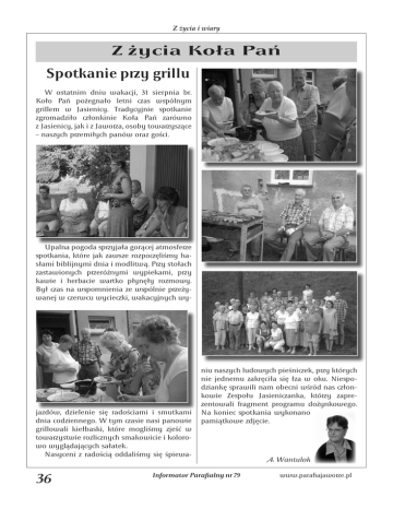 Z życia i wiary Z życia Koła Pań Spotkanie py grillu W ostatnim dniu wakacji, 31 sierpnia br. Koło Pań pożegnało letni as wólnym grillem w Jasienicy. Tradycyjnie otkanie zgromadziło łonkinie Koła Pań zarówno z Jasienicy, jak i z Jawoa, osoby towayszące – naszych pemiłych panów oraz gości. Upalna pogoda yjała gorącej atmosfee otkania, które jak zawsze rozpoęliśmy hasłami biblijnymi dnia i modlitwą. Py stołach zastawionych peróżnymi wypiekami, py kawie i herbacie wako płynęły rozmowy. Był as na womnienia ze wólnie peżywanej w erwcu wycieki, wakacyjnych wy- jazdów, dzielenie się radościami i smutkami dnia codziennego. W tym asie nasi panowie grillowali kiełbaski, które mogliśmy zjeść w towaystwie rozlinych smakowicie i kolorowo wyglądających sałatek. Nasyceni z radością oddaliśmy się śpiewa- 36 niu naszych ludowych pieśniek, py których nie jednemu zakręciła się łza w oku. Nieodziankę rawili nam obecni wśród nas łonkowie Zeołu Jasienianka, któy zaprezentowali fragment programu dożynkowego. Na koniec otkania wykonano pamiątkowe zdjęcie. Informator Paraalny nr 79 A. Wantulok www.parafiajawoe.pl